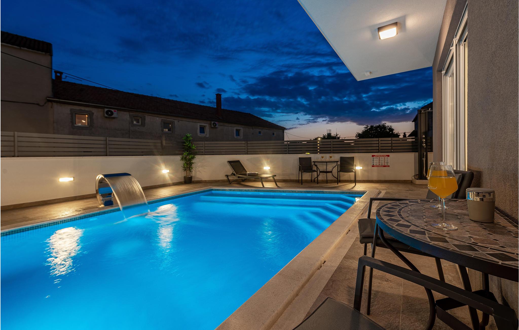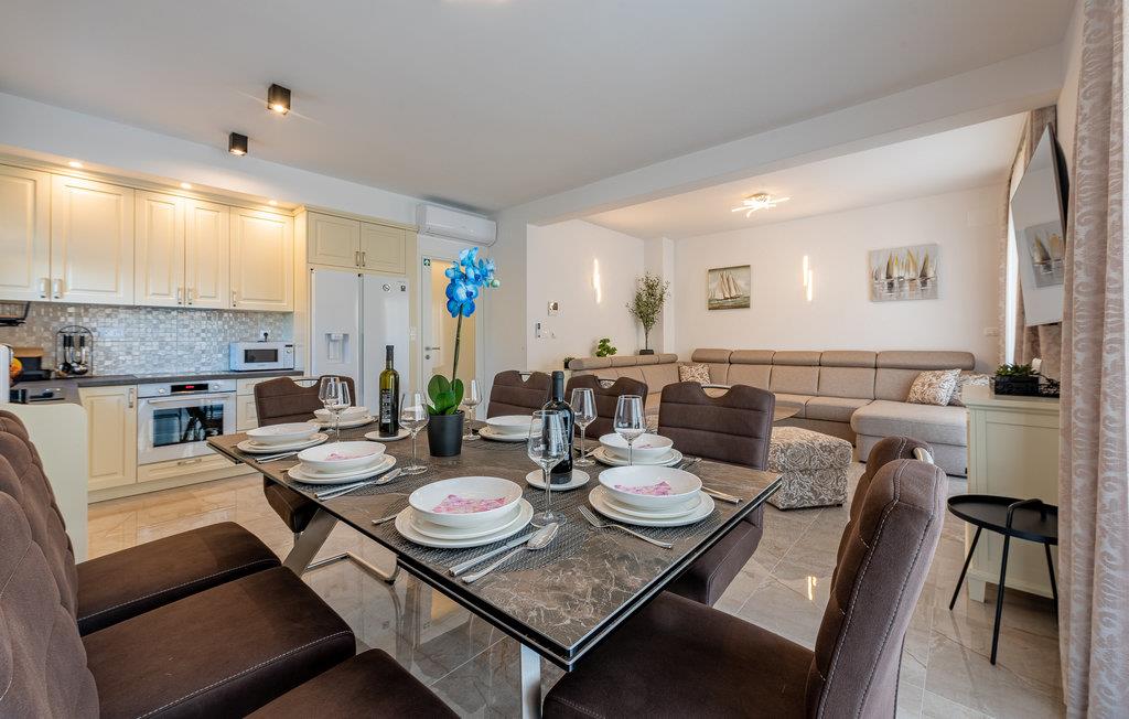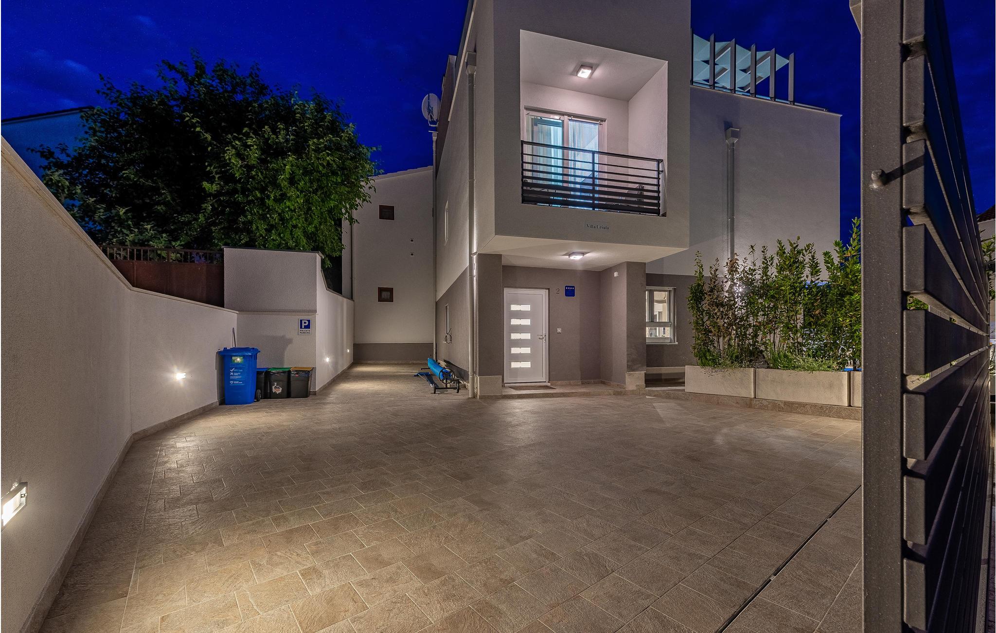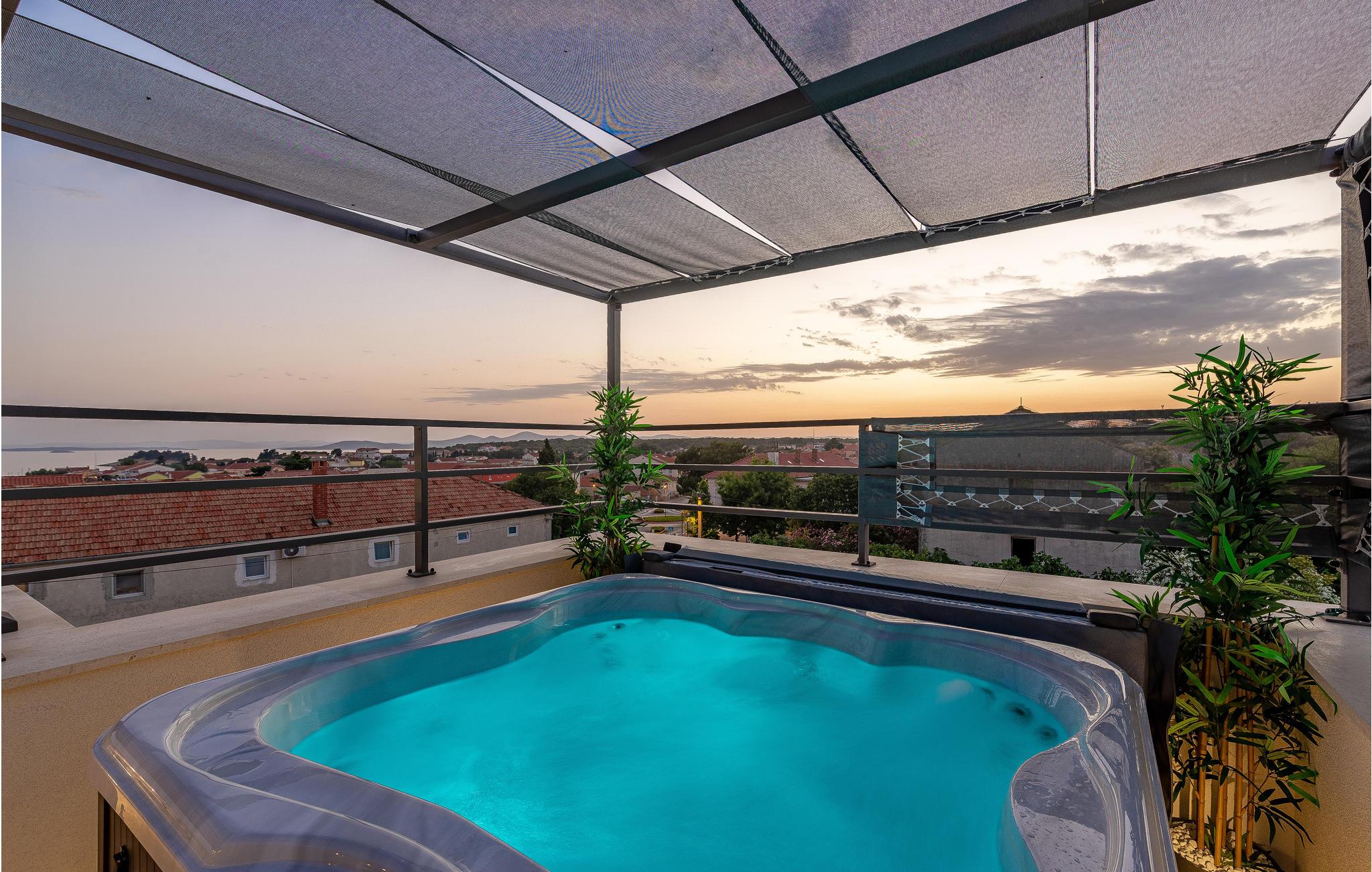 Dette store feriehus ligger i et roligt boligområde i nærheden af Zadar. Glæd jer til at slappe dejligt af i solen på den nydelige tagterrasse med en fantastisk udsigt. Udespa, pool og sauna indbyder til rendyrket feriewellness, og stilfuld indretning fuldender den fantastiske boligoplevelse.