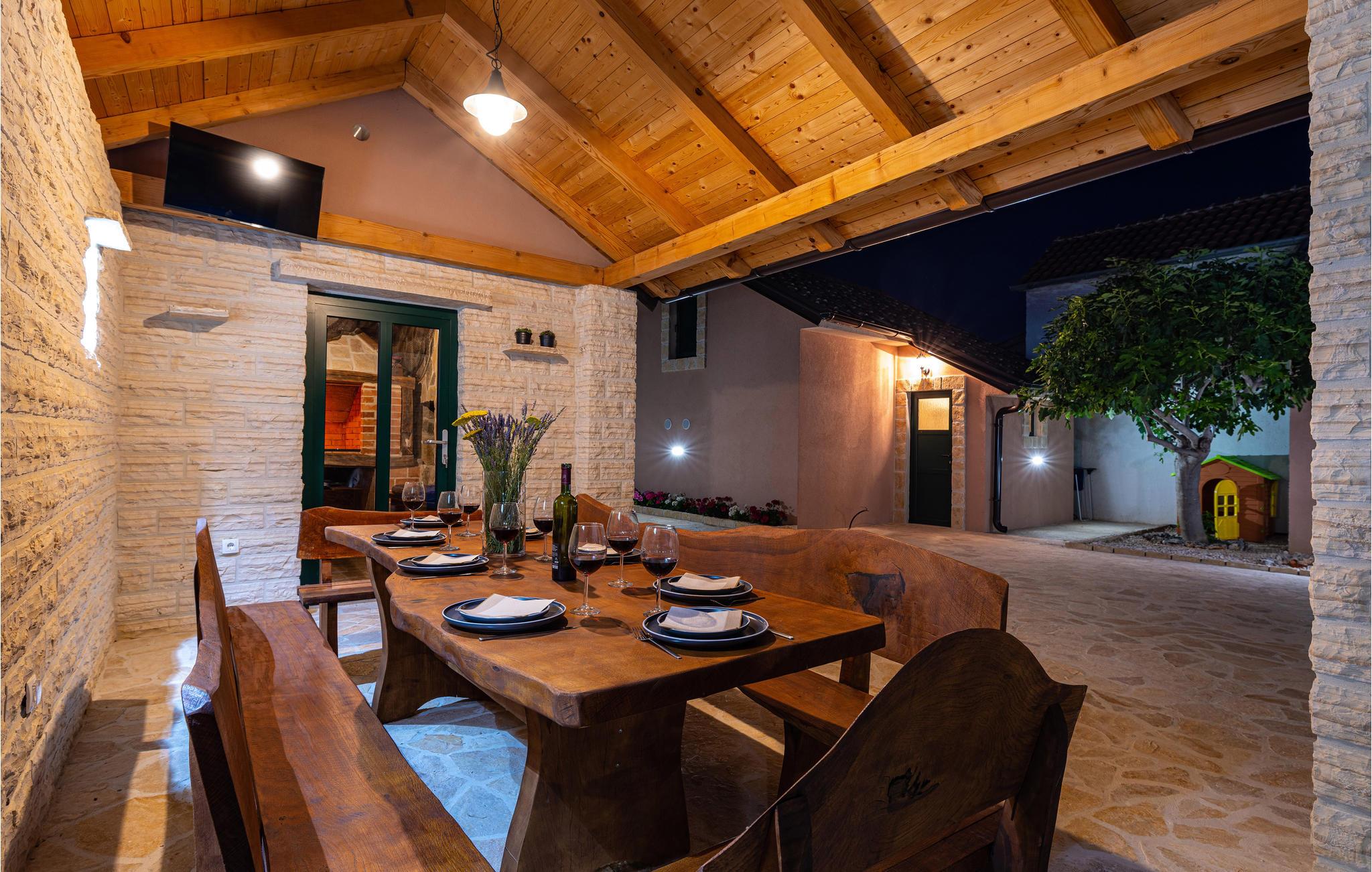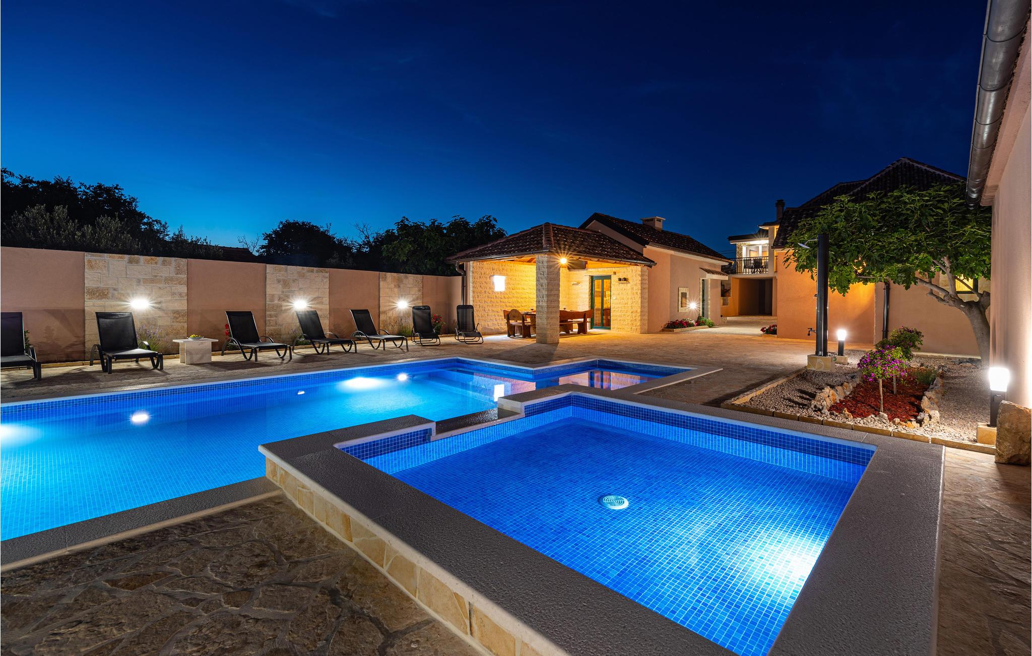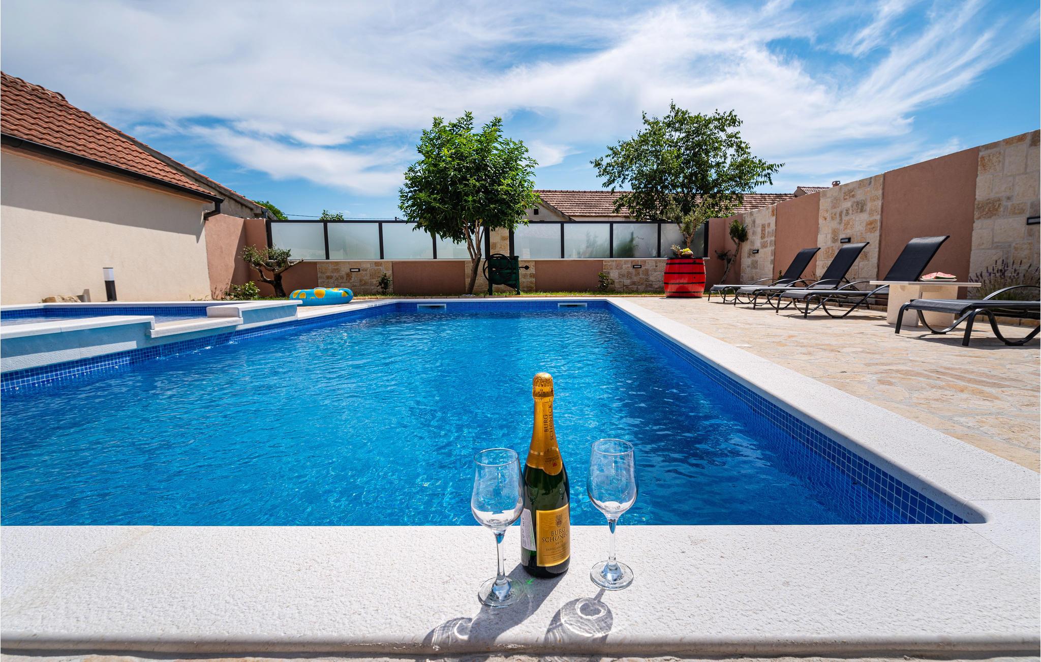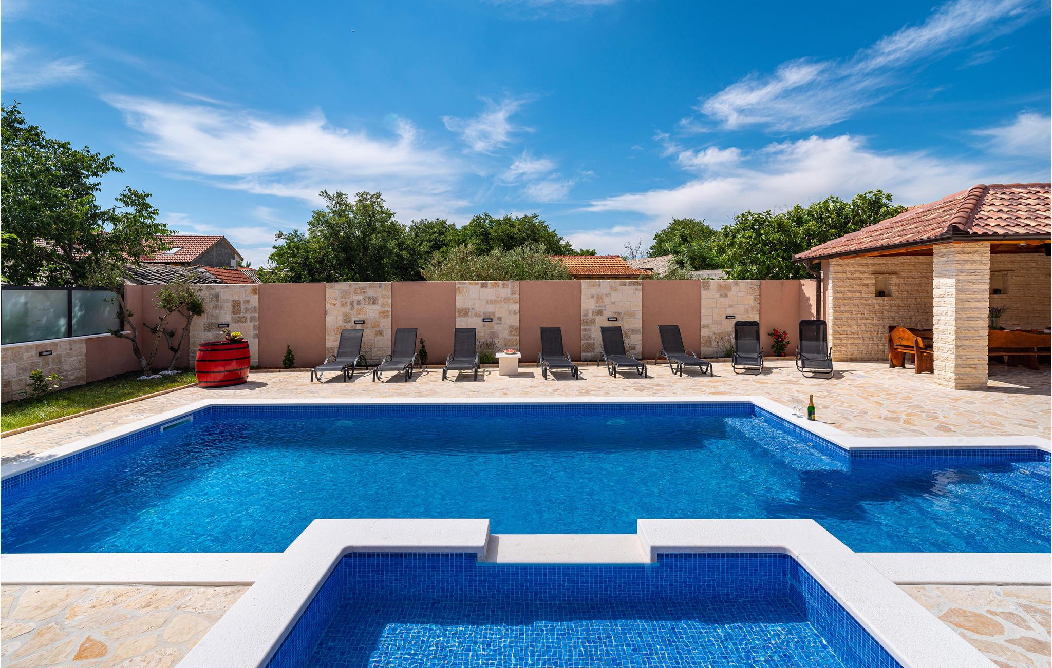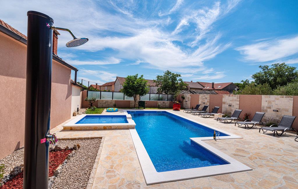 Hvis du elsker middelhavssolen, stilfuld hygge og hygge, er dette indbydende hus det rigtige valg for dig. Beliggende mellem Zadar og Sibenik i baglandet, byder dit feriehus dig velkommen med en harmonisk atmosfære. Frem for alt vil du elske området foran huset, som har en stor, opvarmet pool og grill med en smuk overdækket spiseplads.