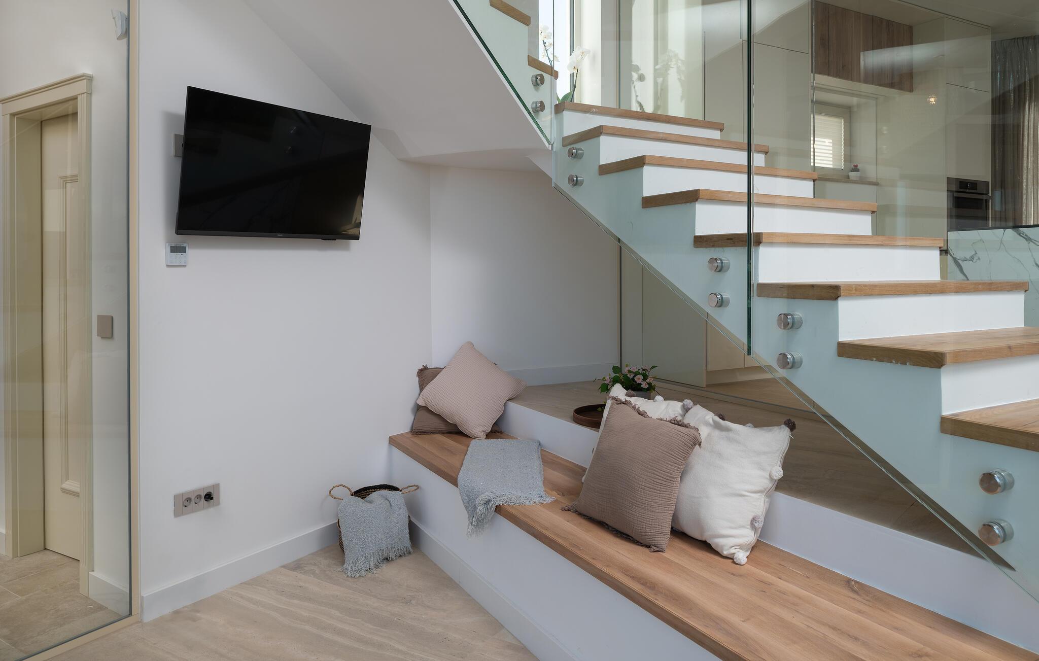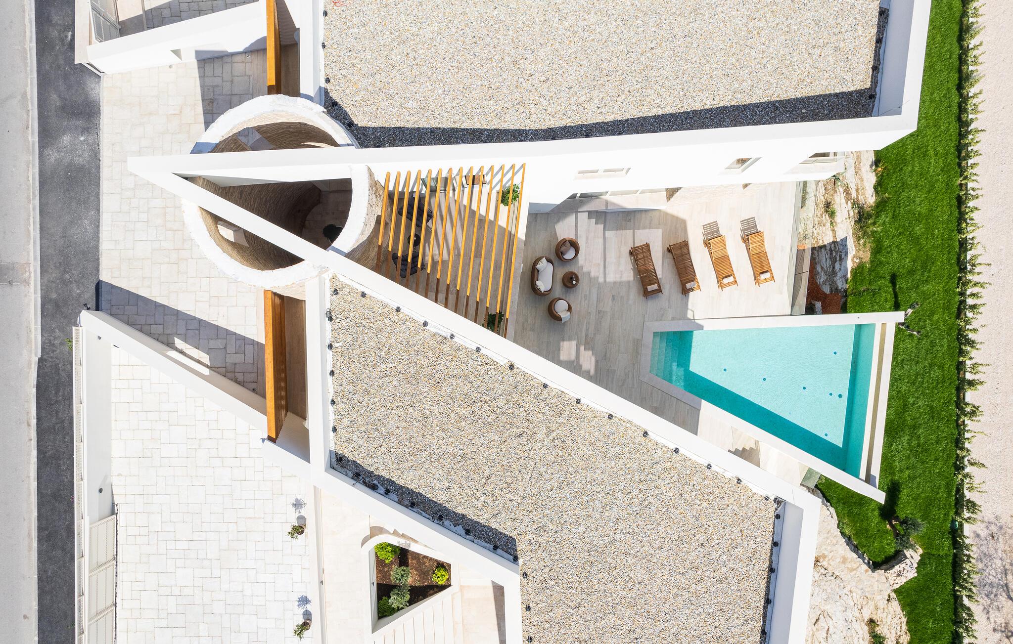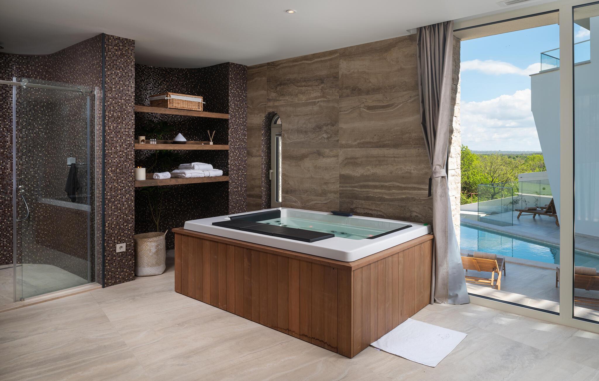 Dette moderne hus ligger i rolige omgivelser og byder jer velkommen med sin spændende arkitektur, der afspejler stilen fra de lokale kirker. Stilfulde designermøbler, natursten og varme trænuancer skaber en elegant, men indbydende atmosfære indenfor, der får jer til at føle jer hjemme. Det rummelige spa-område med sauna og spabad tilbyder den perfekte afslapning, og I kan nyde hyggelige aftener i villaens konoba (taverna).