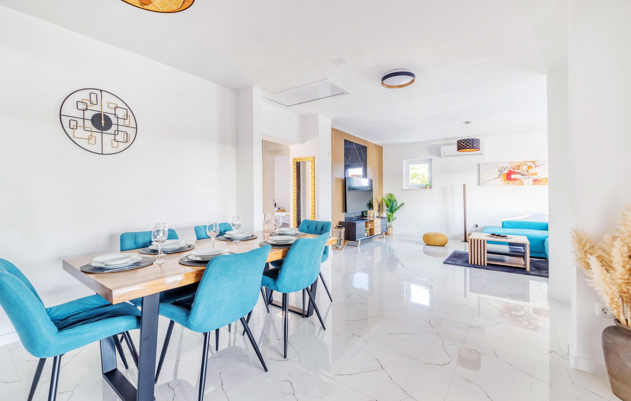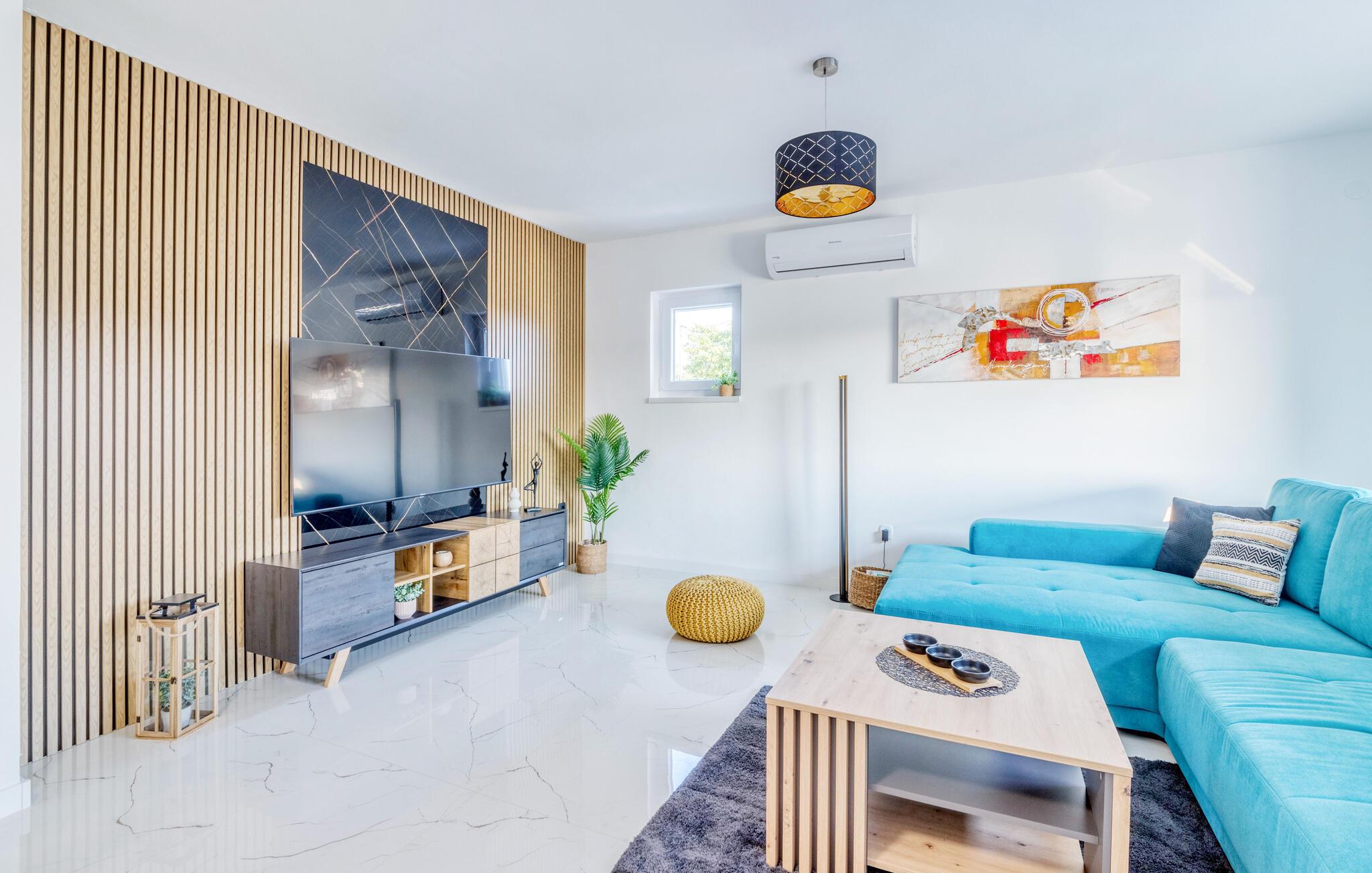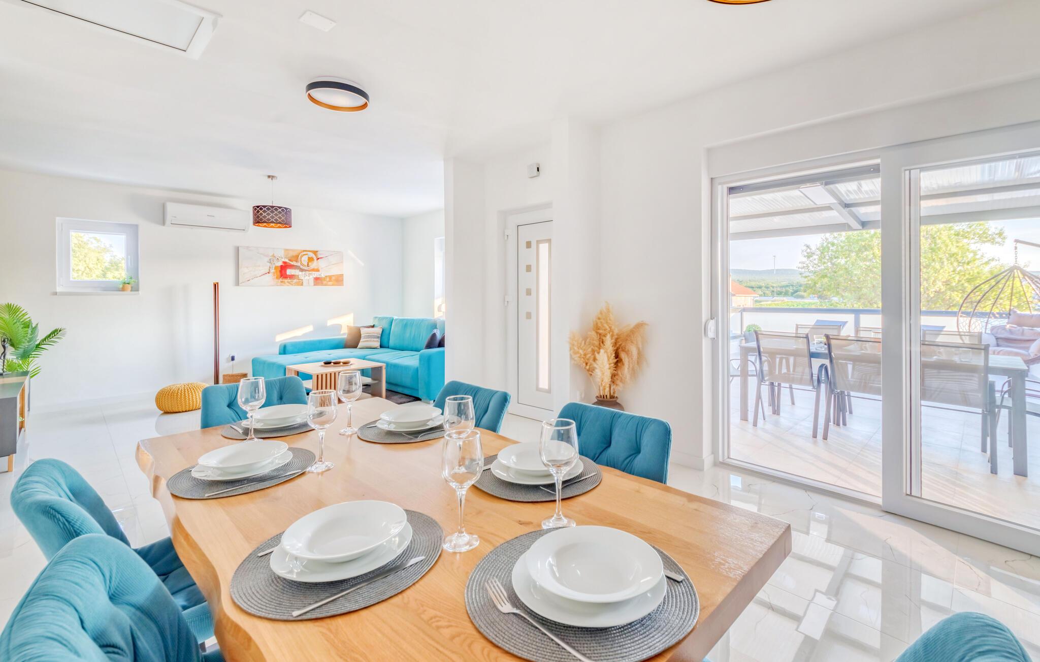 Dette indbydende hus forener stilren enkelhed med behagelig komfort. Store vinduer lader masser af lys strømme ind og skaber en venlig atmosfære, mens den farverige sofagruppe indbyder til afslapning og afkobling. Lyt til jeres yndlingsmusik, eller stream en serie, og slap helt af. I det moderne køkken tilbereder I lækre måltider, som passer perfekt sammen med et glas kroatisk vin.