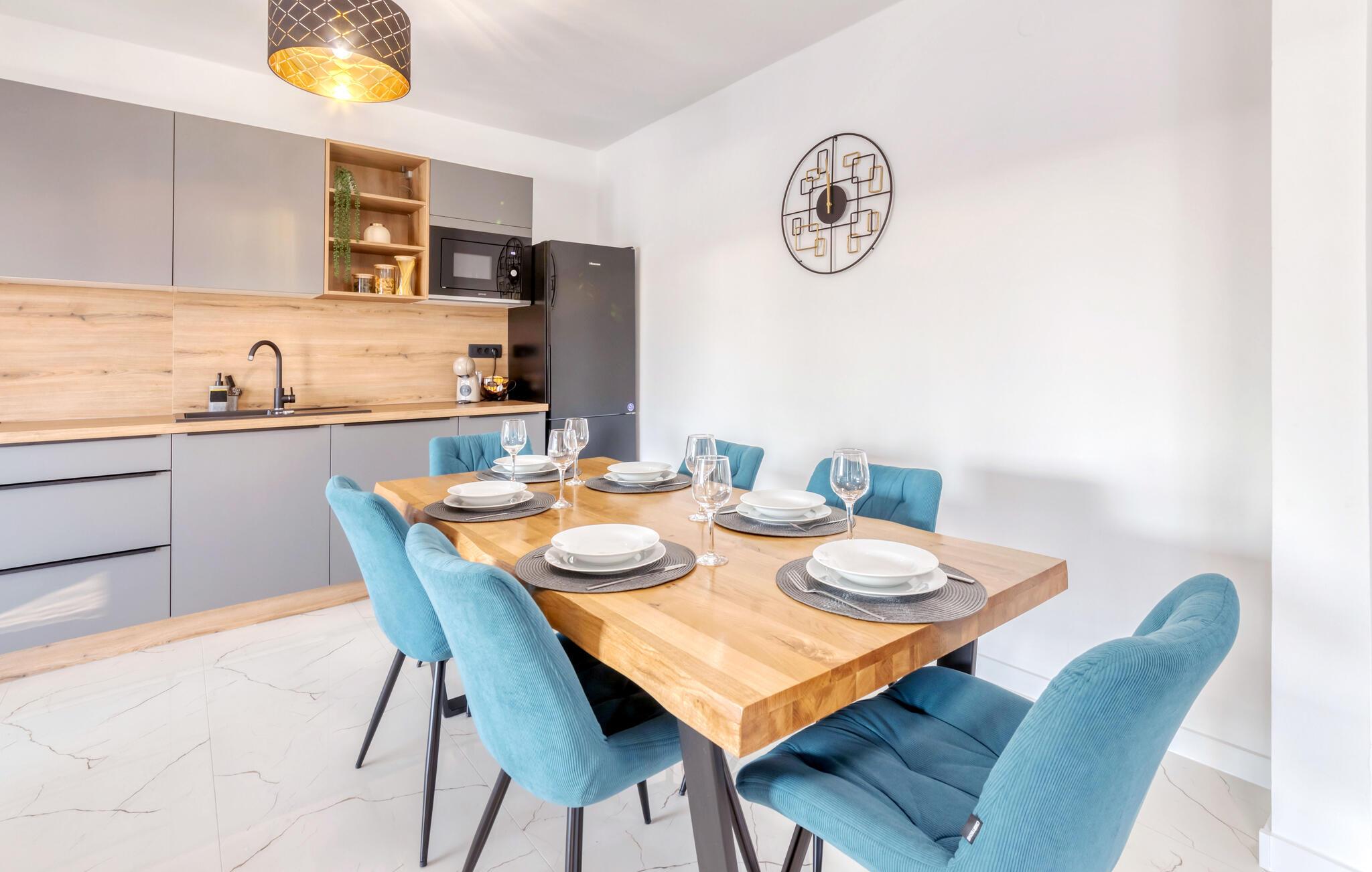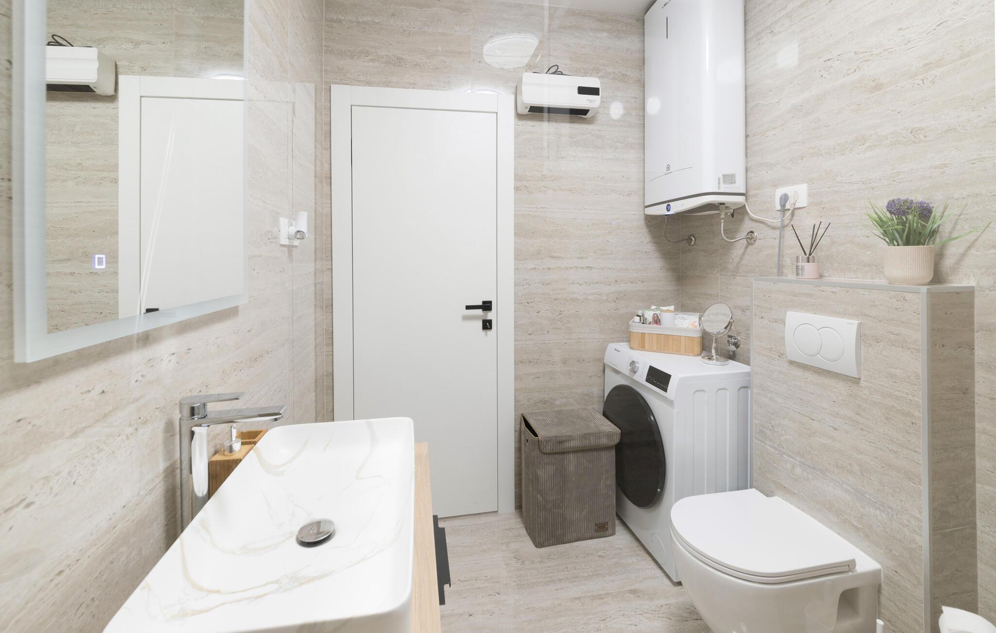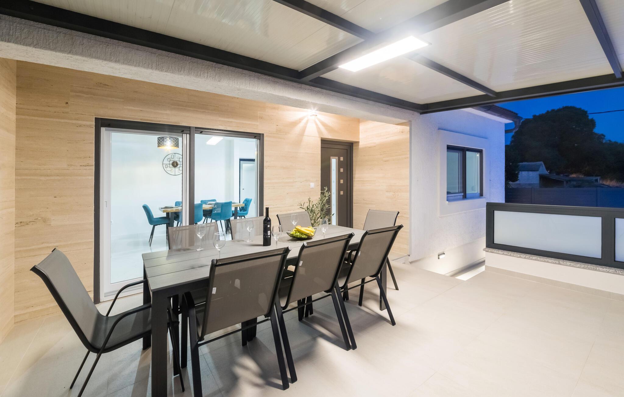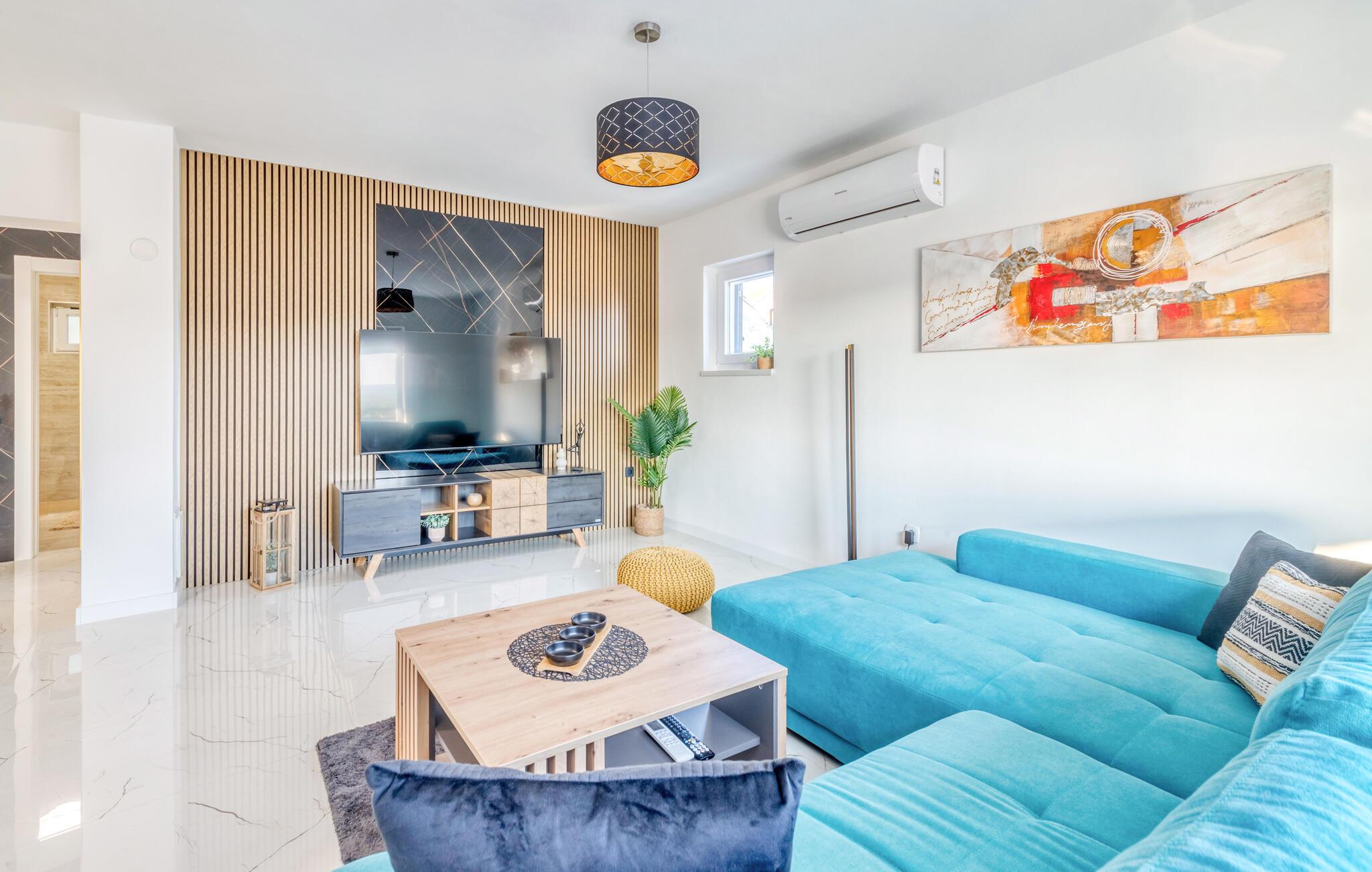 Dette indbydende hus forener stilren enkelhed med behagelig komfort. Store vinduer lader masser af lys strømme ind og skaber en venlig atmosfære, mens den farverige sofagruppe indbyder til afslapning og afkobling. Lyt til jeres yndlingsmusik, eller stream en serie, og slap helt af. I det moderne køkken tilbereder I lækre måltider, som passer perfekt sammen med et glas kroatisk vin.