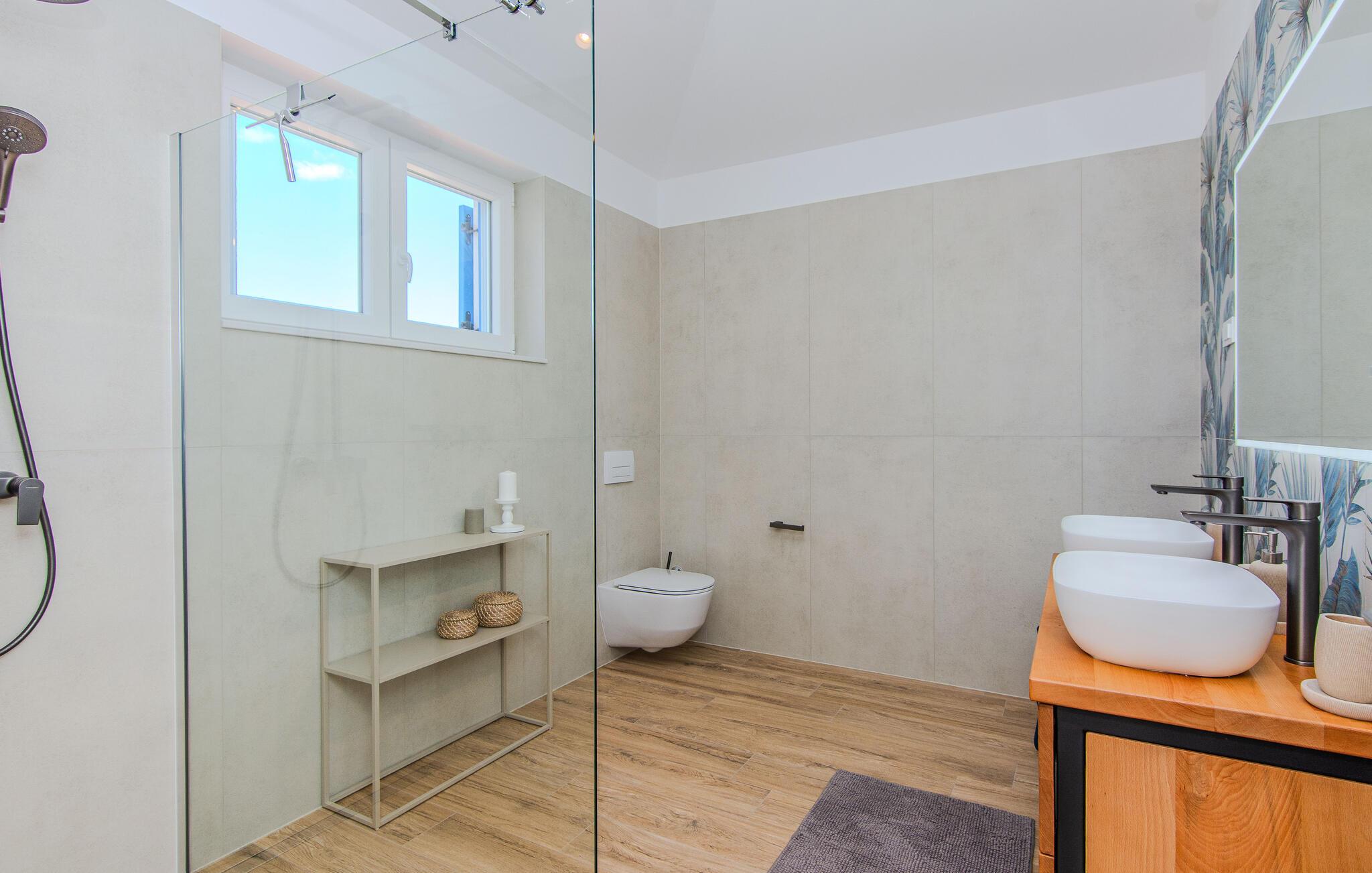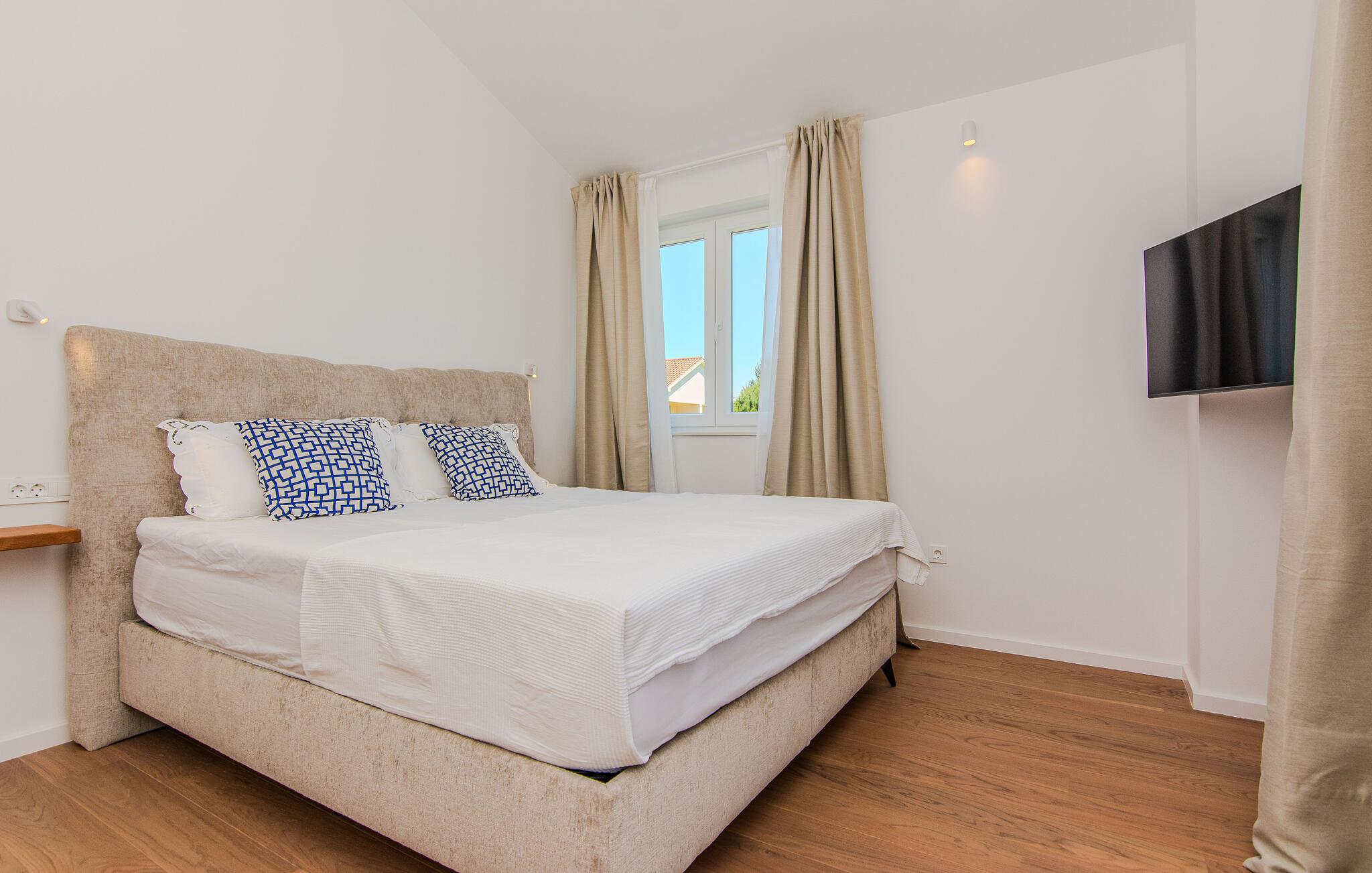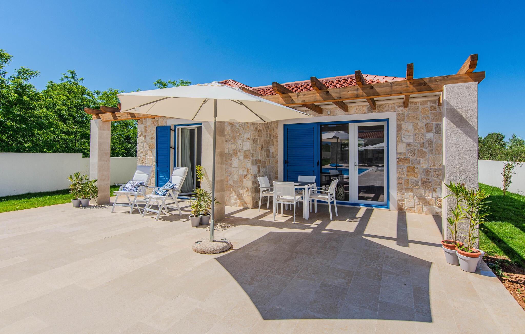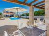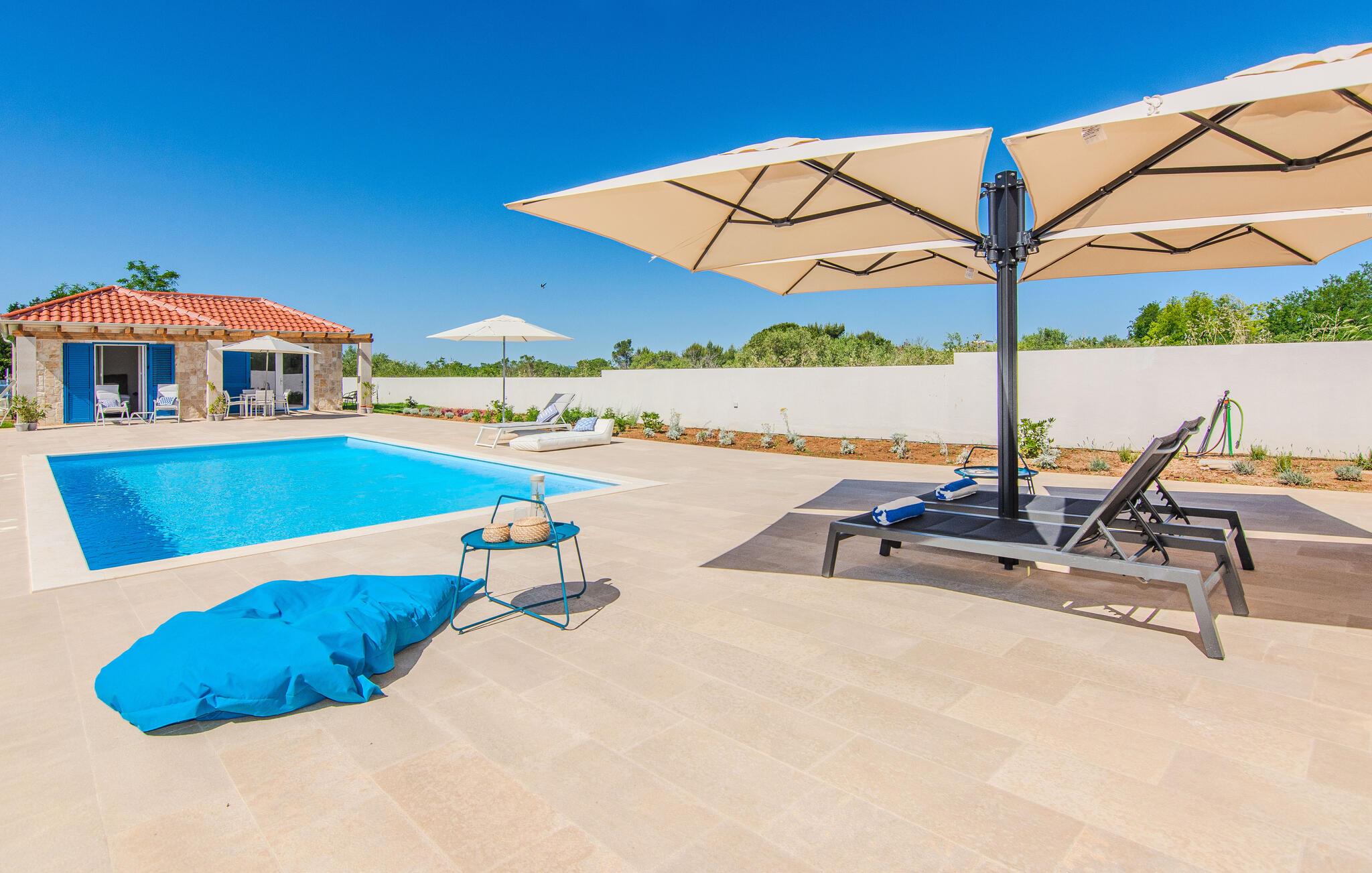 Hop ind i den rummelige pool og slap af på de komfortable liggestole eller nyd morgenmaden i det overdækkede udendørsområde med udsigt over middelhavslandskabet. Den smagfuldt designede stenfacade og de karakteristiske skodder giver huset en charmerende, dalmatisk karakter. Trampolinen i haven sørger for sjov hoppesjov for de små feriegæster.