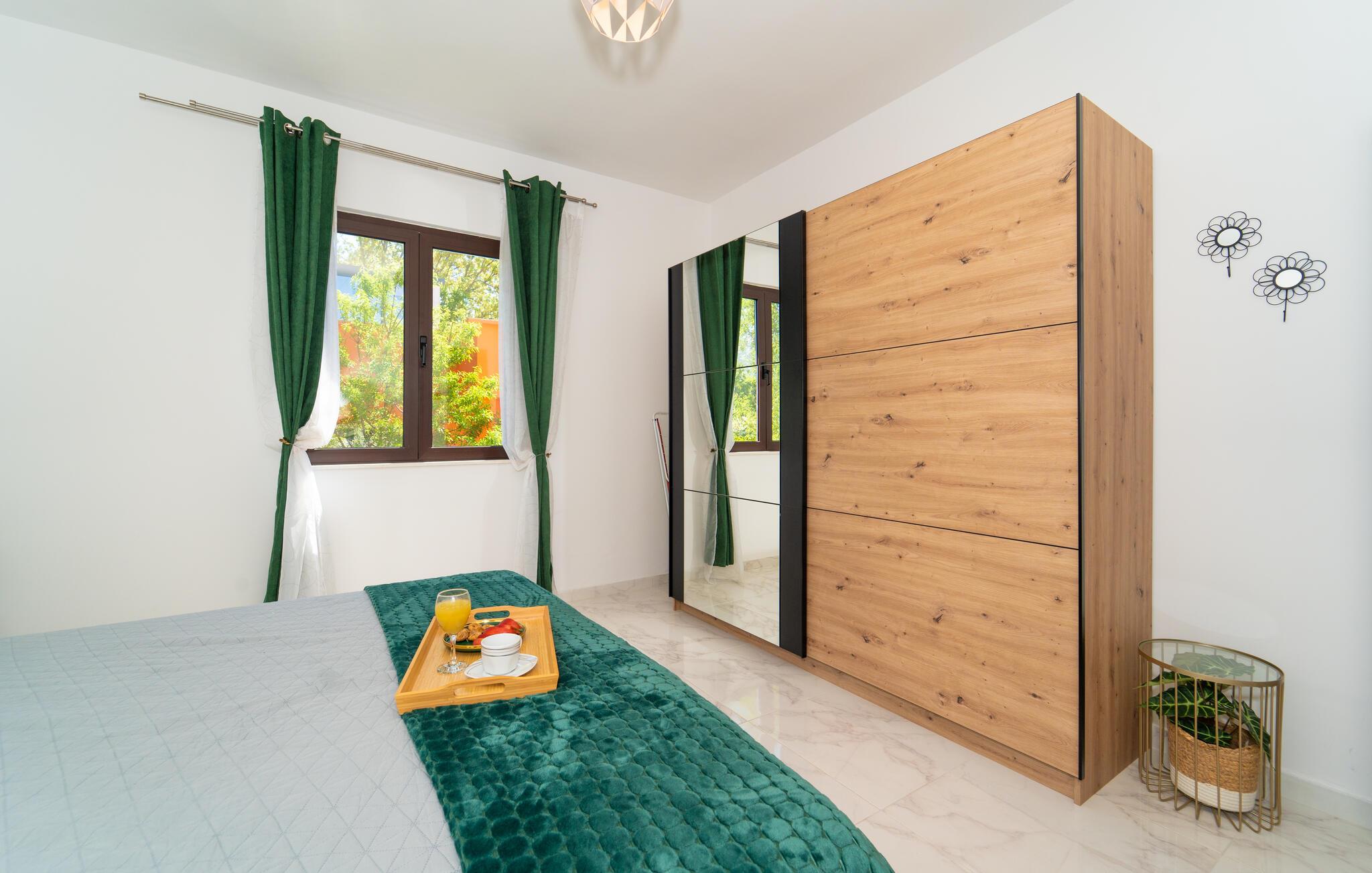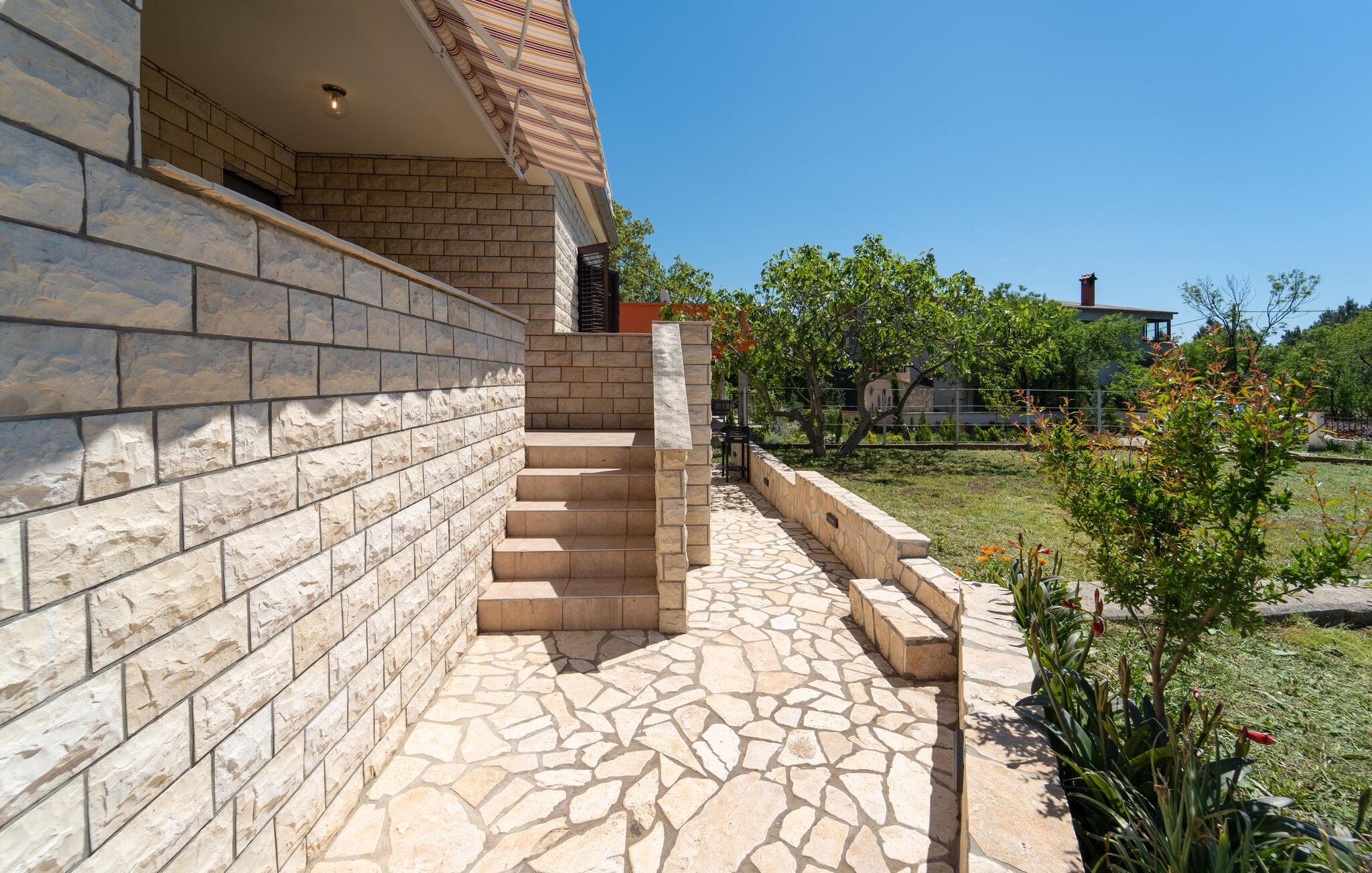 Gå ud på den overdækkede terrasse med udsigt over den velholdte have. Nyd dagens måltider udendørs i skyggen af ??markisen eller slap af i det grønne. Brug grillområdet til en hyggelig aften med dalmatiske specialiteter. Det rummelige udendørsområde med græsplæne og middelhavstræer tilbyder plads til at lege, slappe af og tage en pause.