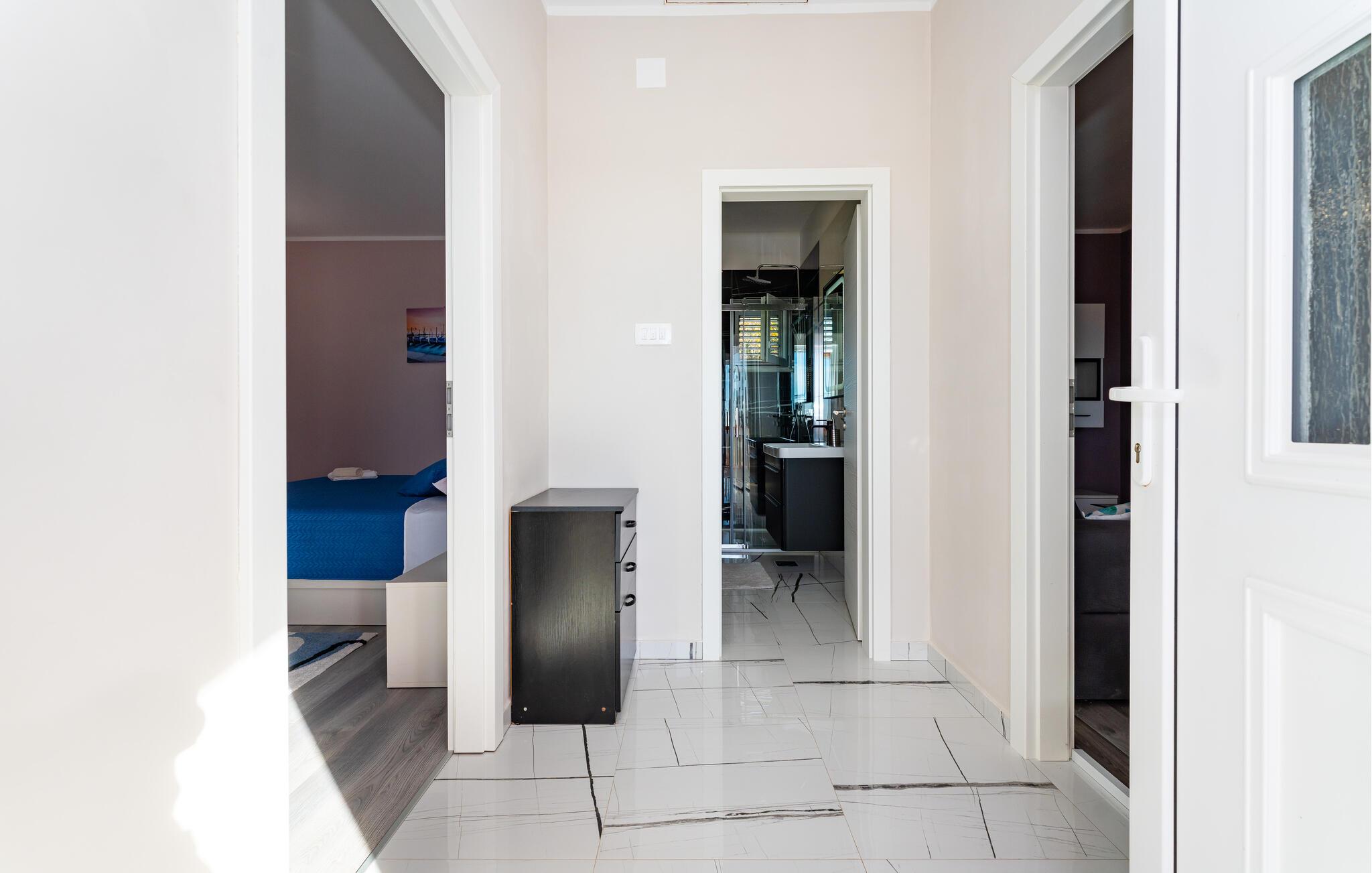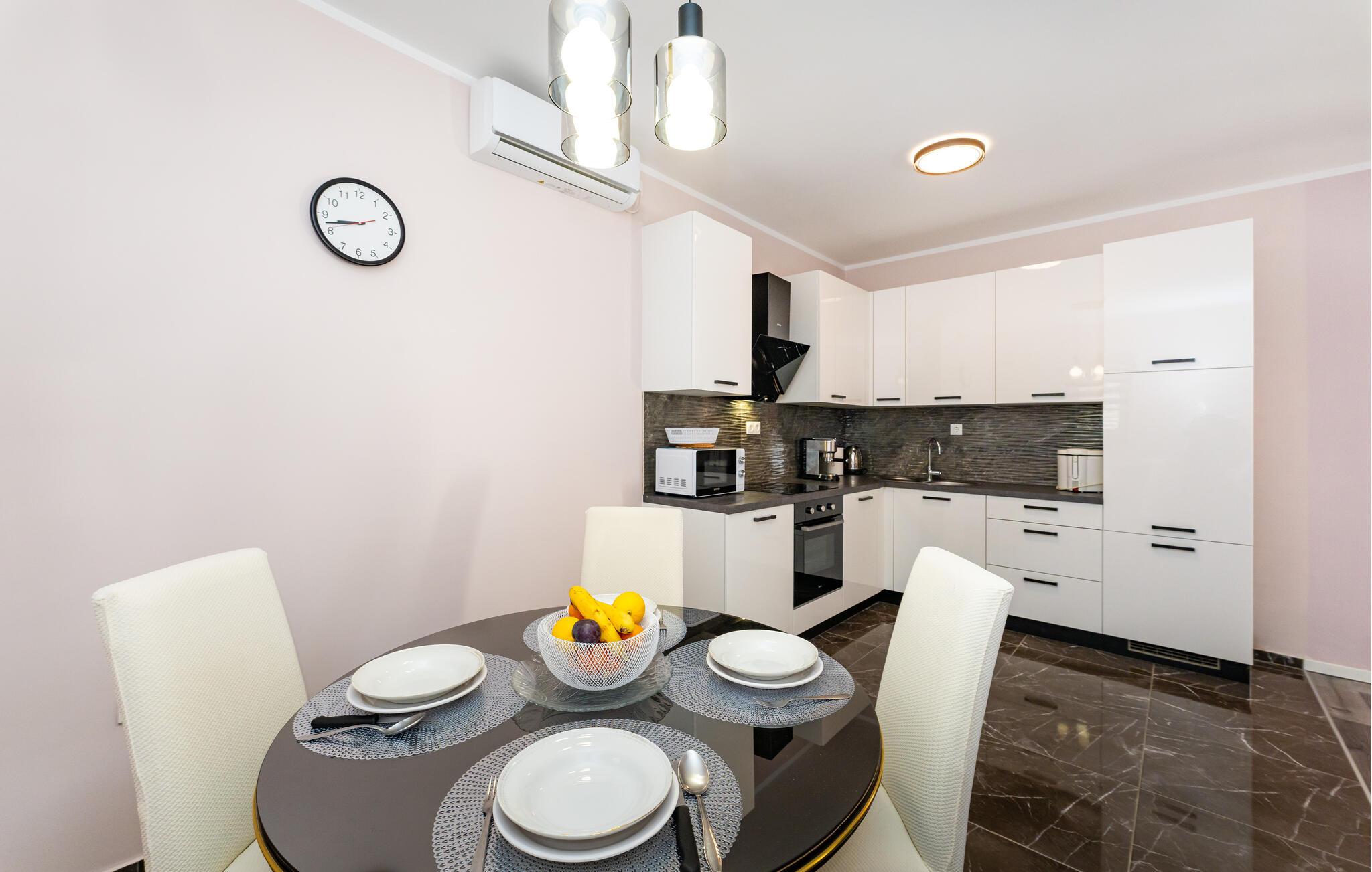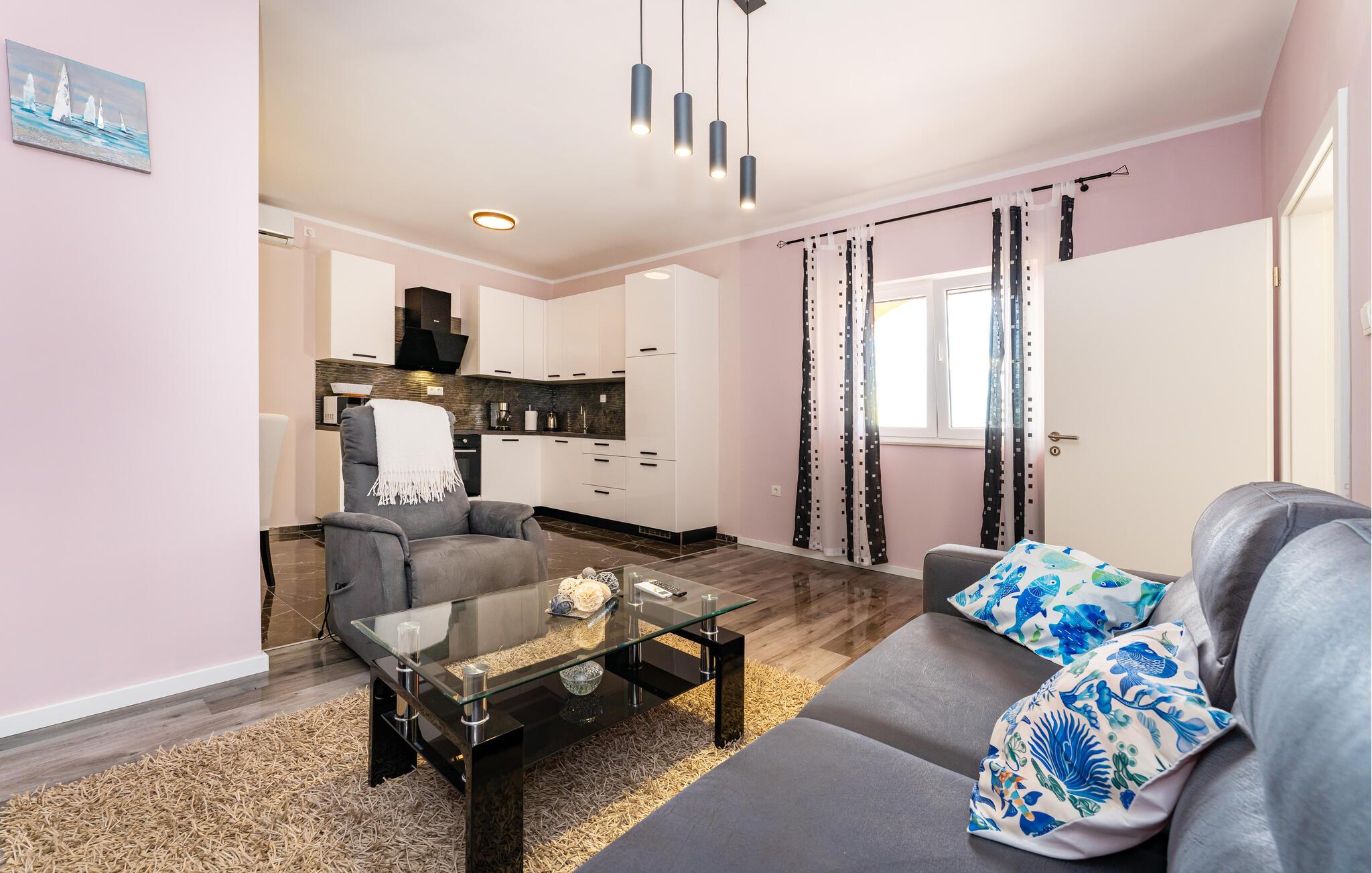 Din rummelige ejendom i Slivnica, nær Zadar, har to moderne indrettede lejligheder, der ikke lader noget tilbage at ønske. Lav mad sammen i et af husets to køkkener, som er noget særligt med moderne hårde hvidevarer og stilrent design. Og tilbring omgængelige timer i de hyggelige opholdsområder med en elegant atmosfære. Fra balkonen på øverste etage har I en fantastisk udsigt over det omkringliggende landskab.