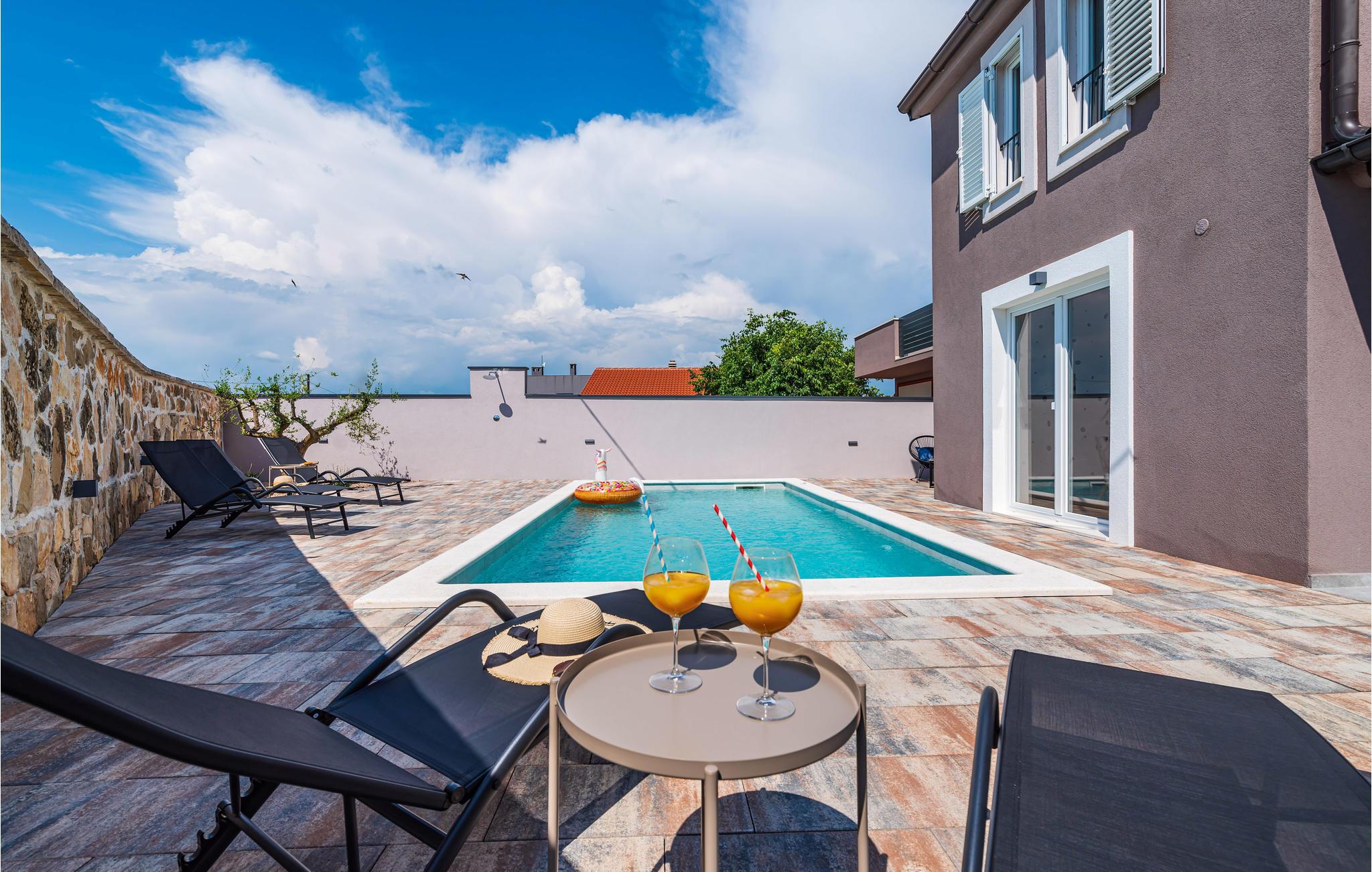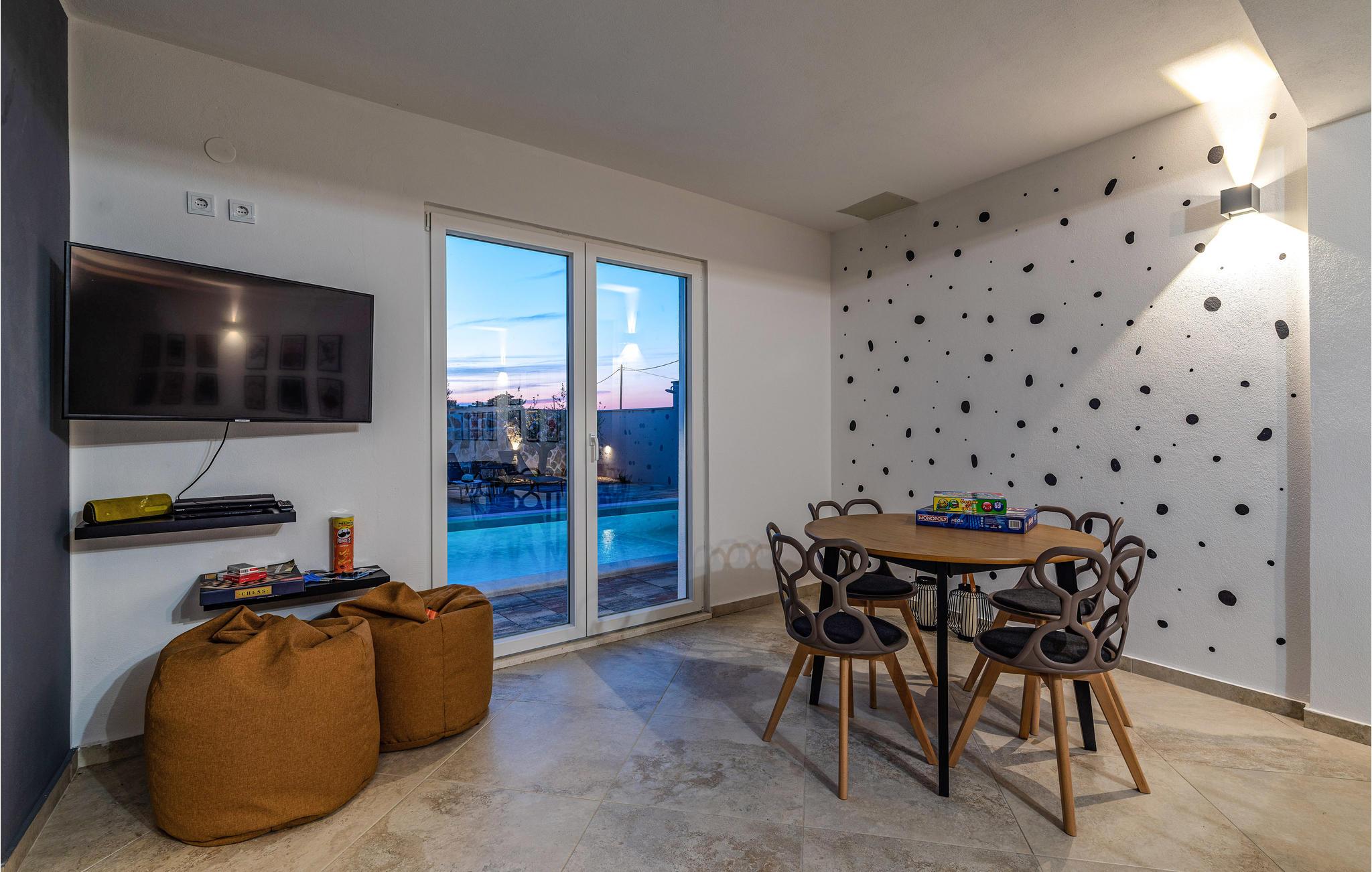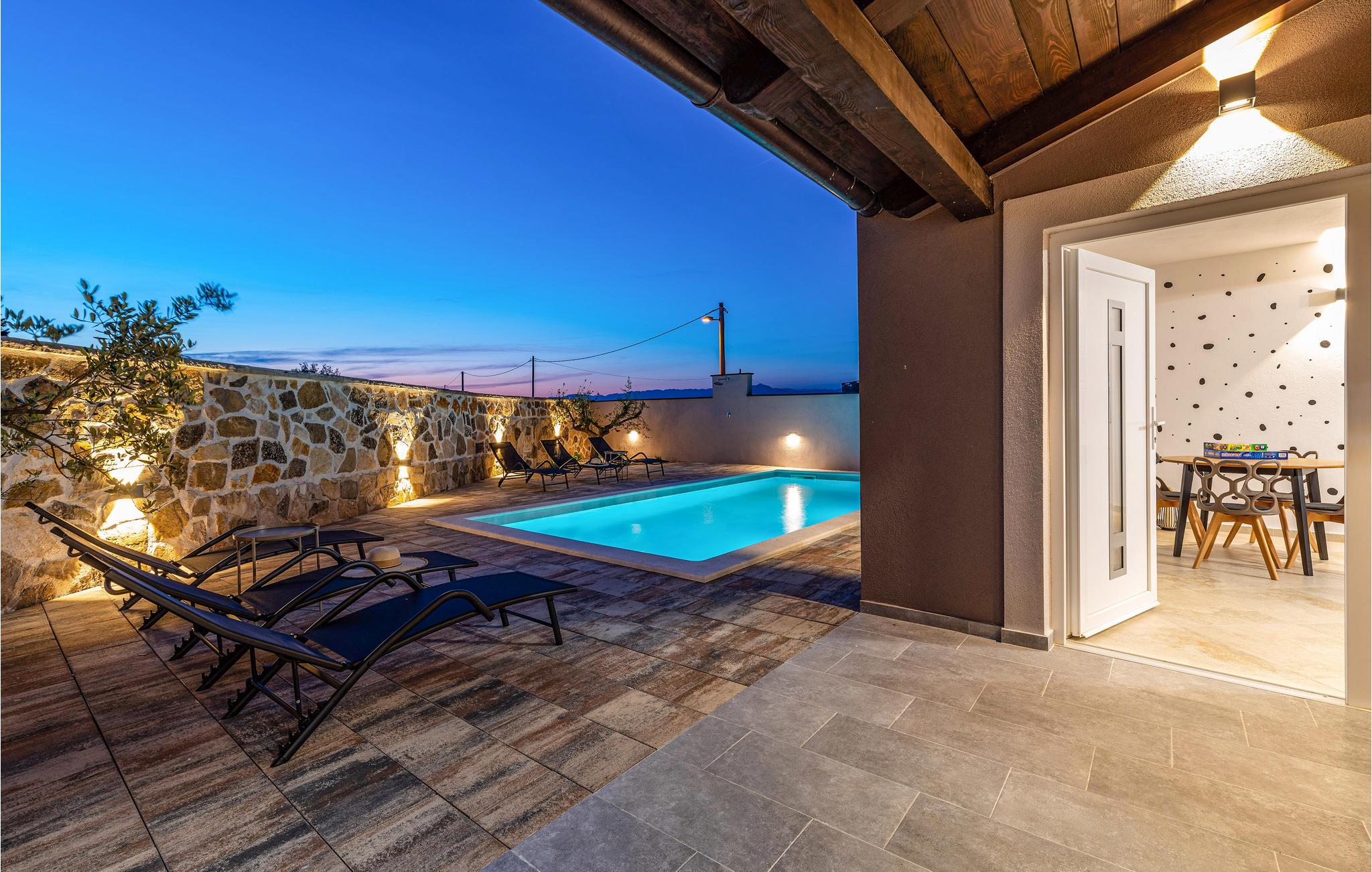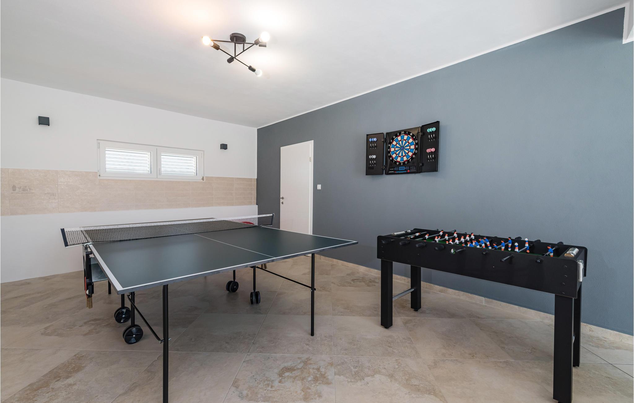 Slap af i dette rummelige og moderne feriehus med swimmingpool. Tilbring en uforglemmelig ferie med hele familien i dette smukke hus, der vil friste jer med sine mange faciliteter og underholdningsmuligheder. Glæd jer til husets indre, som venter jer med tiltalende komfort, hyggelige lokaler og et aktivitetsrum med leg og hygge. Spil dart, bordtennis og bordfodbold, før I begiver jer ud i det fri. Den store terrasse er det ideelle sted at nyde solen med en kølig drink. Se ud på det rolige landskab eller spring i den forfriskende pool for en svømmetur. Om aftenen kan I samles til en grill, mens de små udforsker legehuset og legetårnet ved siden af. Oplev kystens bagland, mens I vandrer og cykler, og planlæg ture til Kariner og Novigrader Meer samt til Adriaterhavets smukke stenstrande. Nyd at dykke ned i det krystalklare hav og lad jer blive båret på vandoverfladen. Prøv forskellige vandaktiviteter eller besøg byen Zadar, som byder på en række seværdigheder. Glæd jer til en uforglemmelig ferie i Dalmatien!