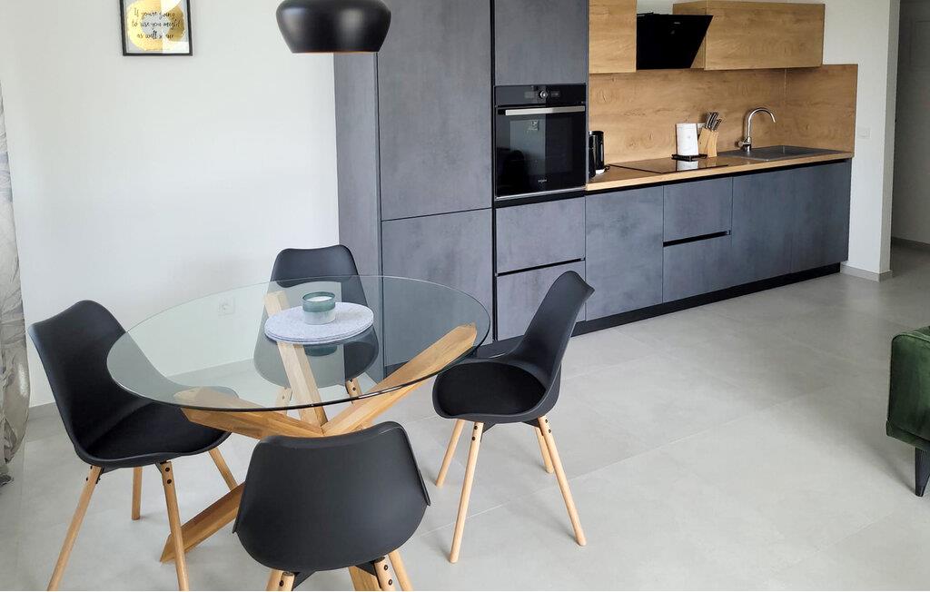 Denne lejlighed har en moderne, men komfortabel atmosfære. Diskrete farver og smukke grønne nuancer komplementerer hinanden harmonisk, og et komfortabelt opholdsområde sikrer, at I føler jer hjemme. Tilbring afslappende timer med at nyde en filmaften sammen, tilbered friske måltider i det veludstyrede køkken eller find sammen omkring det runde spisebord til et spil kort med børnene.
