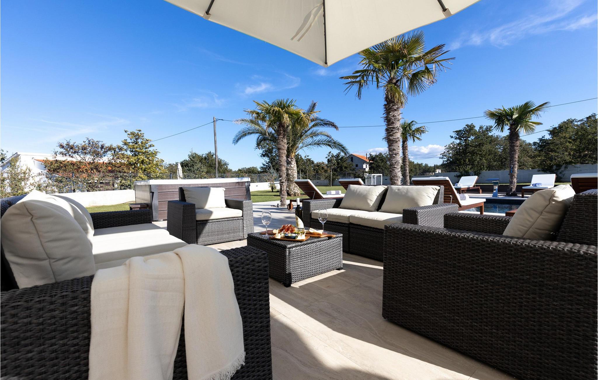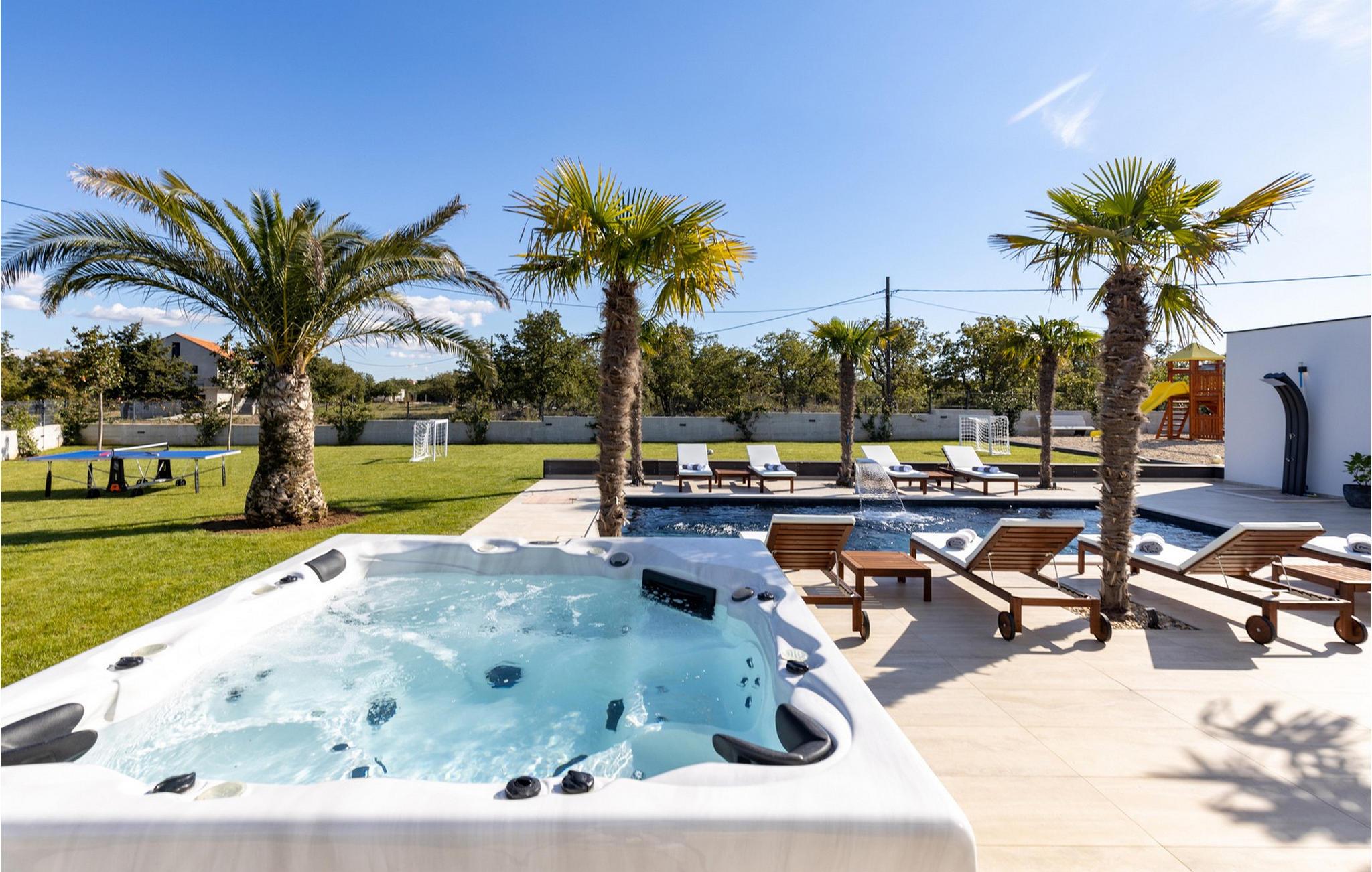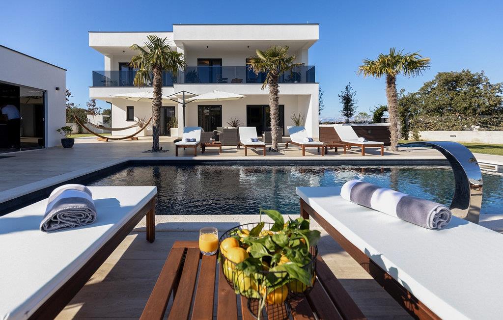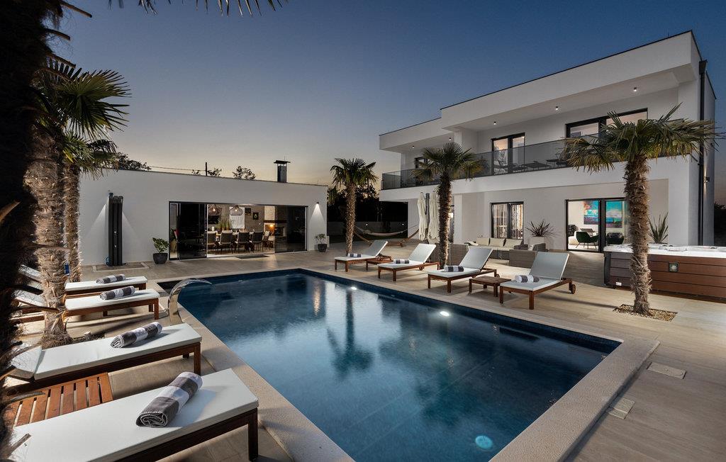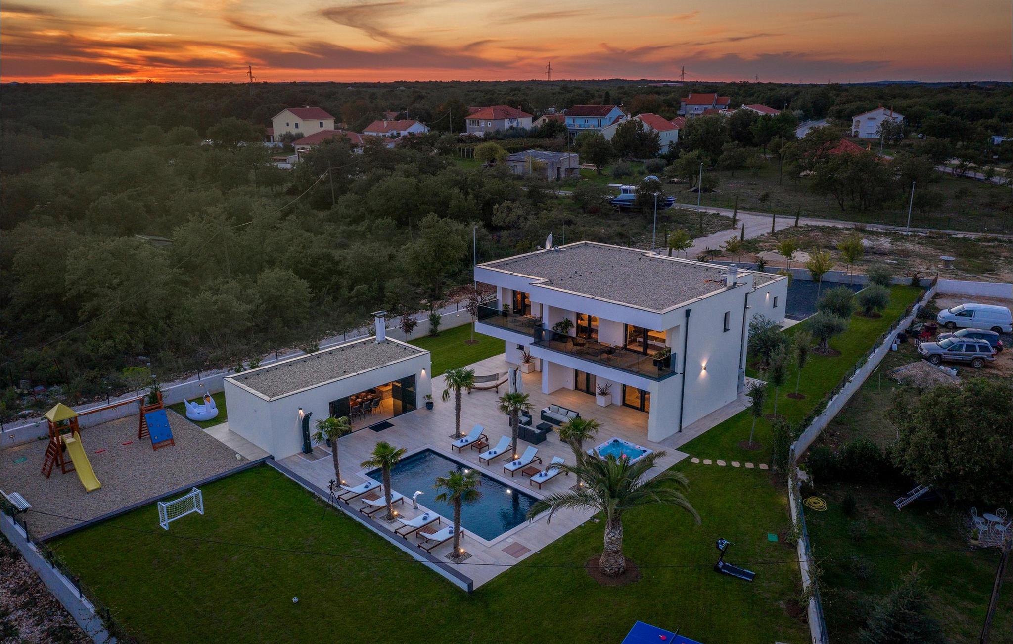 Nyd en dejlig ferie i dette fantastisk beliggende feriehus med pool, spabad og attraktive indendørsaktiviteter. Villa Quercus byder jer velkommen til en moderne og stilfuld atmosfære præget af rene linjer og materialer af høj kvalitet. Den åbne stue og spisestue med store glasfacader kombinerer elegance og komfort og lægger op til at tilbringe tid sammen med at snakke eller nyde en spilleaften. Tilbered lækre måltider i det moderne, veludstyrede køkken og forkæl familien og venner. Aktivitetsområdet med billard, bordfodbold og egen vinbar tilbyder mange muligheder for hyggelige aftener. Start dagen med en dukkert i den forfriskende pool, nyd solen på de behagelige liggestole eller slap af i spabadet med en kølig drink i hånden. På den rummelige terrasse kan I nyde et afslappet måltid, mens børnene leger på legepladsen eller spiller fodbold i haven. Om aftenen forvandles omgivelserne til et udendørs paradis, ideelt til afslapning i slutningen af dagen med blød belysning og middelhavsstemning. Briševo er det ideelle sted for en drømmeferie i Dalmatien. Byen Zadar ligger i nærheden og er fortryllende med sin historiske gamle bydel, kulturskatte og fremragende middelhavskøkken. Tag på udflugter til de charmerende kystbyer Nin, Biograd og Vodice, hvor livlige promenader og hyggelige restauranter venter på jer. Kornati-øgruppen med dens glitrende øer og turkisblå bugter, den imponerende Paklenica-kløft med dens stejle klipper og vandrestier, de spektakulære Krka-vandfald og de verdensberømte Plitvice-søer med deres smaragdgrønne kaskader er også et besøg værd.