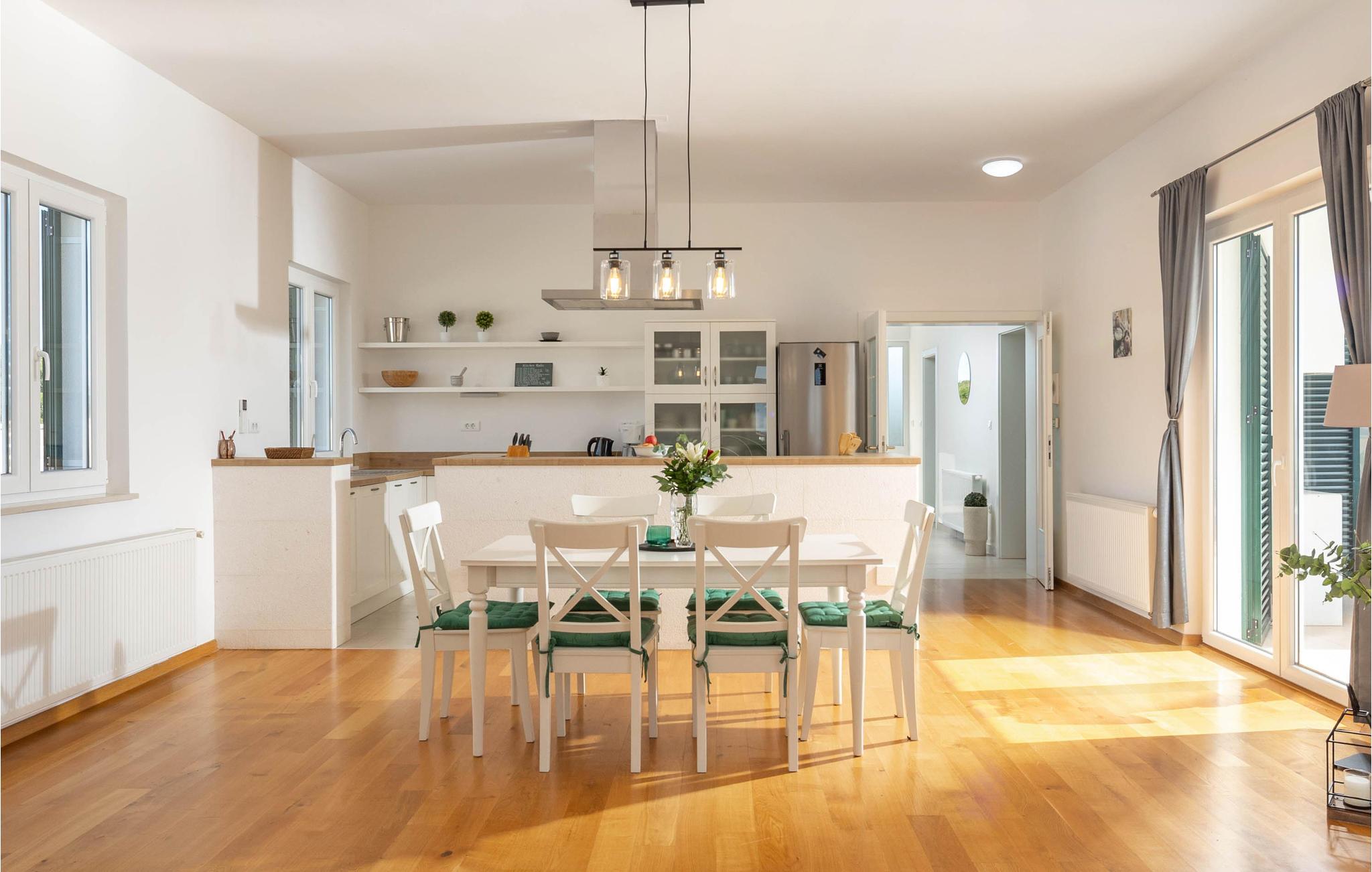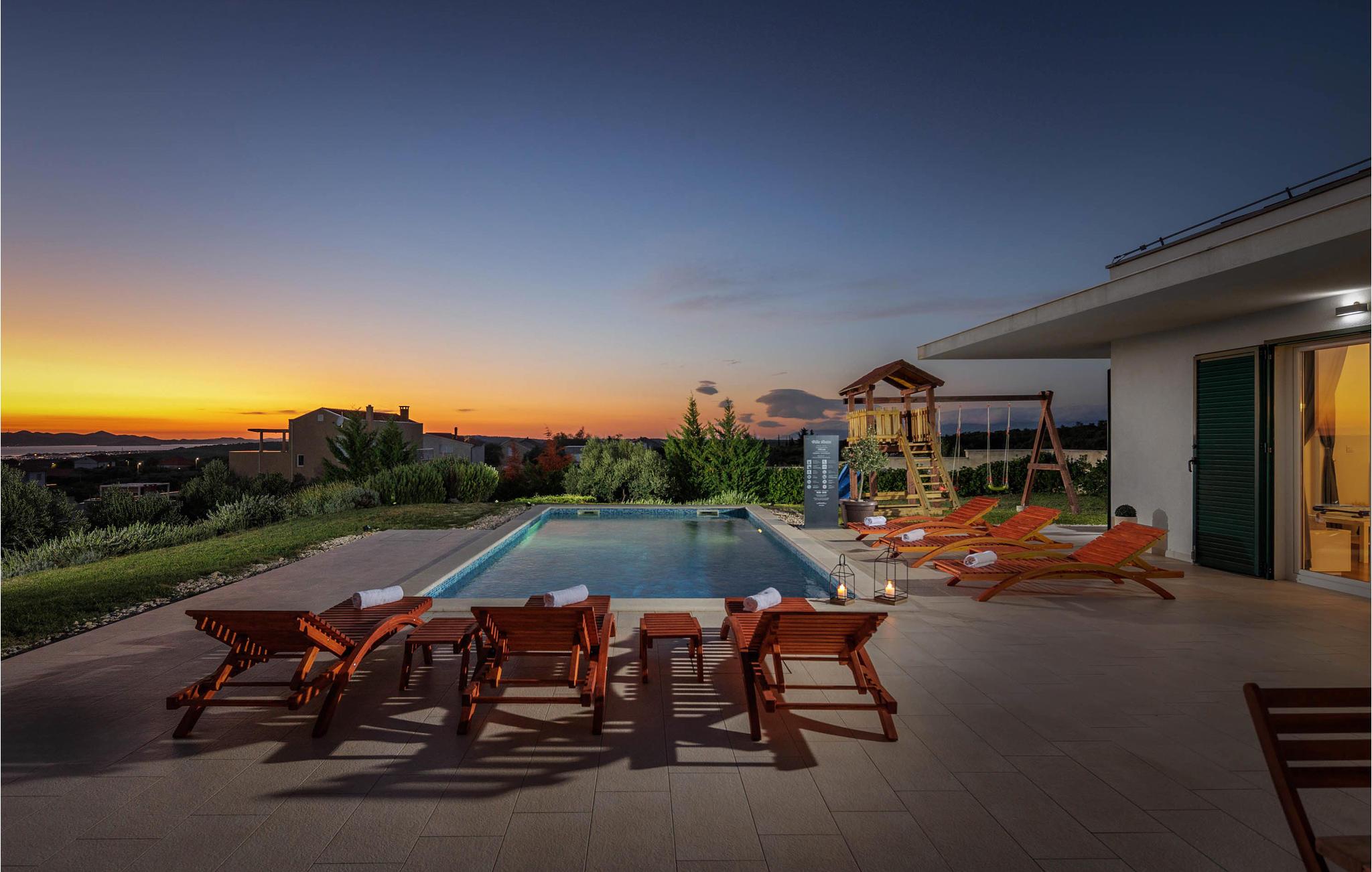 Nyd fantastiske solnedgange i denne luksuriøse villa med pool i en idyllisk beliggenhed. Den moderne, etplansvilla Anica er noget særligt med sit højkvalitets og smagfuldt møblerede interiør og fortryllende udsigt over det maleriske landskab i Velebitbjergene helt ned til havet. Gulv-til-loft-vinduer oversvømmer det åbne opholdsområde med masser af naturligt dagslys, hvilket skaber en venlig og behagelig atmosfære. Glæd jer til harmoniske måltider ved det indbydende spisebord, og efter en begivenhedsrig dag kan I streame en spændende film på den komfortable sofa. Et fitnessrum med moderne udstyr er tilgængeligt til jeres daglige træning. Den rolige, idylliske beliggenhed giver jer en afslappende følelse af frihed, samtidig med at den tilbyder velkommen privatliv til afslappende familietid i den velholdte have. snup en frisk dukkert, som I har lyst, i den smukke pool, genoplad batterierne på de behagelige liggestole, lad jeres unge gæster nyde de spændende spil, og forfin jeres grillretter med aromatiske urter fra haven. Den historiske by Zadar ligger kun en kort køretur fra jeres villa. En slentretur gennem den gamle bydel vil tage jer med på en spændende rejse tilbage i tiden. Besøg resterne af romerske bygninger, slentre langs de middelalderlige bymure, og gå ikke glip af det berømte Havorgel og "Hilsen til Solen". Dyk ned i det klare Adriaterhavsvand i den charmerende kystby Sukošan, nyd vandsport, og udforsk regionen med dykning, cykling eller ridning.