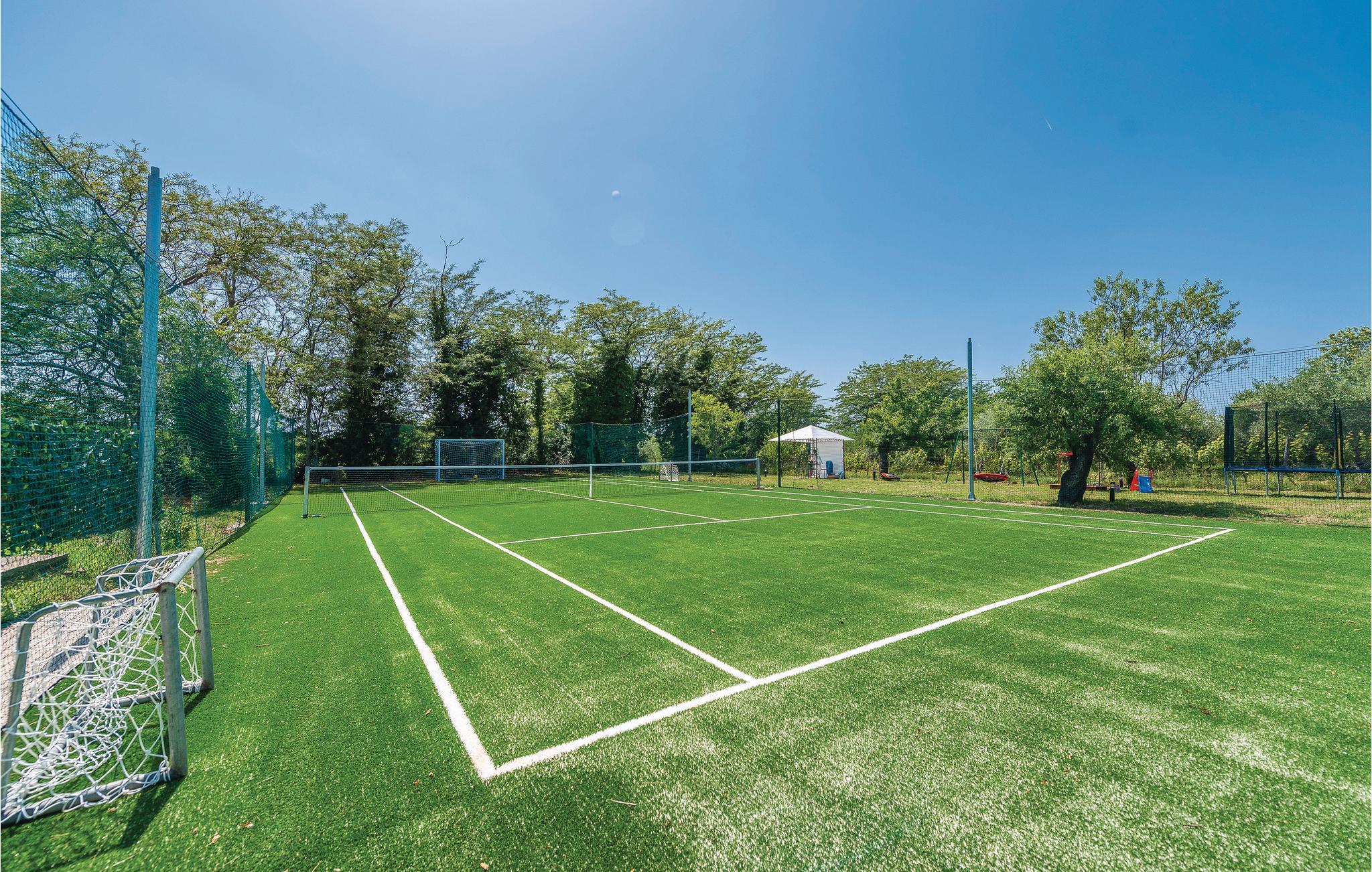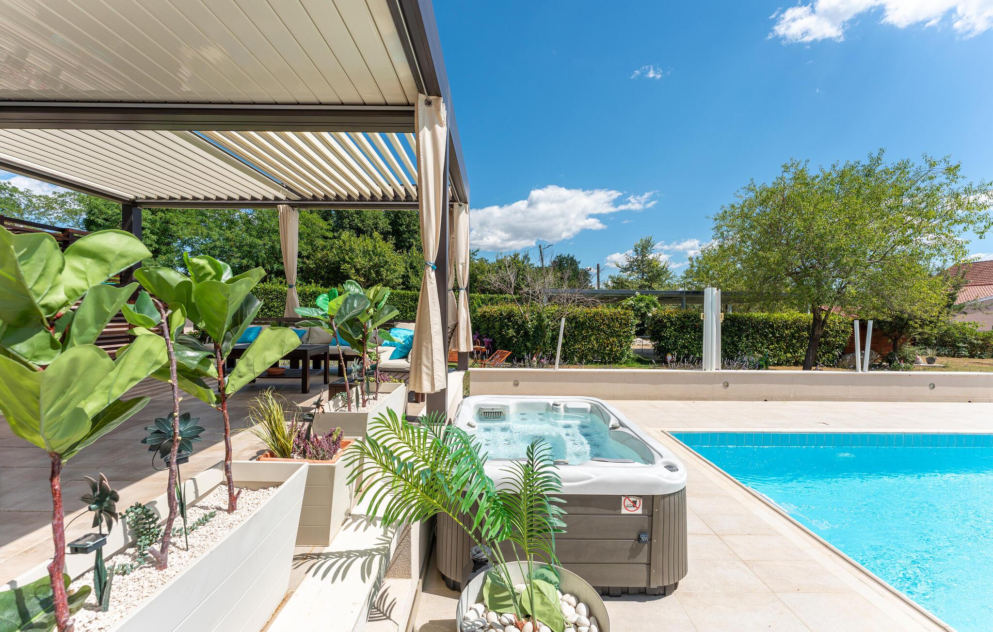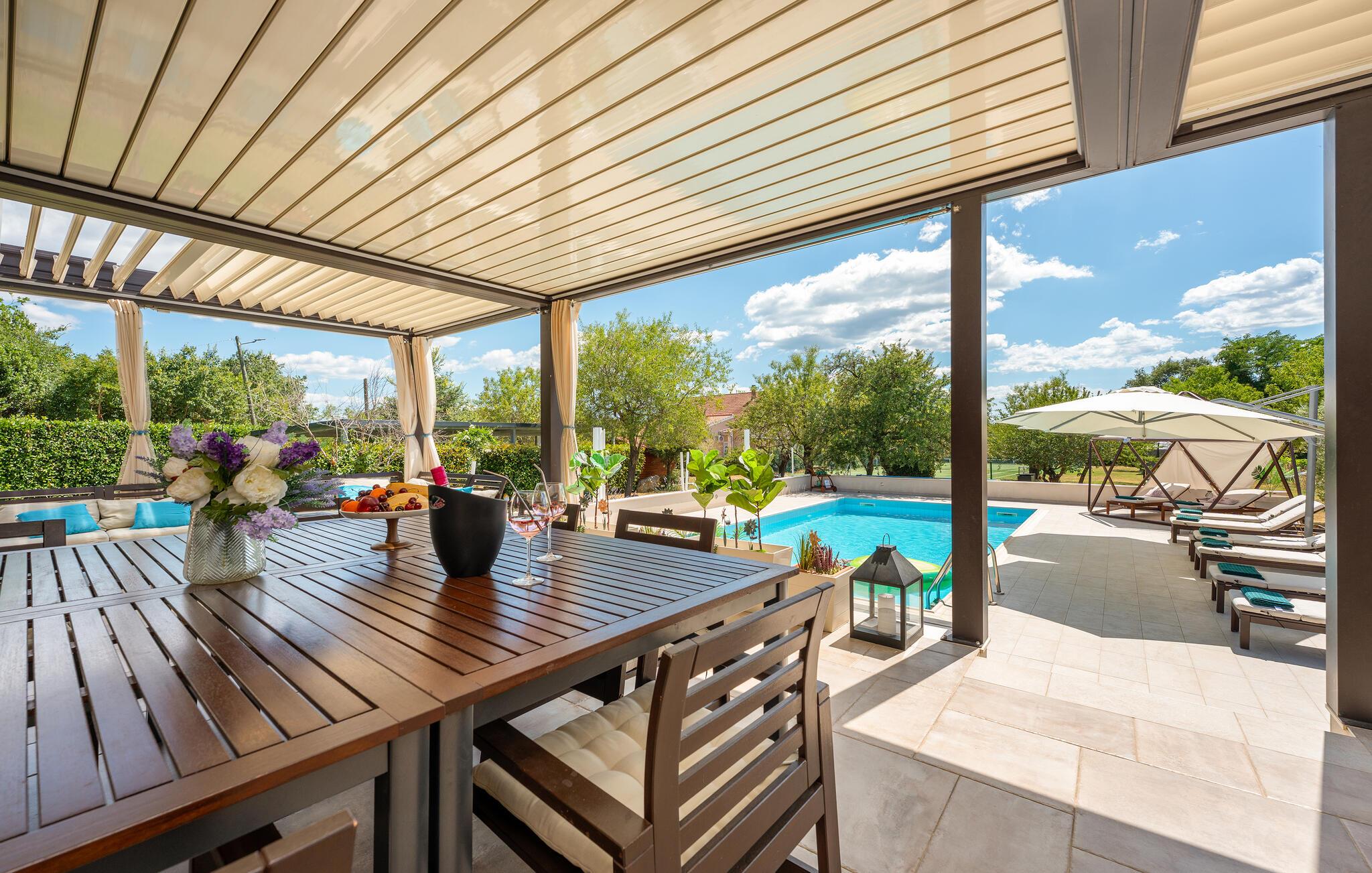 Dette komfortable feriehus til otte personer ligger i det grønne opland omkring Donji Zemunik på en stor privat grund, perfekt til jer, der vil bo luksuøst og helt ugenert. På grund af de mange muligheder for at dyrke sport, oplagt til aktive ferierende. Her er en multisportsplads hvor I kan spille tennis, volleyball, fodbold og badminton. Ikke nok med det, der er også et fitness og fritidsrum med billard, dart og bordfodbold. Her er også legetøj til jeres børn. I kan også glæde jer til jeres helt private pool, whirlpool og en sauna, som prikken over i’et. Soveværelset på øverste etage med skrå vægge, er oplagt til børn. Det tager et kvarter at køre til Zadar med de moderne seværdigheder: Havorgelet og Hilsen til solen.