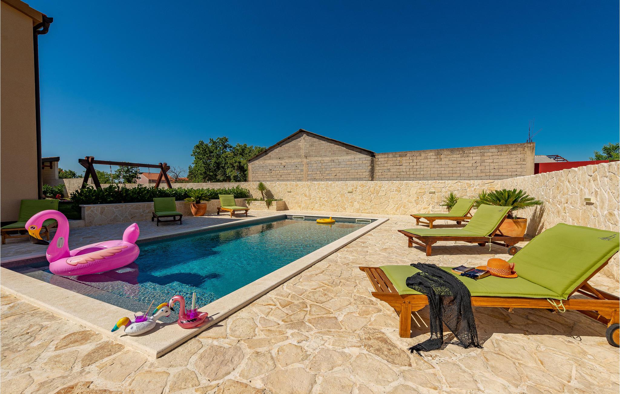 På en 2.700 m² stor, indhegnet grund ligger dette feriehus, som består af to boligeenheder. De er forbundet af en udendørs trappe. Ved siden af den opvarmede udendørs pool ligger der også et udendørskøkken, hvor I kan se frem til at tilberede jeres lækre måltider under åben himmel. Børnene kan se frem til at hygge sig med legeredskaberne på grunden. For de aktive feriegæster er der et badminton/volleyball net. megen morskab får I også ved bordtennisbordet, og med playstation4 og dart. Her er der ingen der keder sig. De eventyrlystne kan se frem til at besøge eventyrparken i Debeljak kun fem km fra huset. Zadar med det berømte havorgel og de spændende ruiner fra et romersk forum ligger kun 14 km fra huset.