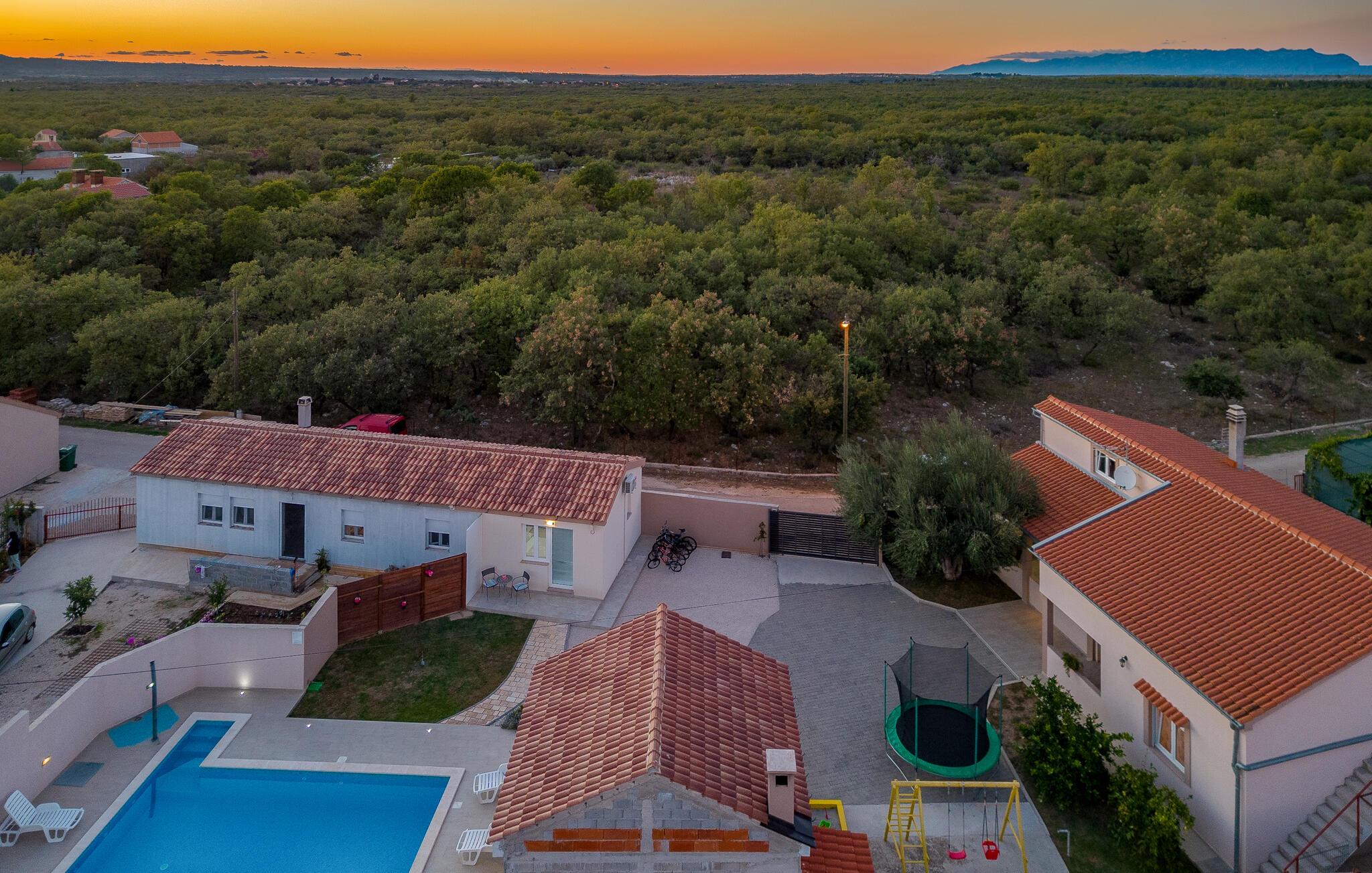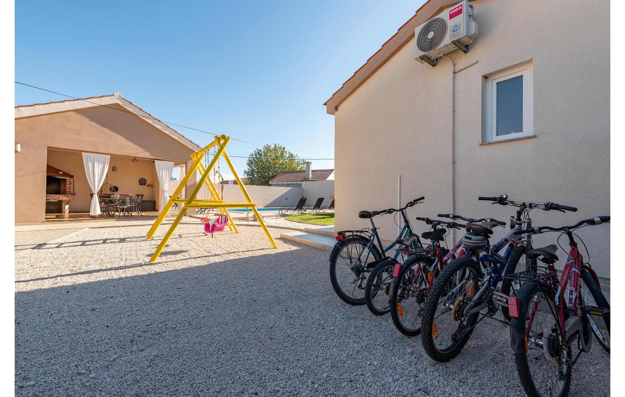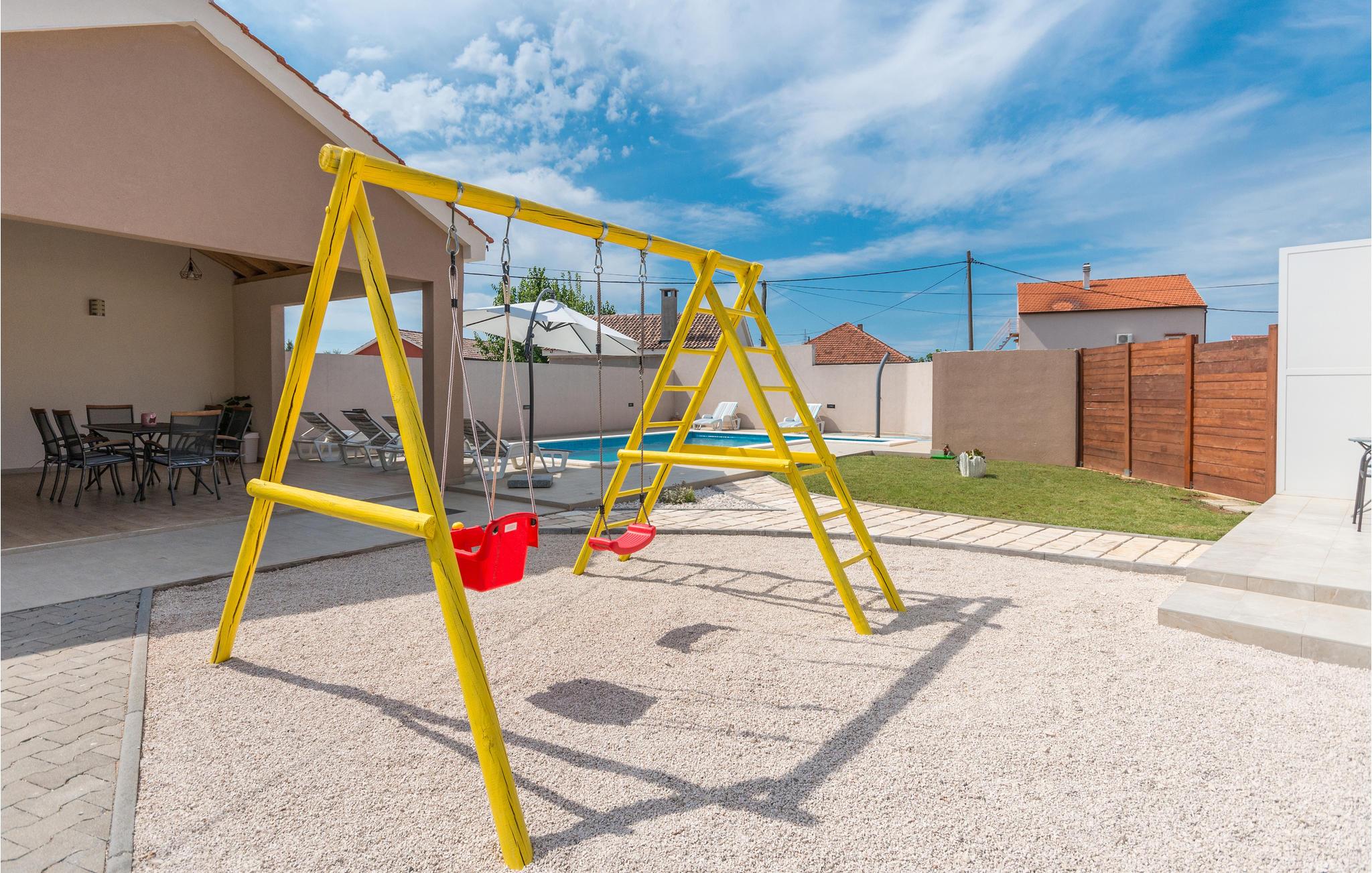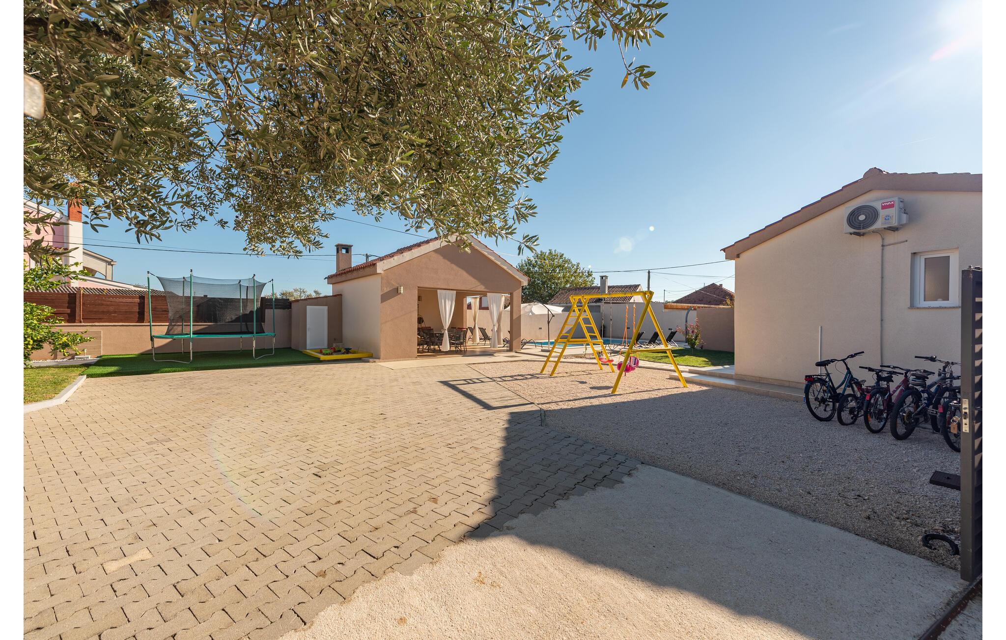I dette feriehus beliggende på en 700 m² stor indhegnet grund, finder I de perfekte rammer for en behagelig ferie. Her kan børnene lege uforstyrret med grundens legeredskaber, gyngen, trampolin, bordfodbold og ikke mindst den forfriskende pool. Terrassen med grillen bliver desuden feriens naturlige midtpunkt hvor I kan tilberede måltiderne under åben himmel. Uden for denne privatsfære kan I gå på opdagelse blandt regionens mange underholdningsmuligheder. F.eks. strandene ved Sukošan kun 7,5 km fra huset. Endvidere bør I tage på en dagsudflugt til Zadar, som kun ligger 14 km væk, med et utal af både moderne og historiske seværdigheder.