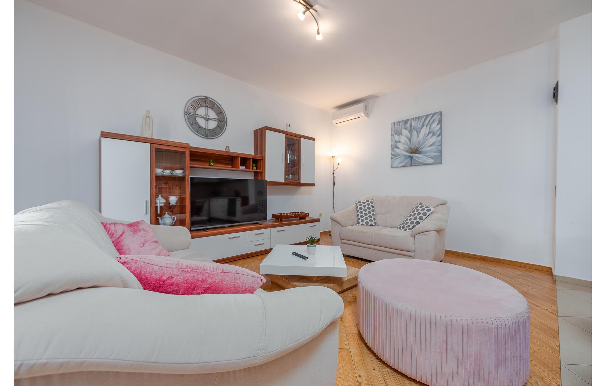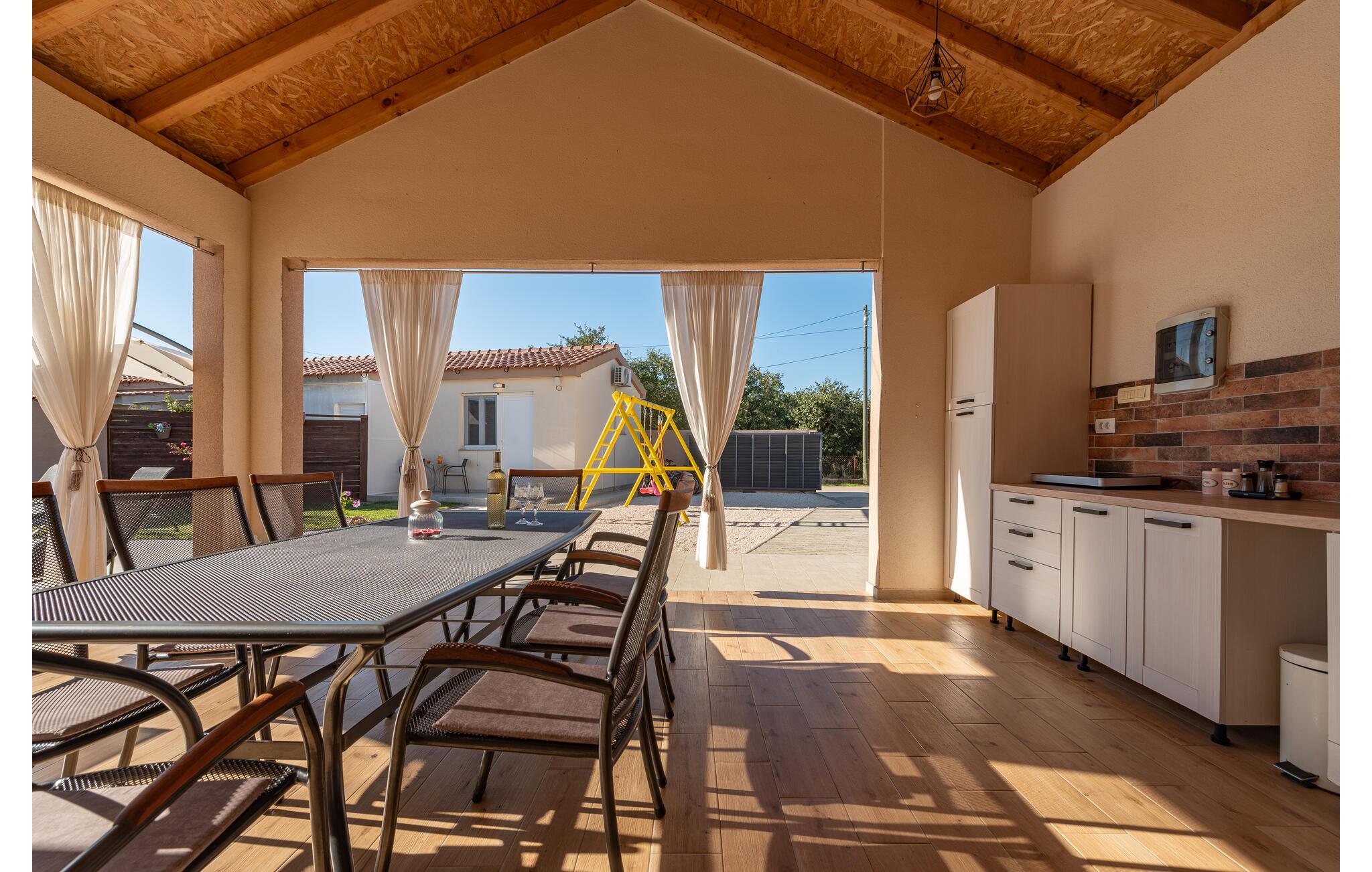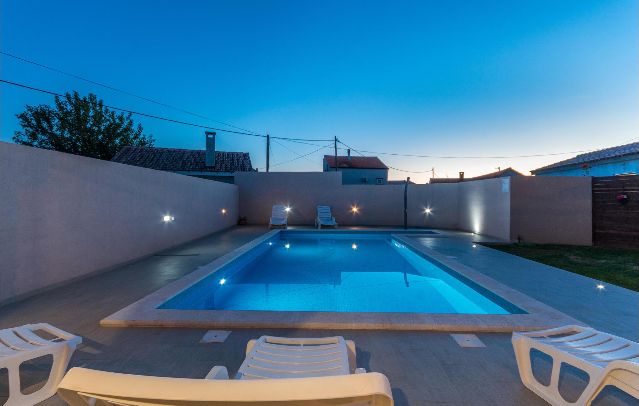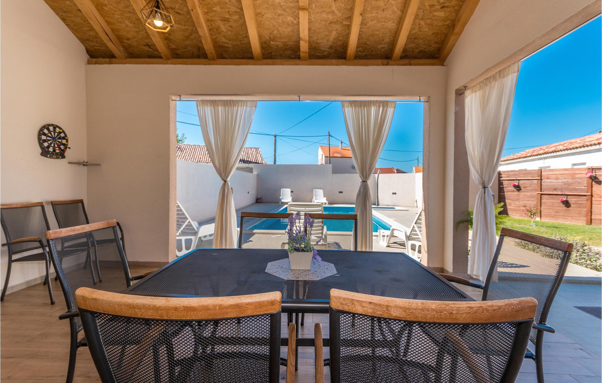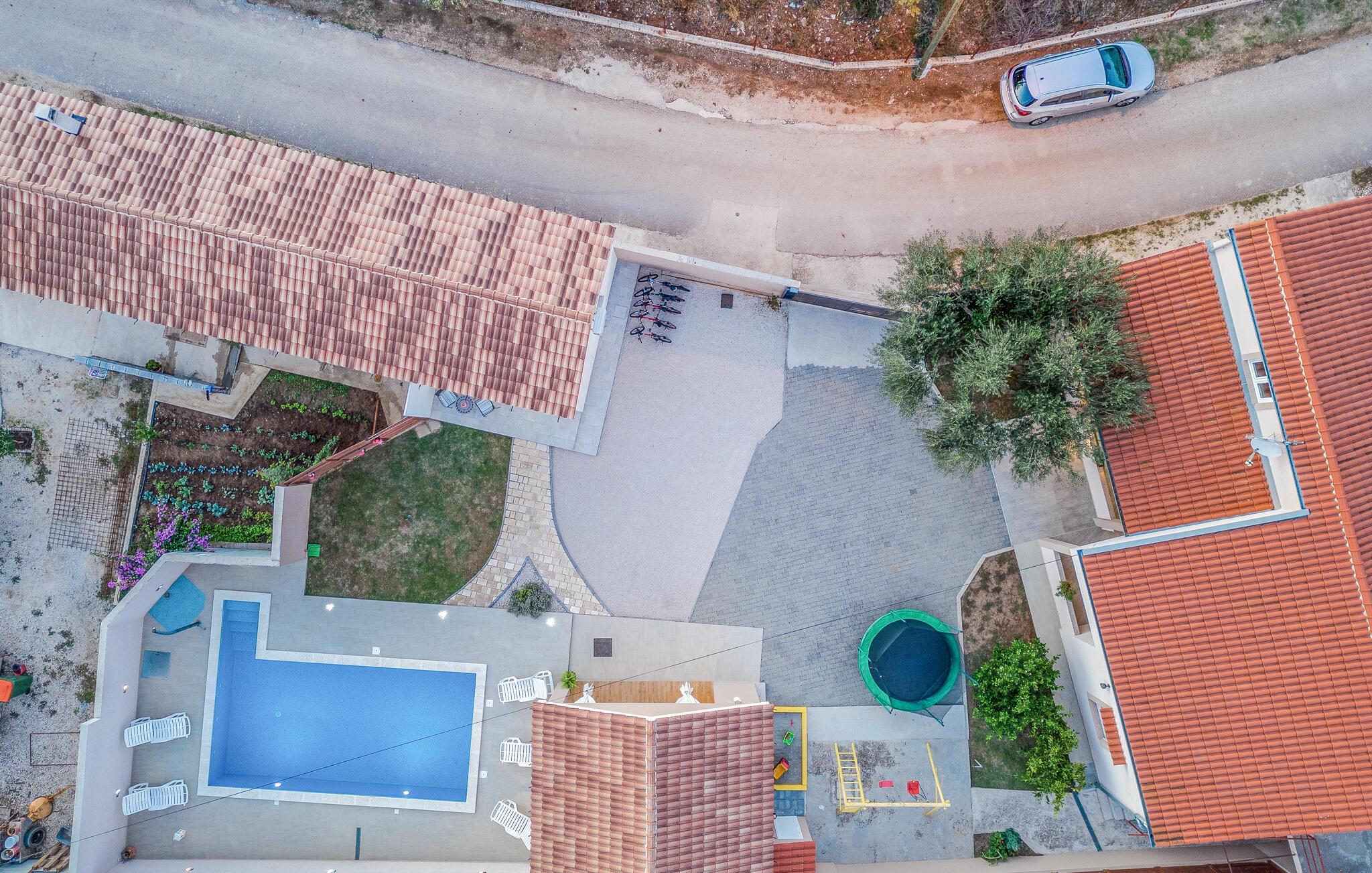 I dette feriehus beliggende på en 700 m² stor indhegnet grund, finder I de perfekte rammer for en behagelig ferie. Her kan børnene lege uforstyrret med grundens legeredskaber, gyngen, trampolin, bordfodbold og ikke mindst den forfriskende pool. Terrassen med grillen bliver desuden feriens naturlige midtpunkt hvor I kan tilberede måltiderne under åben himmel. Uden for denne privatsfære kan I gå på opdagelse blandt regionens mange underholdningsmuligheder. F.eks. strandene ved Sukošan kun 7,5 km fra huset. Endvidere bør I tage på en dagsudflugt til Zadar, som kun ligger 14 km væk, med et utal af både moderne og historiske seværdigheder.