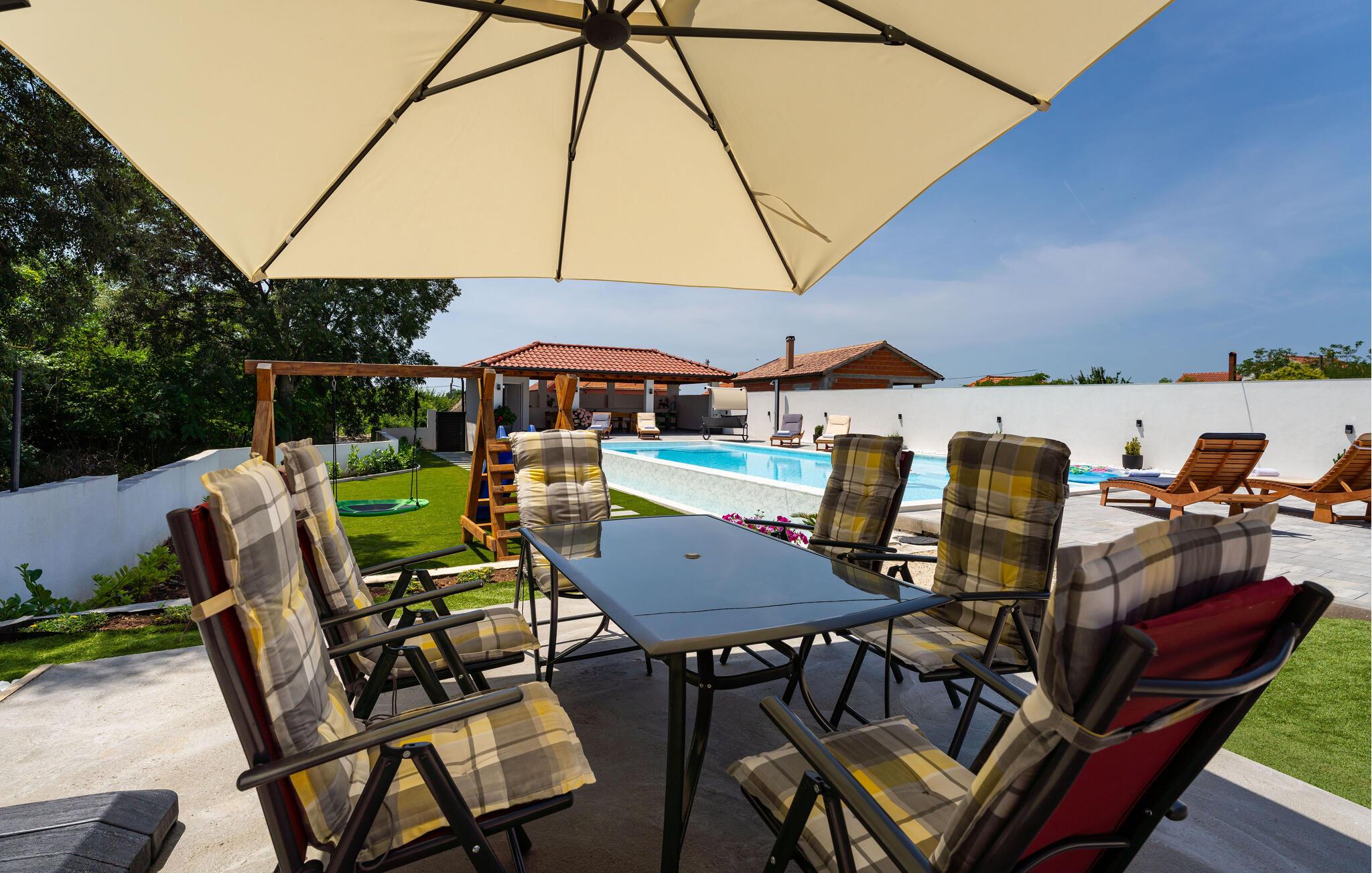Glæd jer til denne skønne ferielejlighed med fælles pool og en dejlig familievenlig have med mange faciliteter.