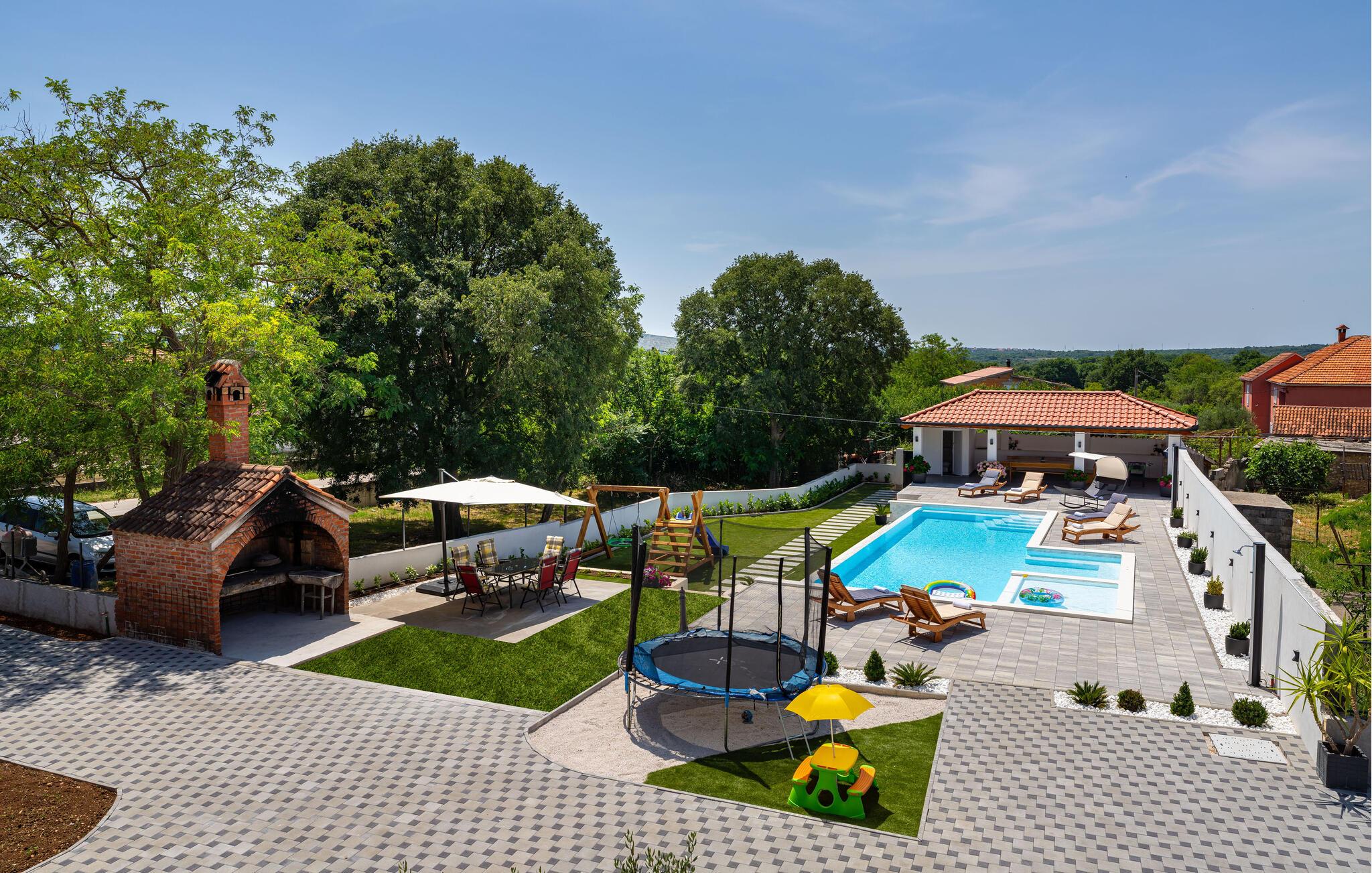 Udendørsområdet byder på en forfriskende pool med børnebassin og et stort badeområde til afslappende dage samt en familievenlig have til fælles aktiviteter. Oplev både komfort og ro i denne dejlige kulisse for uforglemmelige feriemomenter. Kom i snak med gæsterne fra den anden ferielejlighed, og arranger fælles grillaftener.