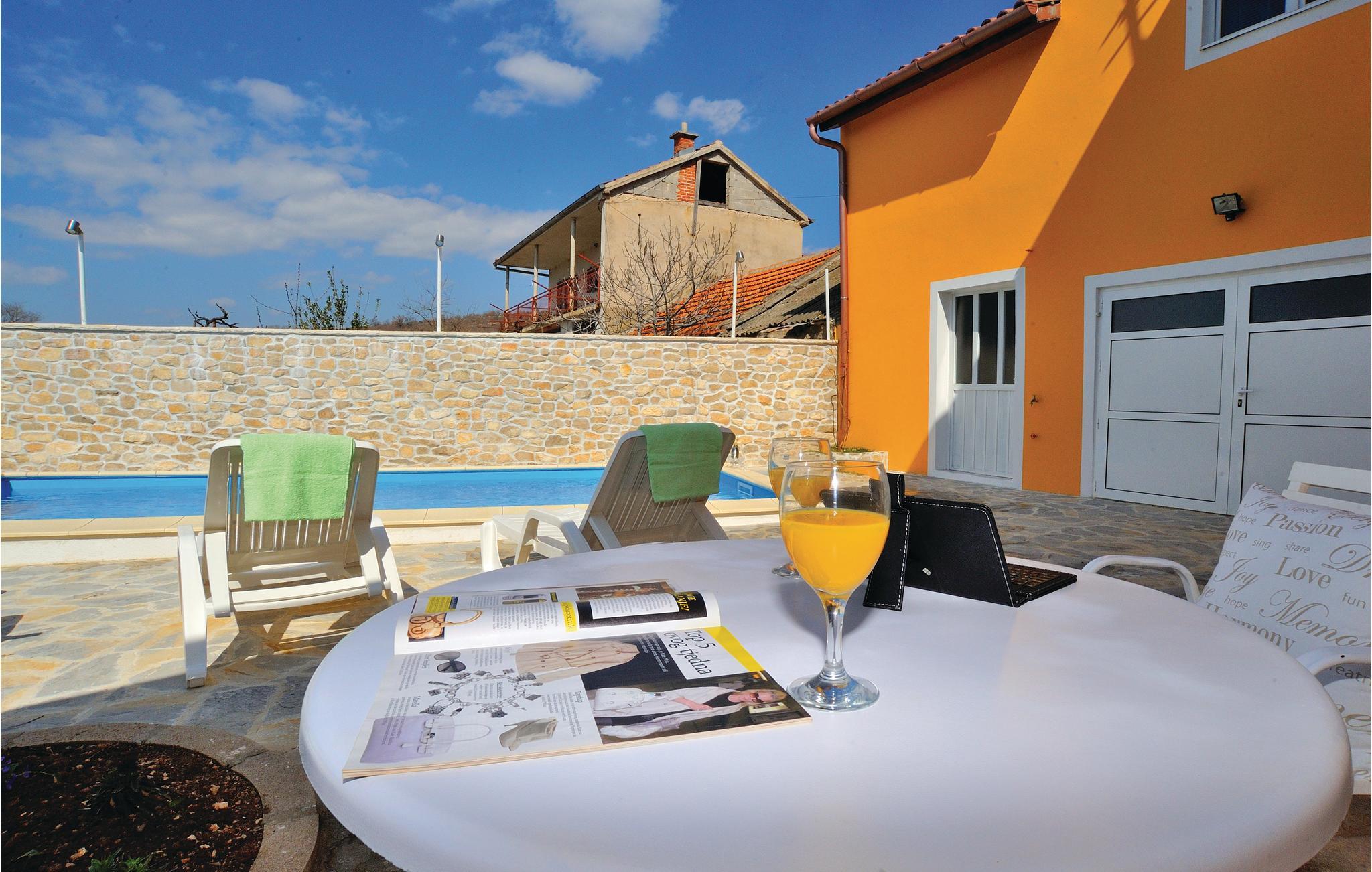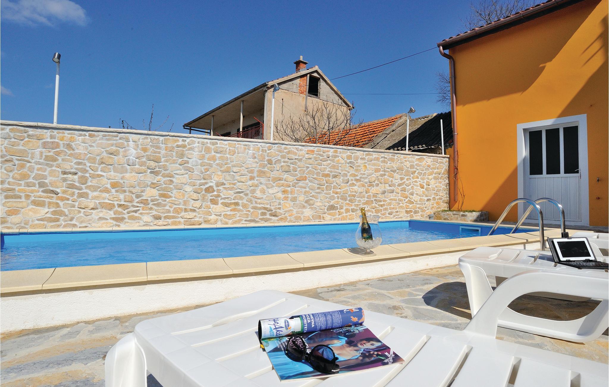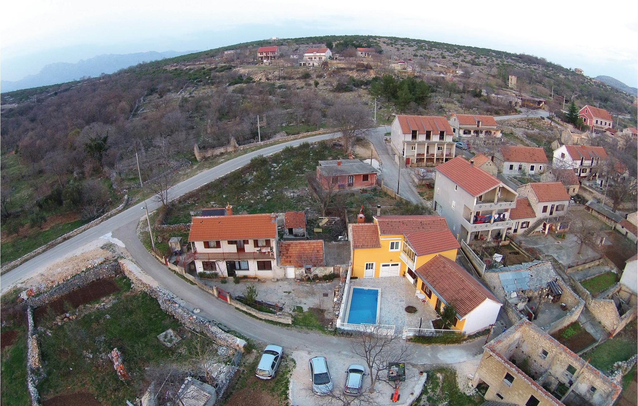 Dette dobbelthus med swimmingpool ligger i Krusevo og er opdelt i to separate boliger. En bolig ligger i stueetagen og er indrettet med et badeværelse og tre soveværelser. Et af værelserne er et gennemgangsrum, da det også har adgang udefra. Ligeledes i stueetagen findes et grillrum med separat indgang, lige ved siden af ligger garagen og via en udendørs trappe kommer I til 1. etage. Her er der et rummeligt køkken med spise- og opholdsstue samt en overdækket terrasse med udsigt til poolen. Til skønne ferieoplevelser hører rafting på floden Zrmanja og at se vandfaldet i floden Bijela.