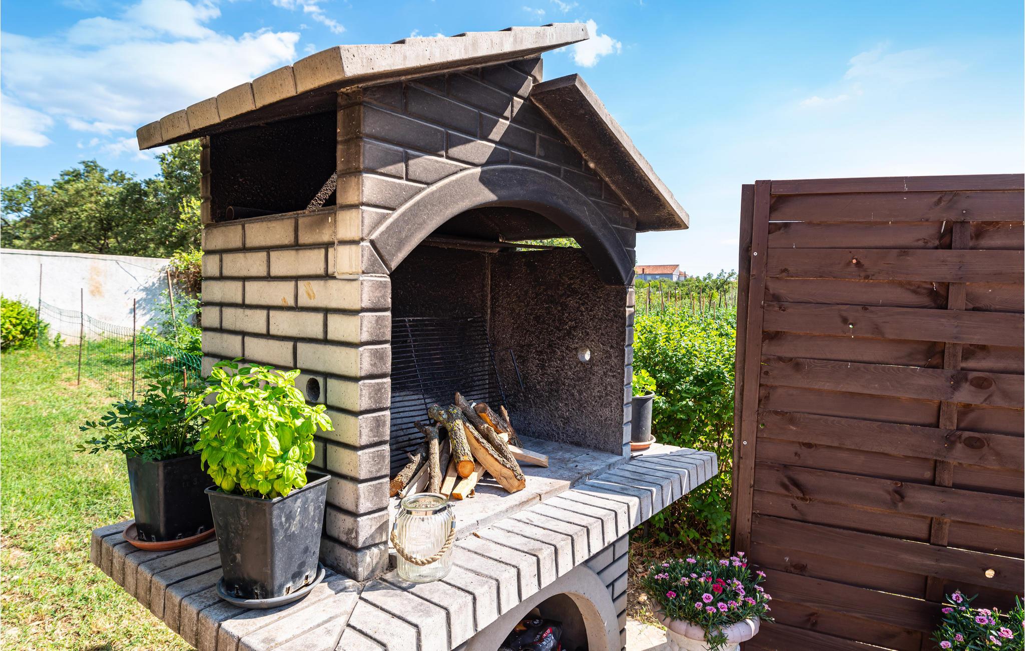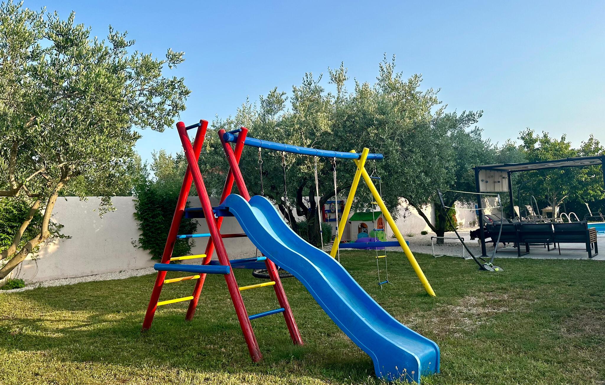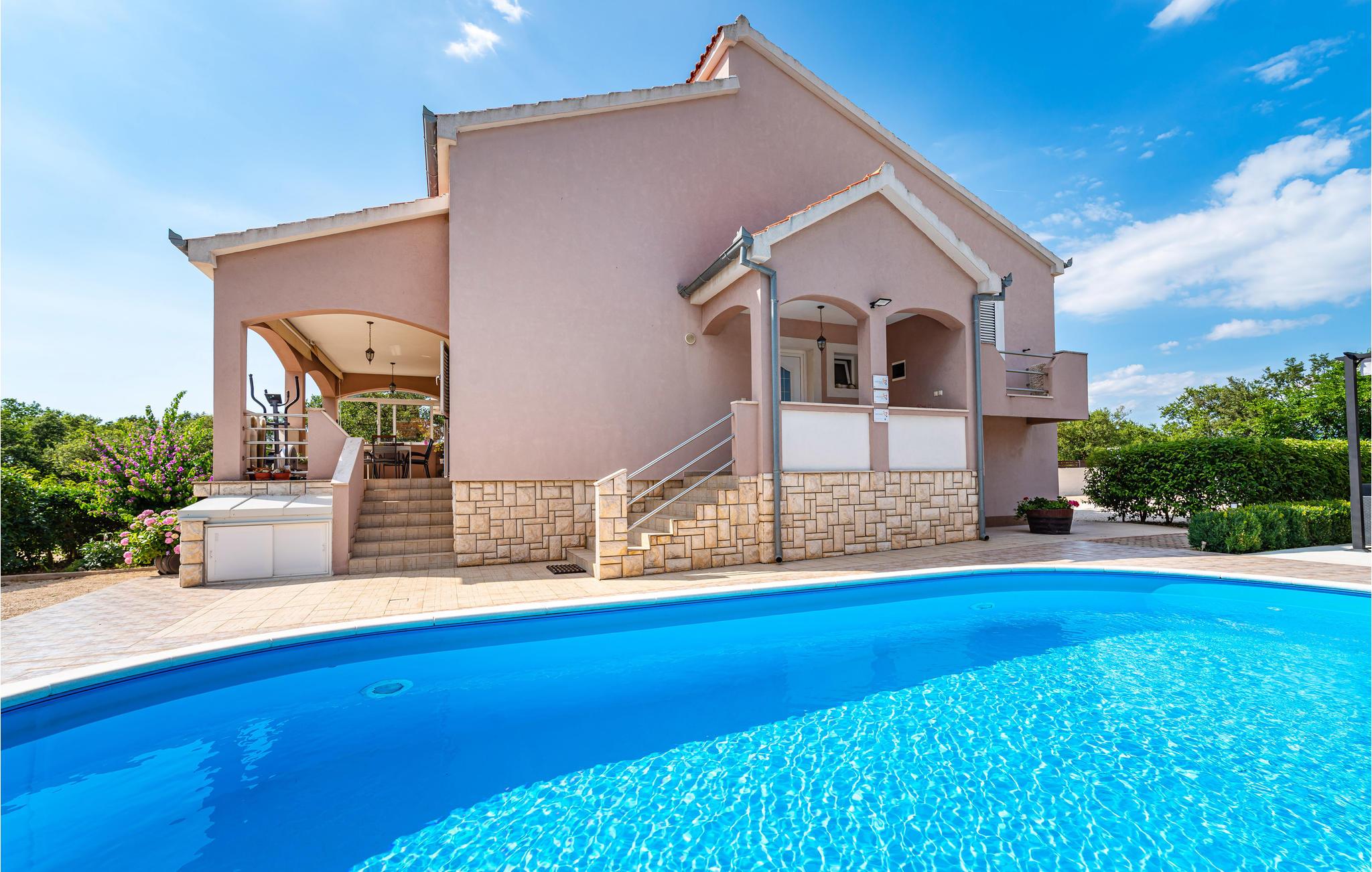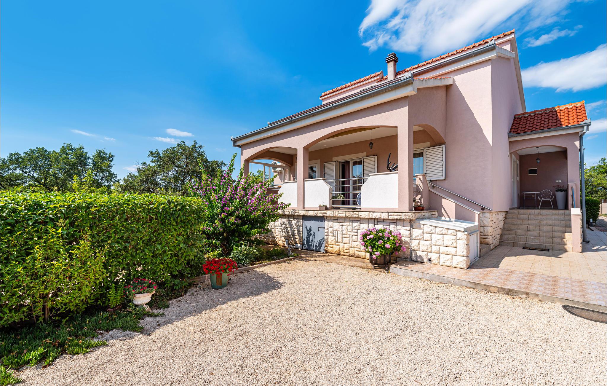 Dette skønne og moderne feriehus ligger lige ved motorvejen, så her er det hurtigt og nemt at nå regionens berømte og attraktive seværdigheder, fx de mange nationalparker. Den rummelige, overdækkede terrasse, indbyder til at hygge sig sammen, måske med et glas af den lokale, fremragende vin. I kan også nyde ferielivet i den store og velplejede have, med velduftende mediterrane planter. Ikke nok med det, her er også en en udendørs pool, samt en legeplads, hvor de små kan få lang tid til at gå. Jeres ejer bor også på grunden, ca. 30 m væk. Der er otte km til nærmeste strand, hvor I kan svømme en tur i havet. Smut også en tur til Zadar, med sine seværdigheder: Havorgelet og Hilsen til solen og utallige restauranter, kendt for sine velsmagende retter, inspireret af det sunde mediterrane køkken.