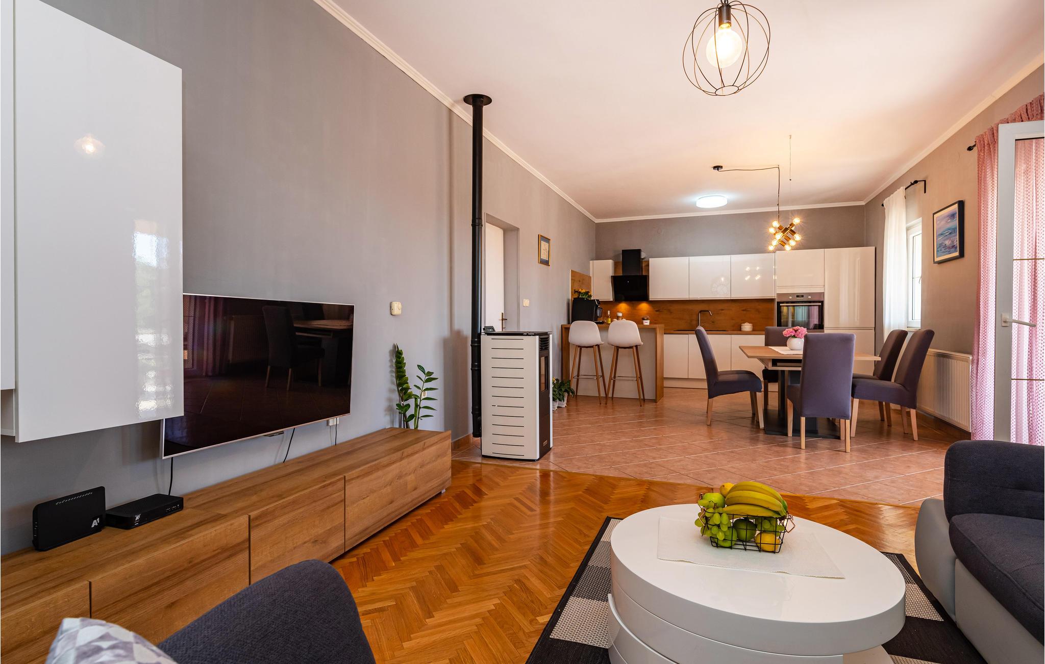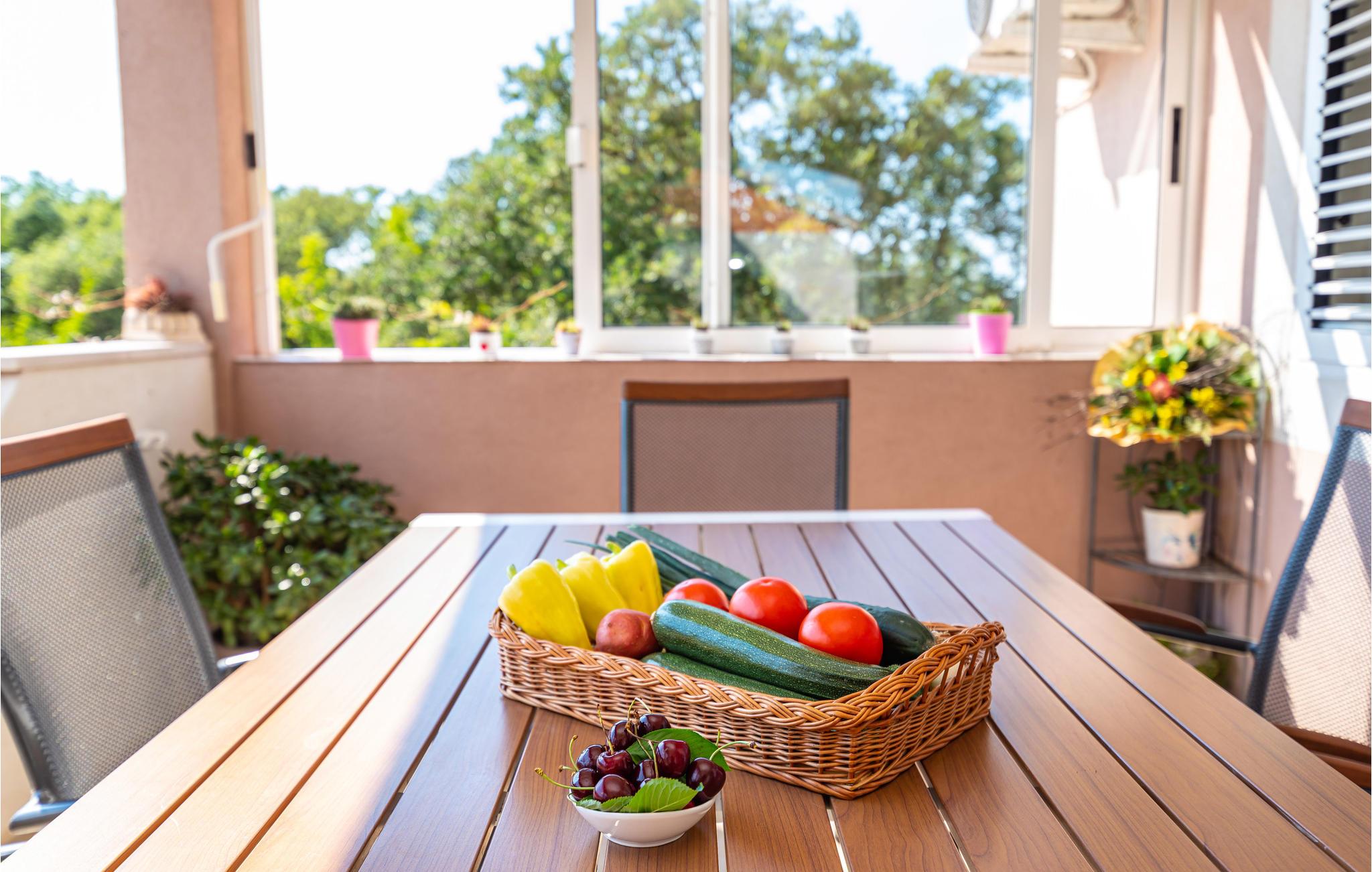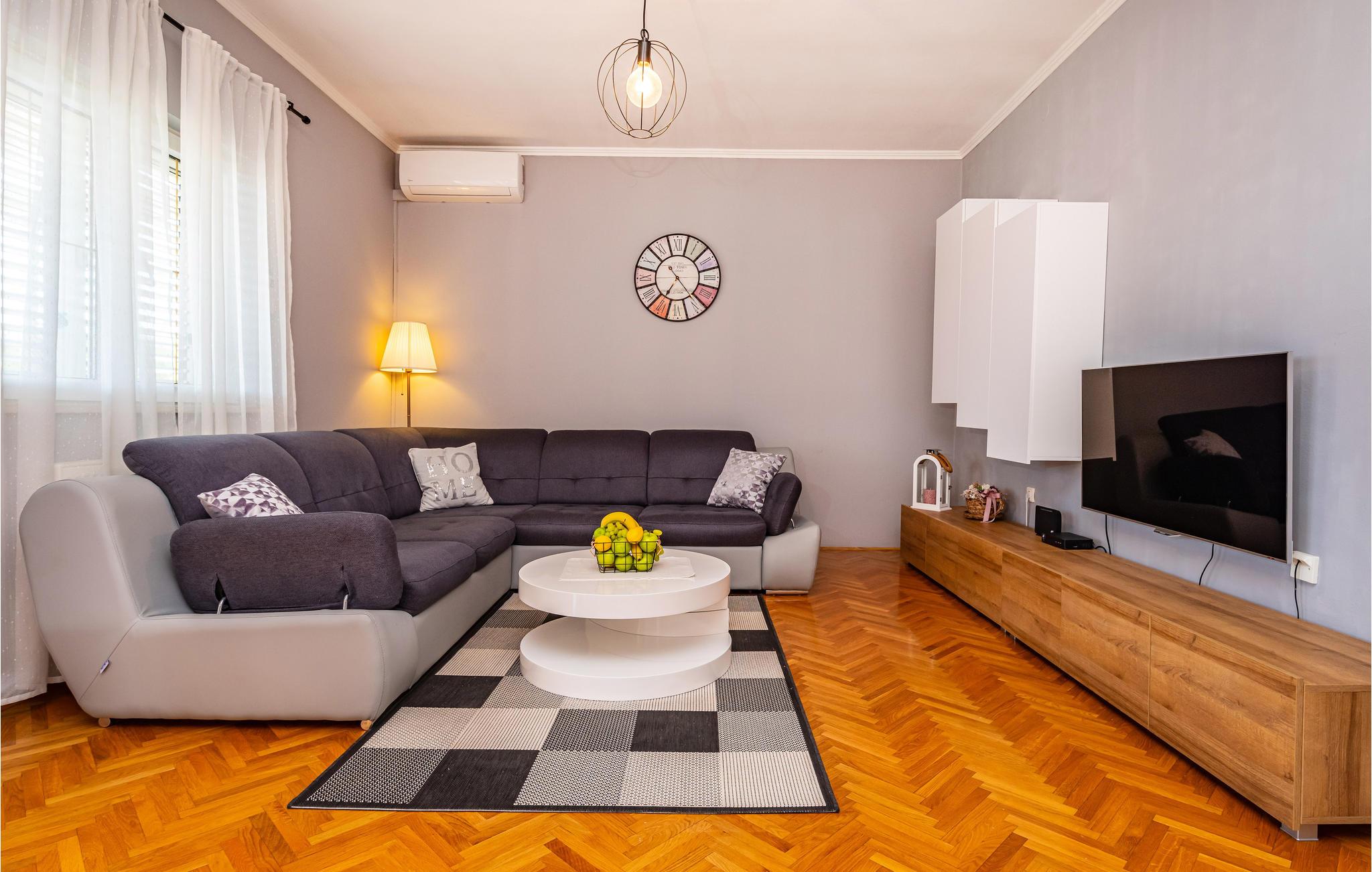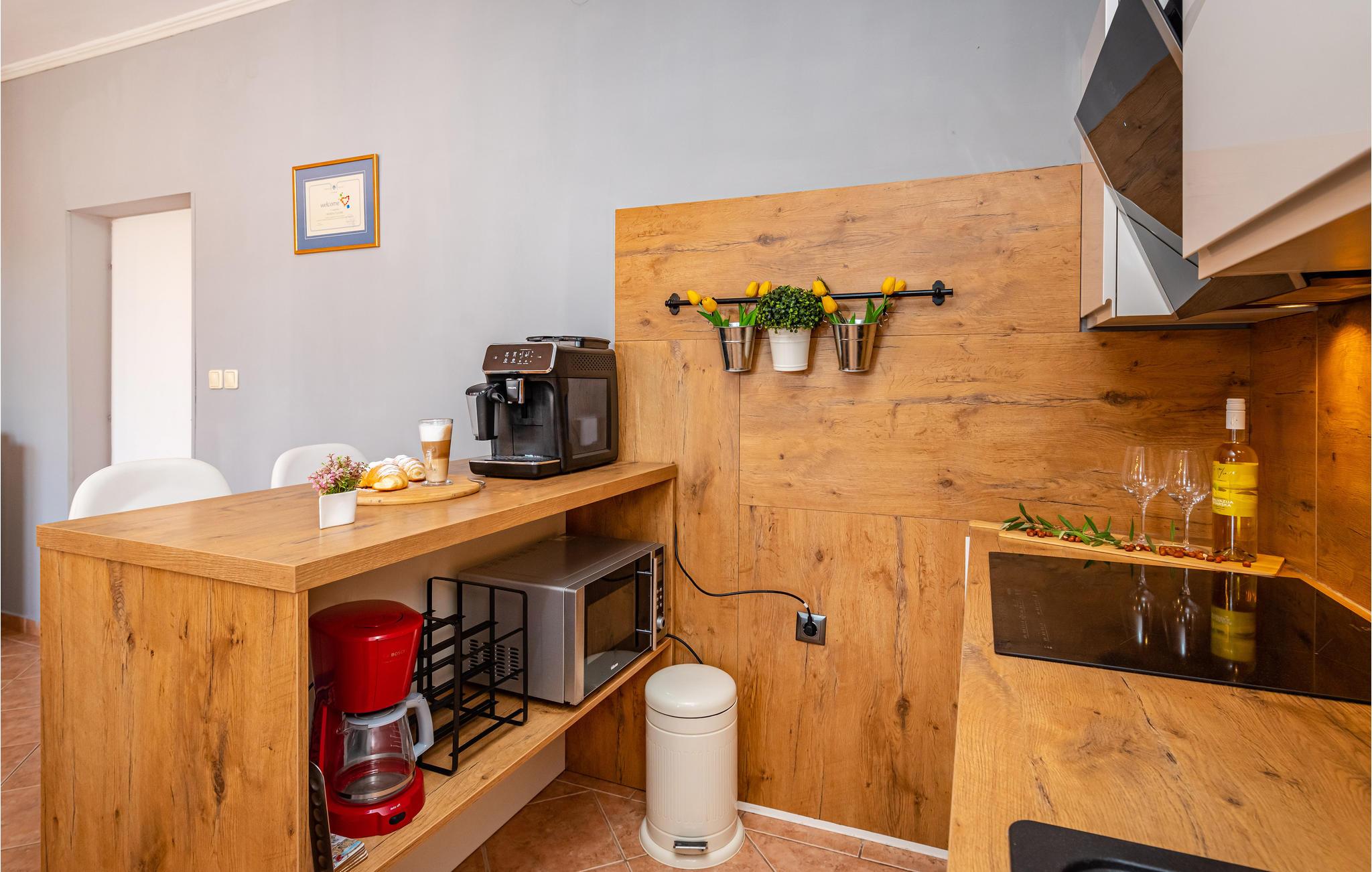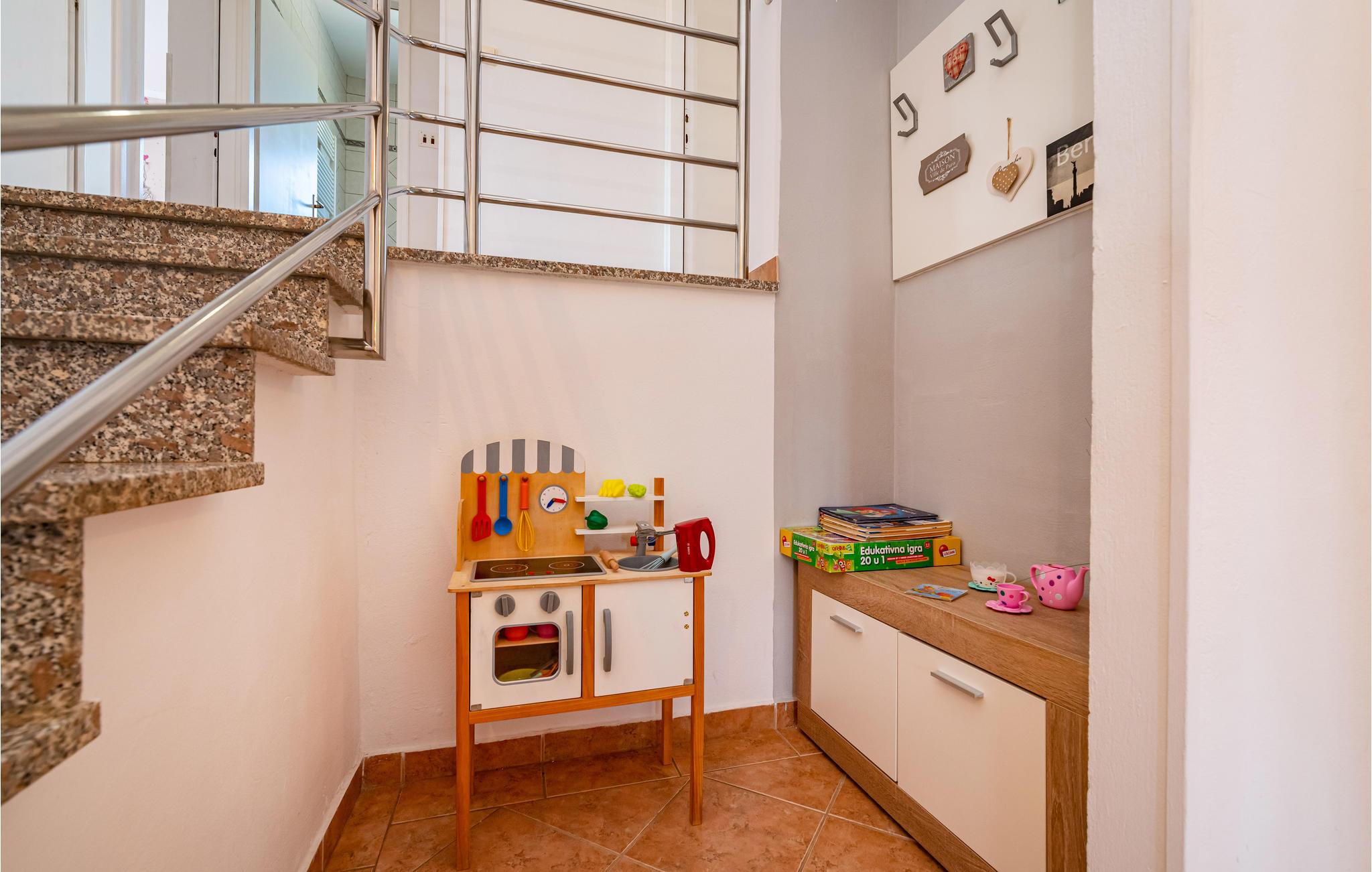 Dette skønne og moderne feriehus ligger lige ved motorvejen, så her er det hurtigt og nemt at nå regionens berømte og attraktive seværdigheder, fx de mange nationalparker. Den rummelige, overdækkede terrasse, indbyder til at hygge sig sammen, måske med et glas af den lokale, fremragende vin. I kan også nyde ferielivet i den store og velplejede have, med velduftende mediterrane planter. Ikke nok med det, her er også en en udendørs pool, samt en legeplads, hvor de små kan få lang tid til at gå. Jeres ejer bor også på grunden, ca. 30 m væk. Der er otte km til nærmeste strand, hvor I kan svømme en tur i havet. Smut også en tur til Zadar, med sine seværdigheder: Havorgelet og Hilsen til solen og utallige restauranter, kendt for sine velsmagende retter, inspireret af det sunde mediterrane køkken.