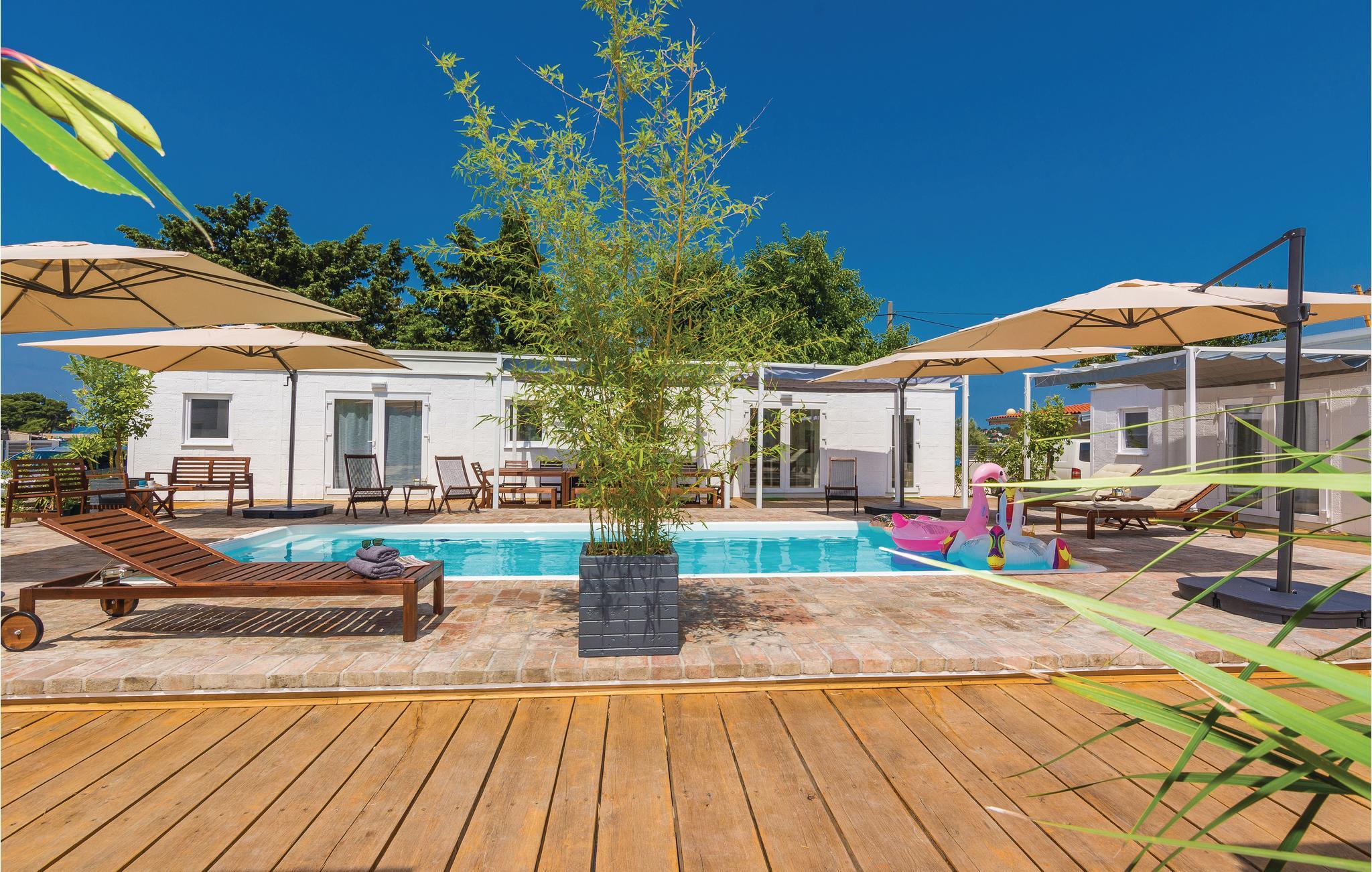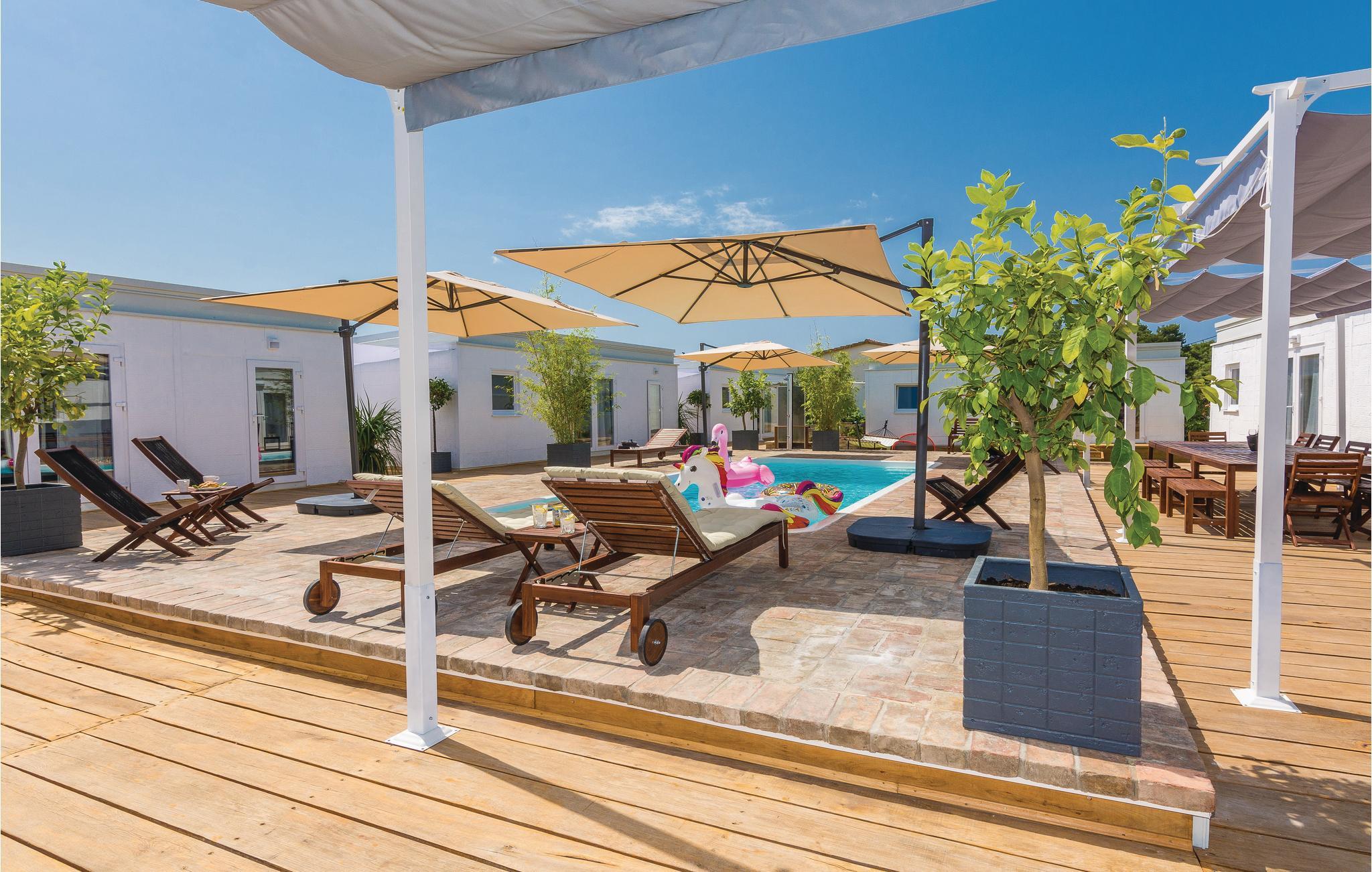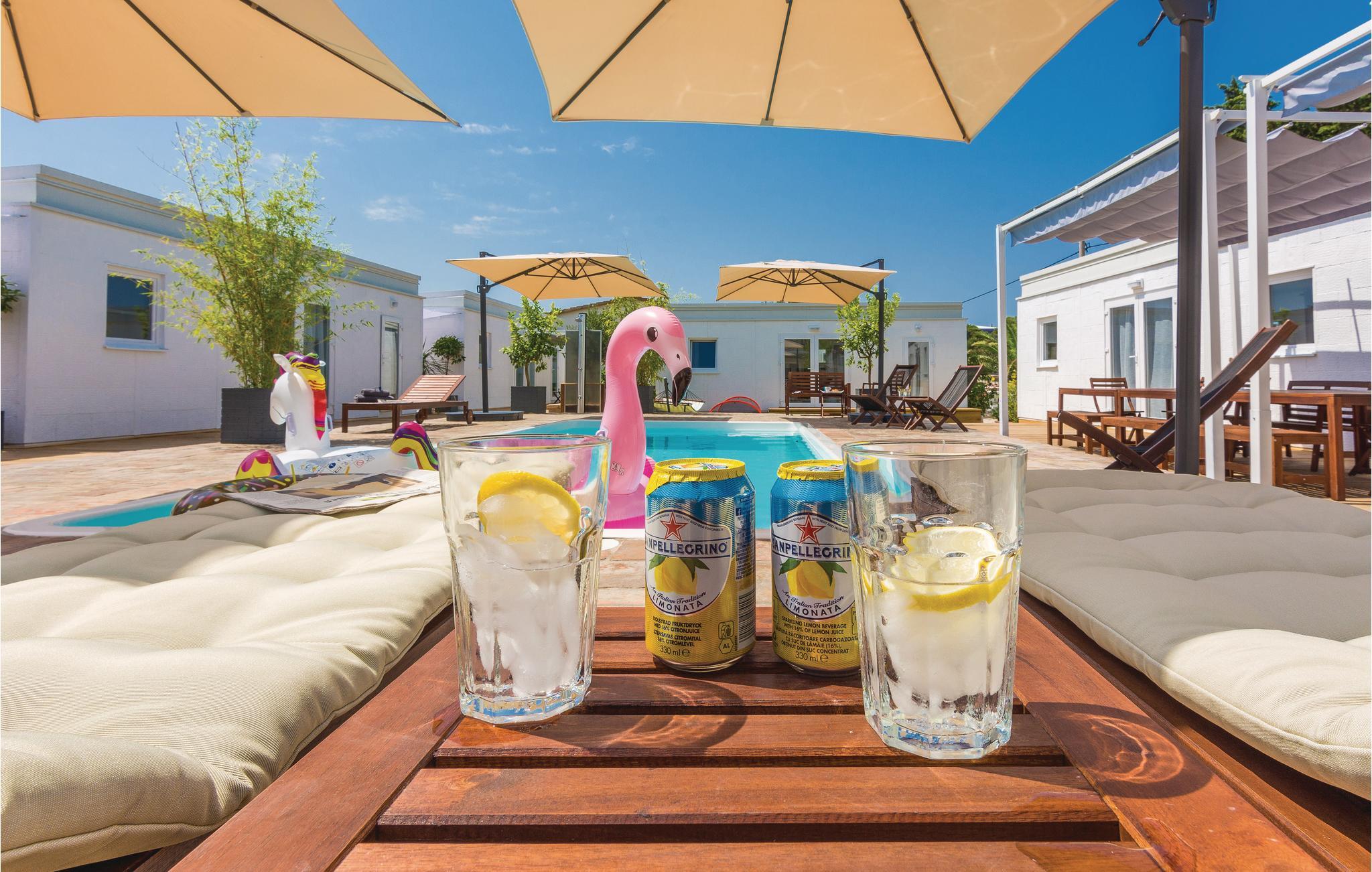 Dette nydelige feriehus byder på flere specielle elementer som I vil sætte pris på i jeres uforglemmelige ferie. Huset ligger ved en skøn kieselstrand, og byder på en indhegnet grund med pool, solsenge, havemøbler og børnelegetøj. Her er masser af privatliv. Huset består af seks separate boligenheder. I de fem har soveværelset eget badeværelse, tv, og klimaanlæg. I den sjette lejlighed, som er den største, ligger køkken og opholdsstue til jeres fælles stunder. Et af soveværelserne ligger en suite. Der er ikke langt til egnens forskellige forlystelser.