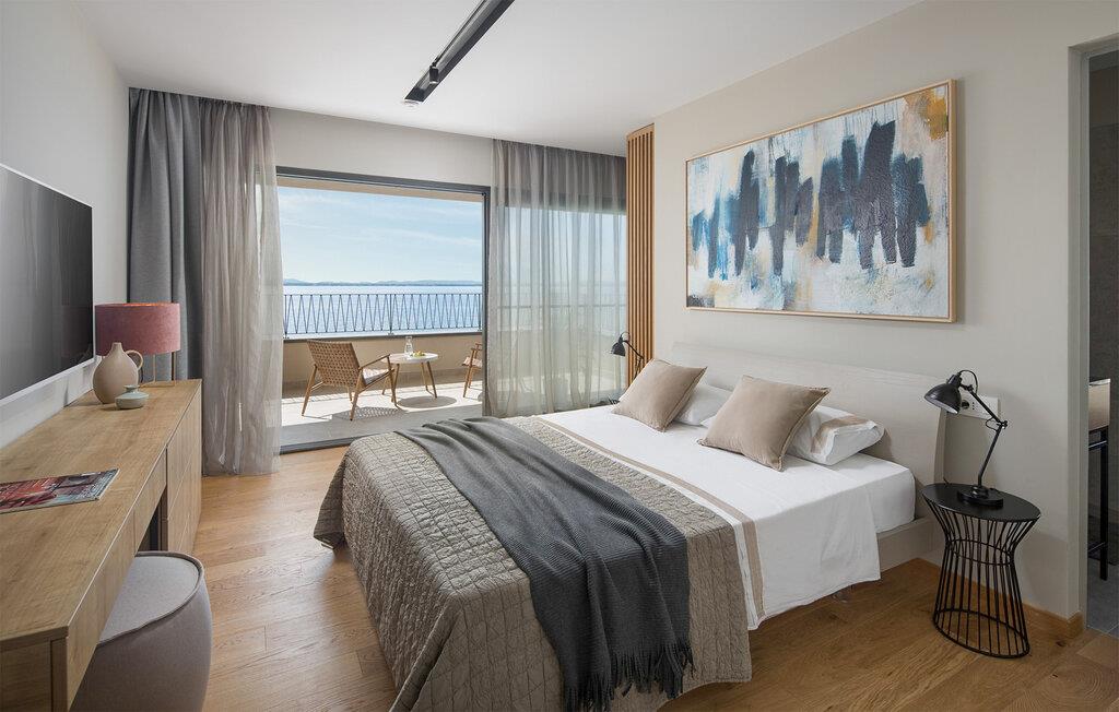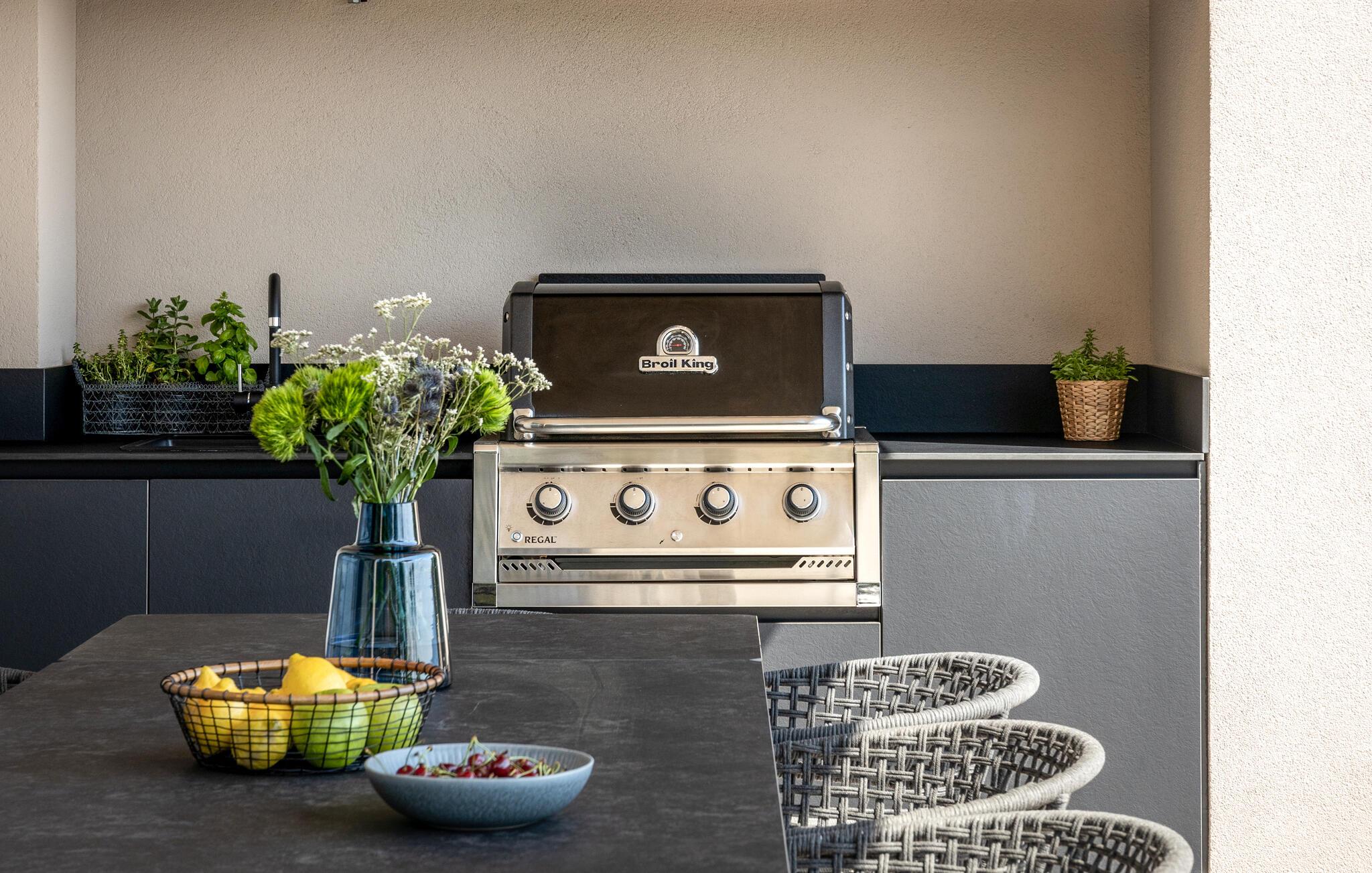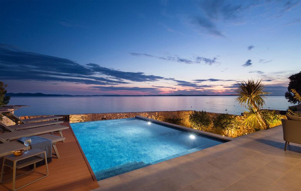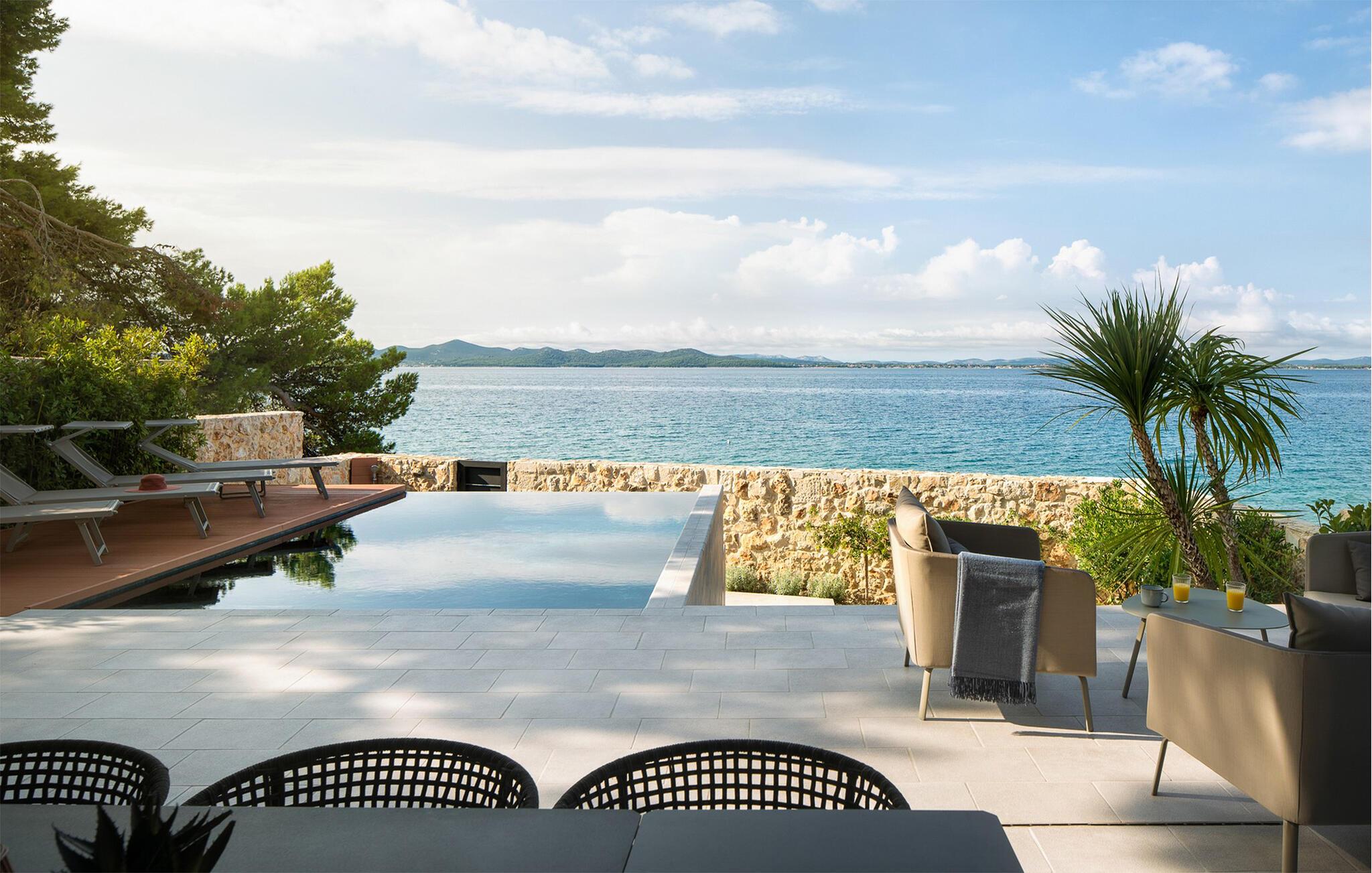 Dit fortryllende udendørsområde har udsigt over det azurblå Adriaterhav. Start jeres dag med en afslappet morgenmad på terrassen, lad batterierne op på liggestolene og tag en dukkert i den opvarmede infinity-pool. Tænd op i grillen og oplev uforglemmelige aftener med vin og stearinlys.