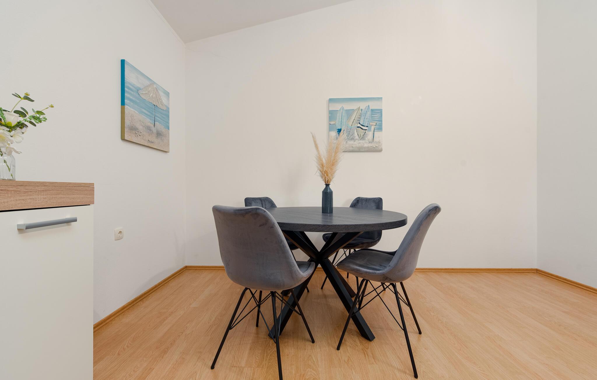 De to enkelt og funktionelt indrettede ferielejligheder ligger i den lille landsby Podgradini. De ligger på første sal og deler en terrasse og en fælles hovedindgang. Få kilometer fra lejligheden ligger stranden hvor også den lille kirke St. Duh findes. Den er kendt for at være bygget ude på en lille ø, som kan besøges via en gangbro. Også Zadar med de mange seværdigheder er inden for overkommelig rækkevidde. Et besøg i den nærliggende Nationalpark Starigrad Paklenica bør man også unde sig selv, og for dem der elsker vild og uberørt natur er en safari i Velebit bjergene, eller en rafting tur på Zmanja floden oplagt. Om aftenen skal I forkæle jer selv med god mad på en af regionens mange lækre restauranter, hvor der både serveres lokale specialiteter og mere internationale retter fra det mediterrane køkken.