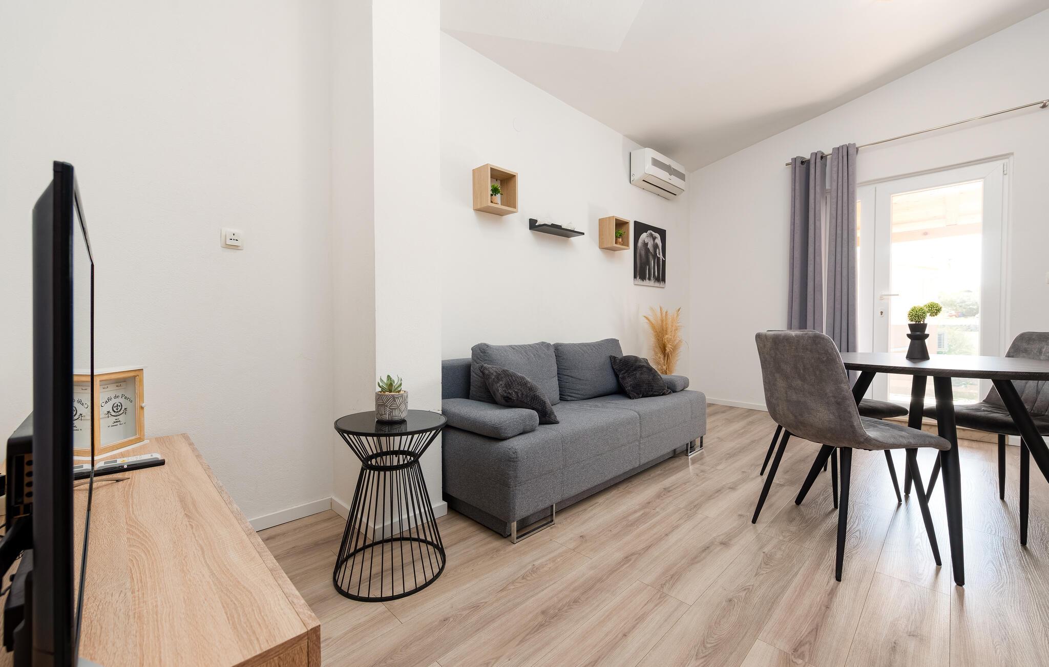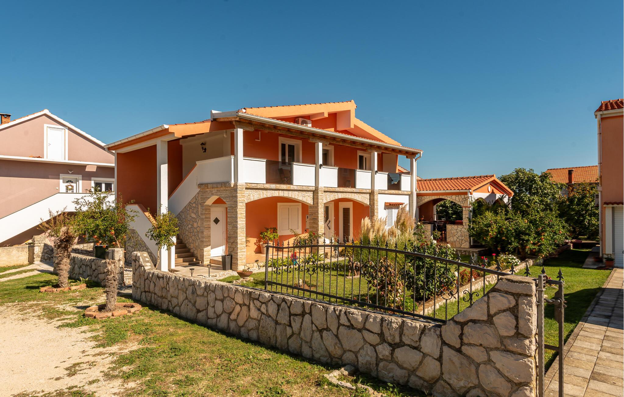 De to enkelt og funktionelt indrettede ferielejligheder ligger i den lille landsby Podgradini. De ligger på første sal og deler en terrasse og en fælles hovedindgang. Få kilometer fra lejligheden ligger stranden hvor også den lille kirke St. Duh findes. Den er kendt for at være bygget ude på en lille ø, som kan besøges via en gangbro. Også Zadar med de mange seværdigheder er inden for overkommelig rækkevidde. Et besøg i den nærliggende Nationalpark Starigrad Paklenica bør man også unde sig selv, og for dem der elsker vild og uberørt natur er en safari i Velebit bjergene, eller en rafting tur på Zmanja floden oplagt. Om aftenen skal I forkæle jer selv med god mad på en af regionens mange lækre restauranter, hvor der både serveres lokale specialiteter og mere internationale retter fra det mediterrane køkken.
