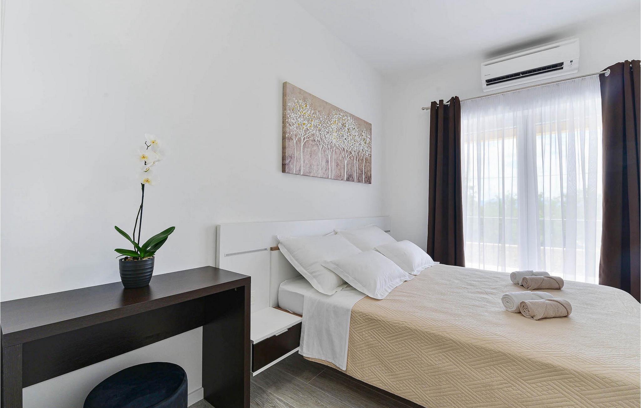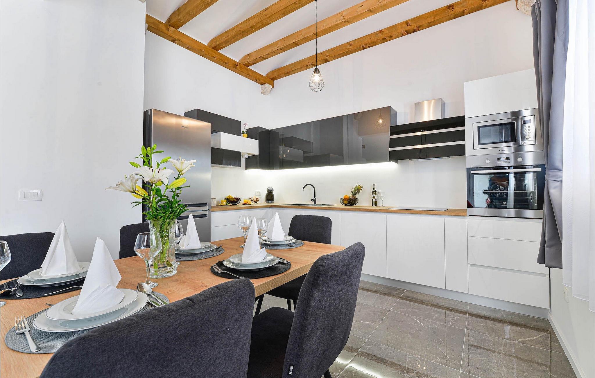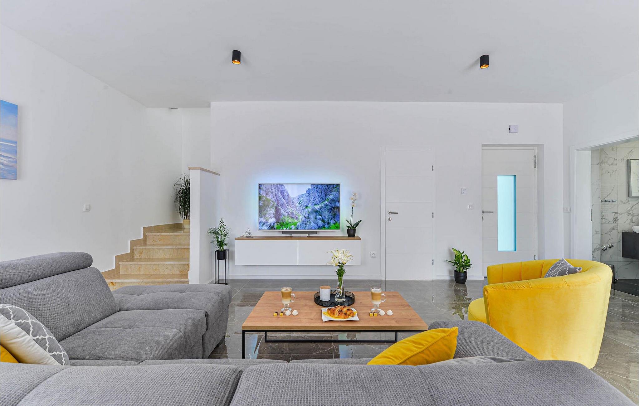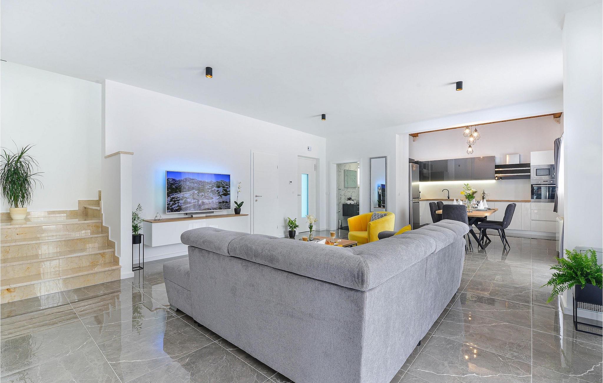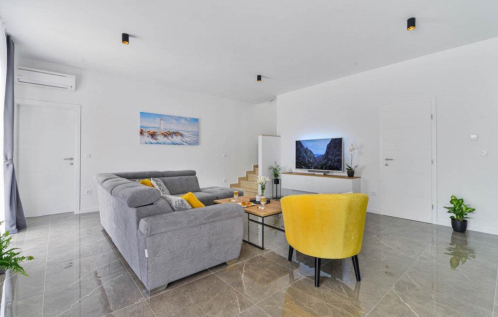 Hvis du leder efter en villa til en fredelig ferie, er Villa Banovi, et stenhus tæt på havet, det ideelle valg for dig. Den charmerende villa byder på tre soveværelser for op til otte gæster. På første sal i villaen er der to soveværelser. Begge værelser er rummelige, lyse og komfortable. Hvert værelse har aircondition, eget badeværelse, dobbeltseng, tv og udgang til balkonen. I stueetagen af villaen finder du et soveværelse med aircondition og eget badeværelse, en dobbeltseng og et tv. Stueetagen byder også på en stue med tv og en sofa, der kan rumme yderligere to personer. Stuen er forbundet med spisestuen og et fuldt udstyret rummeligt køkken i et åbent rum koncept. Hele dette rum har aircondition.