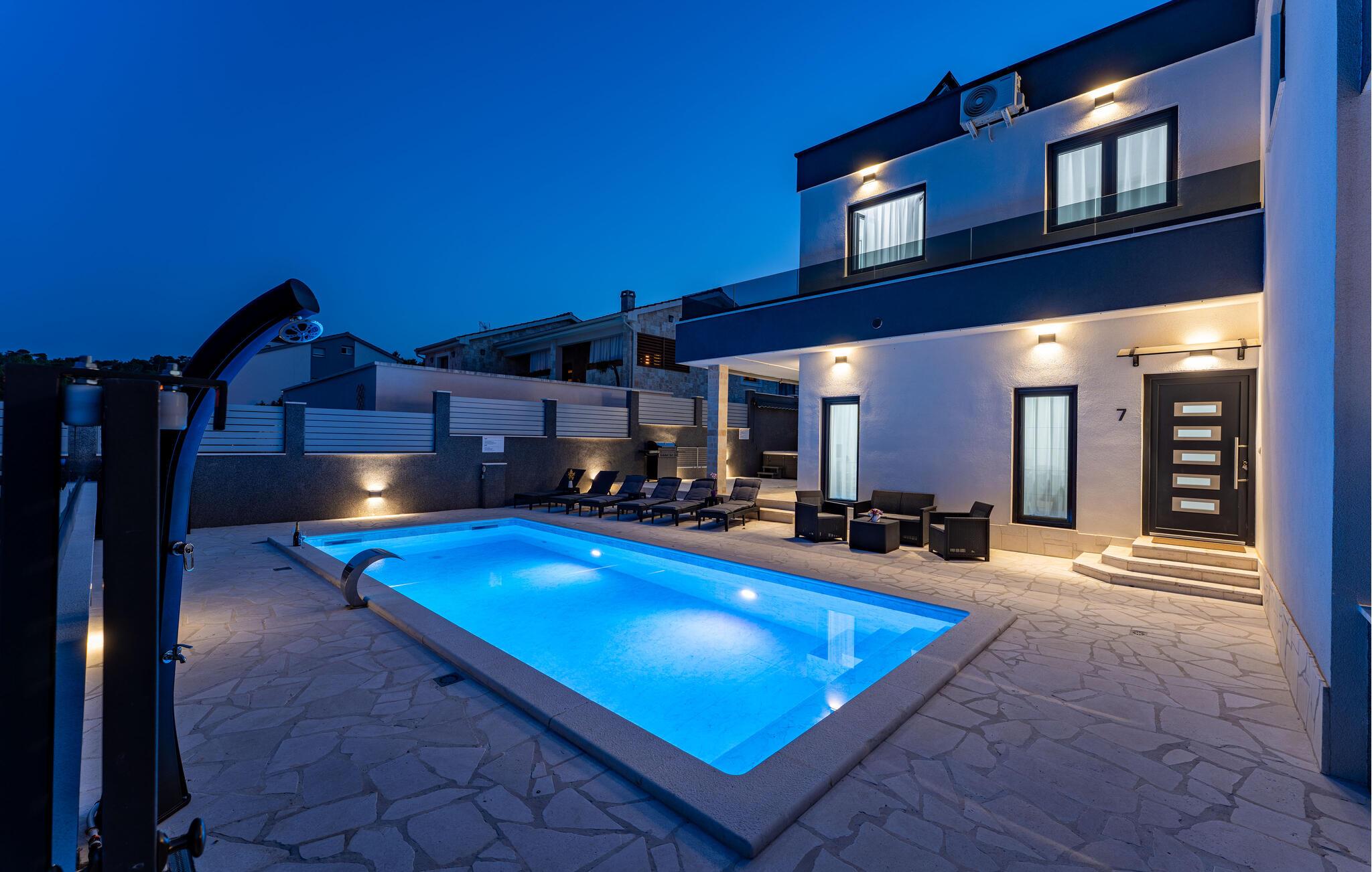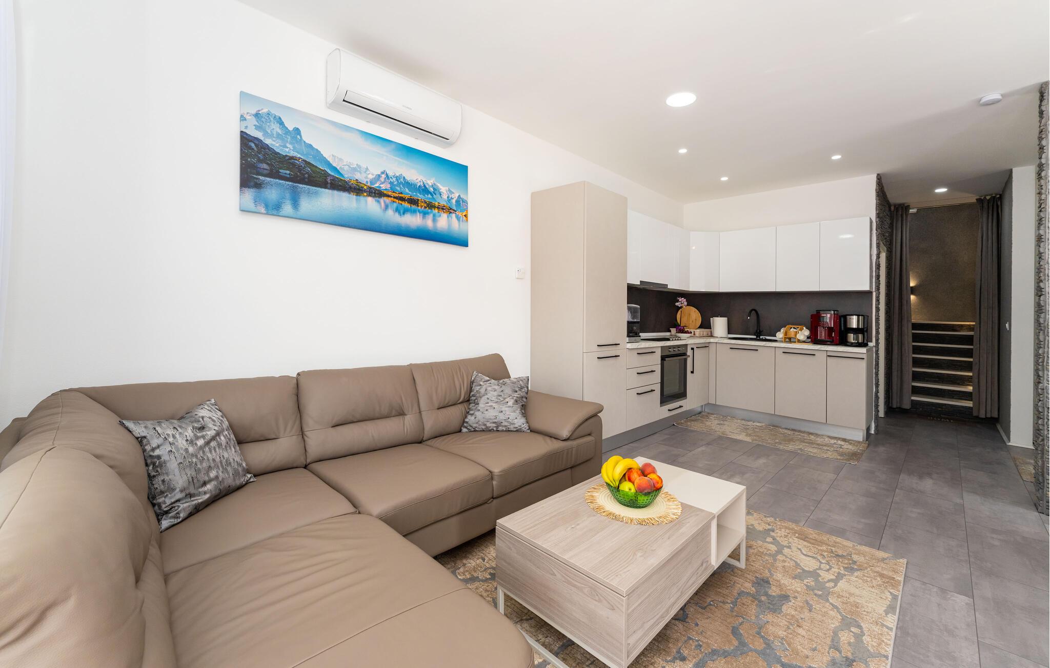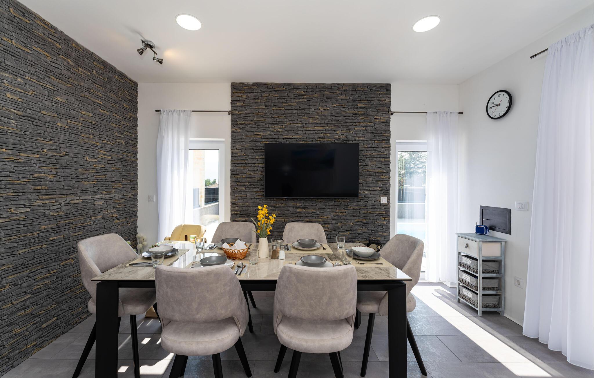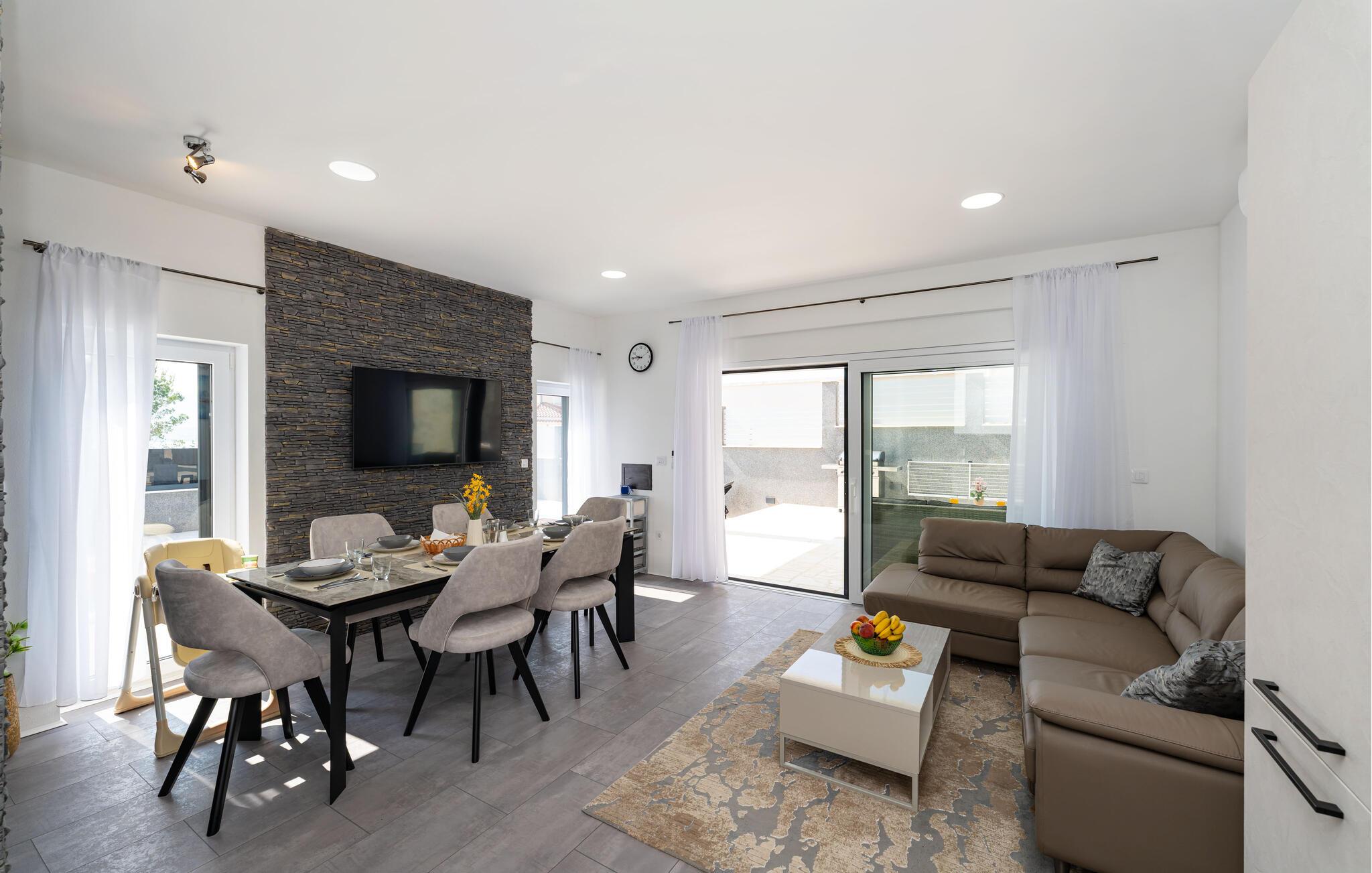 Denne rummelige villa vil forkæle jer med sit interiør med lækre kvalitetsløsninger og sin behagelige boligatmosfære. Fremstil kroatiske retter i det åbne køkken, mens I snakker med familien, og nyd stilfulde måltider ved det indbydende spisebord. Om aftenen kan I hygge jer sammen i den store sofagruppe og streame en spændende film.