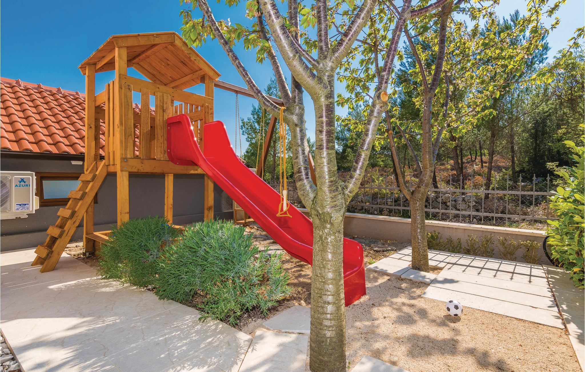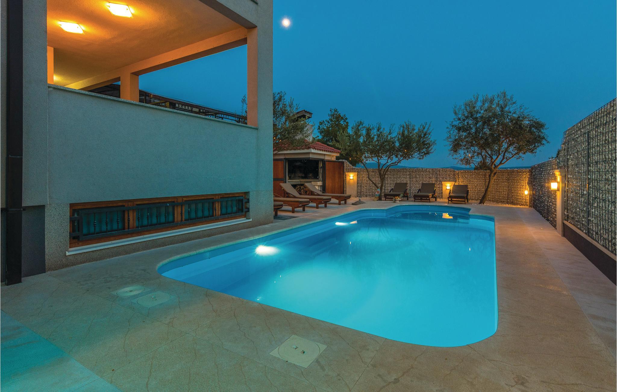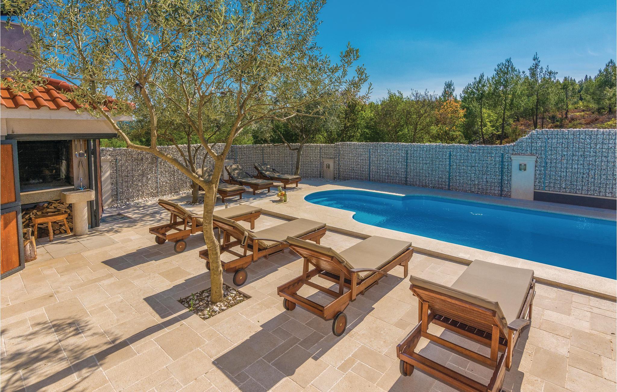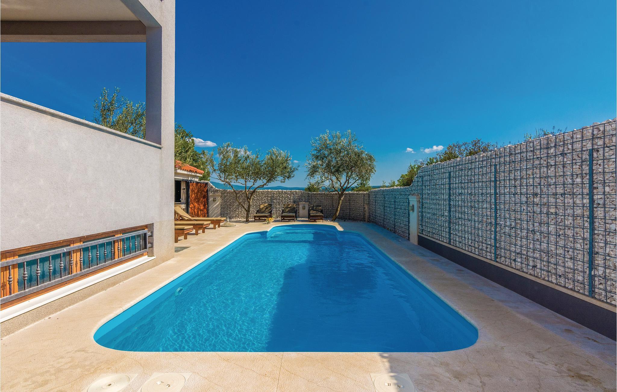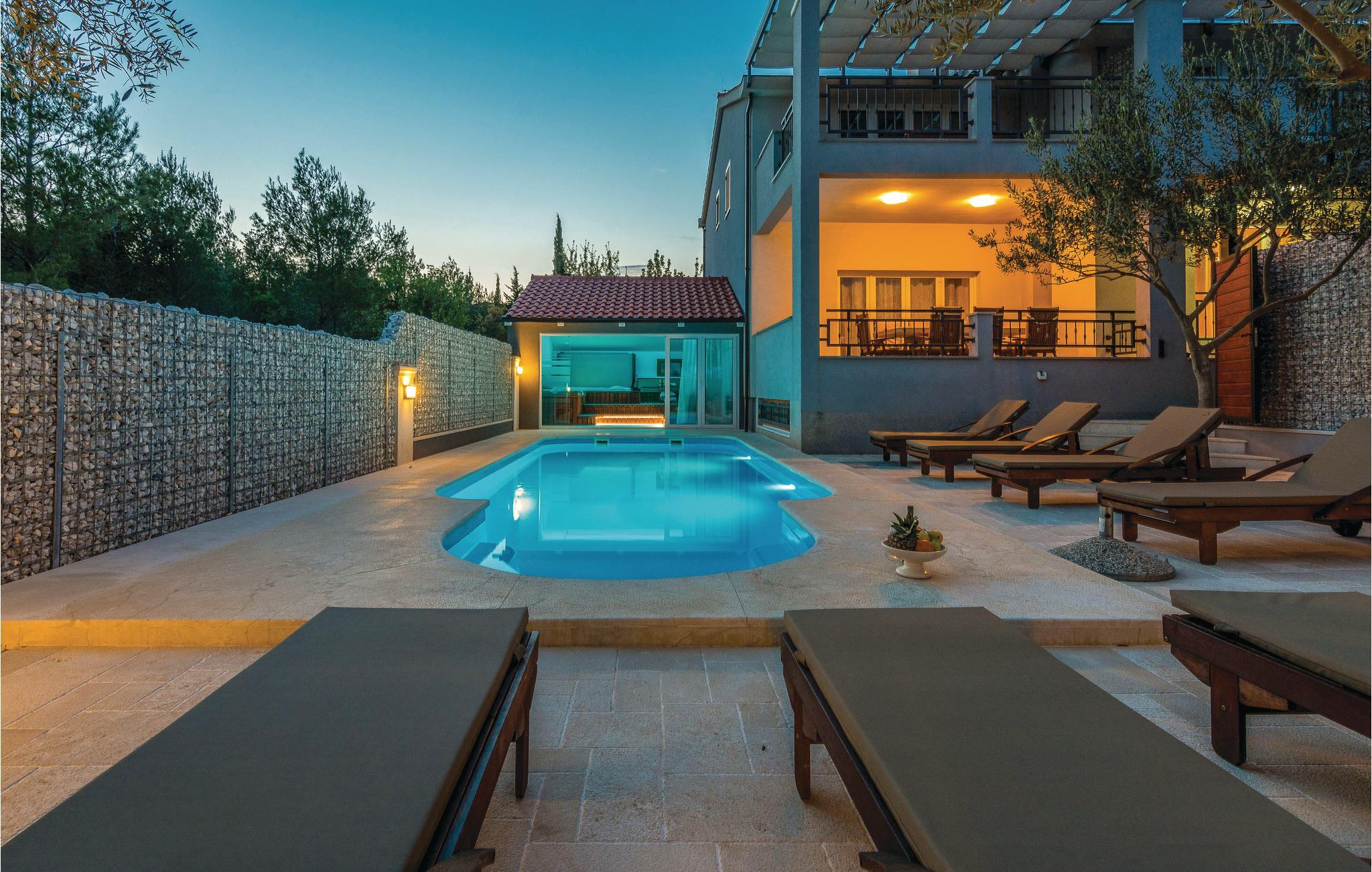 Moderne feriehus med pool og smuk udsigt til det grønne landskab og havet. Et ideelt feriemål for familier eller grupper af venner da huset rummer tre separate lejligheder. I stuen ligger en lejlighed med fire soveværelser, mens der ovenpå ligger to lejligheder med hhv. to soveværelser. Ydertrapper, laveste loftshøjde ca. 180 cm. Fra terrasserne i overetagen har I panoramaudsigt til havet, mens poolen med solsenge, grill og endnu en overdækket terrasse ligger i stuen, samt en konoba, et rum hvor I kan slappe af og hygge jer sammen. I underetagen, med adgang af en udendørs trappe, er der også et rum hvor der er billardbord samt et andet med en whirlpool. Tag også på rafting på floden Zrmanja eller på safari i Velebit-bjergene.