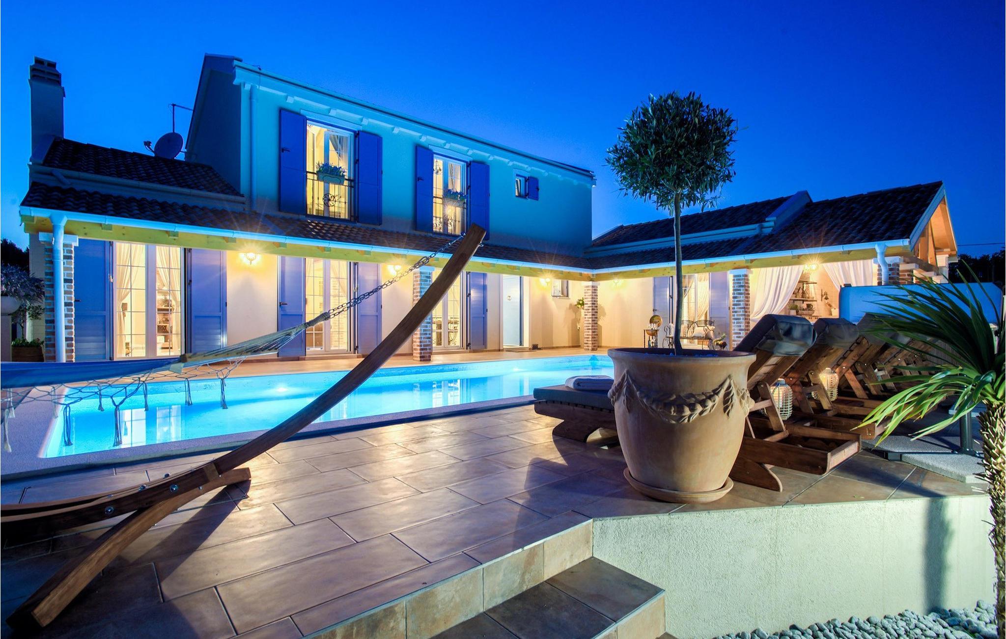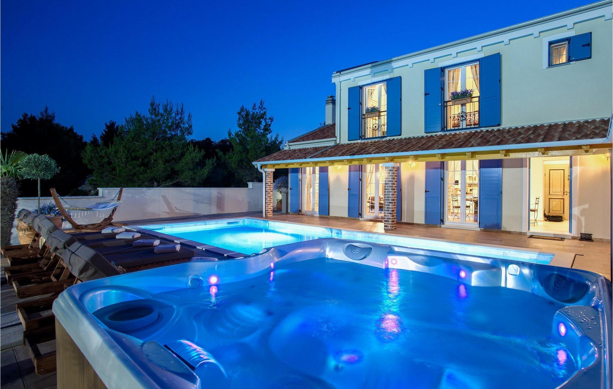 Villa Mek er virkelig en af slagsen! Villaen byder på alt hvad du kan få brug for under din ferie, både inde og ude. I stueetagen i åben plan finder du et fuldt udstyret køkken, en hyggelig stue og en spisestue med plads til 8 gæster. Stueetagen har direkte adgang til terrassen og villaens store have. I alt er der 3 luksusværelser. En af dem ligger i stueetagen, de to andre er ovenpå. For at gøre din ferie endnu mere luksuriøs har hvert af soveværelserne sit eget badeværelse. Allerede ved første øjekast er det tydeligt, at villaen er indrettet med omhu - opmærksomheden på detaljerne er utrolig. Men det er ikke alt! træder du udenfor, er der en indbydende swimmingpool til din rådighed, hvor du kan tilbringe dagene med at slikke solen. For at fuldende din ferie er der også en udendørs jacuzzi til din rådighed samt en sauna, som er placeret i et af badeværelserne. For dem, der kan lide at forblive aktive på deres ferie, har villaen sin egen tennisbane, der kan omdannes til en fodbold- eller basketballbane. For de mindste gæster er der også en legeplads! Hvis du vælger denne villa, er en utrolig ferie garanteret!Bådudlejning og udflugter til rådighed efter anmodning - kontakt os for mere information.