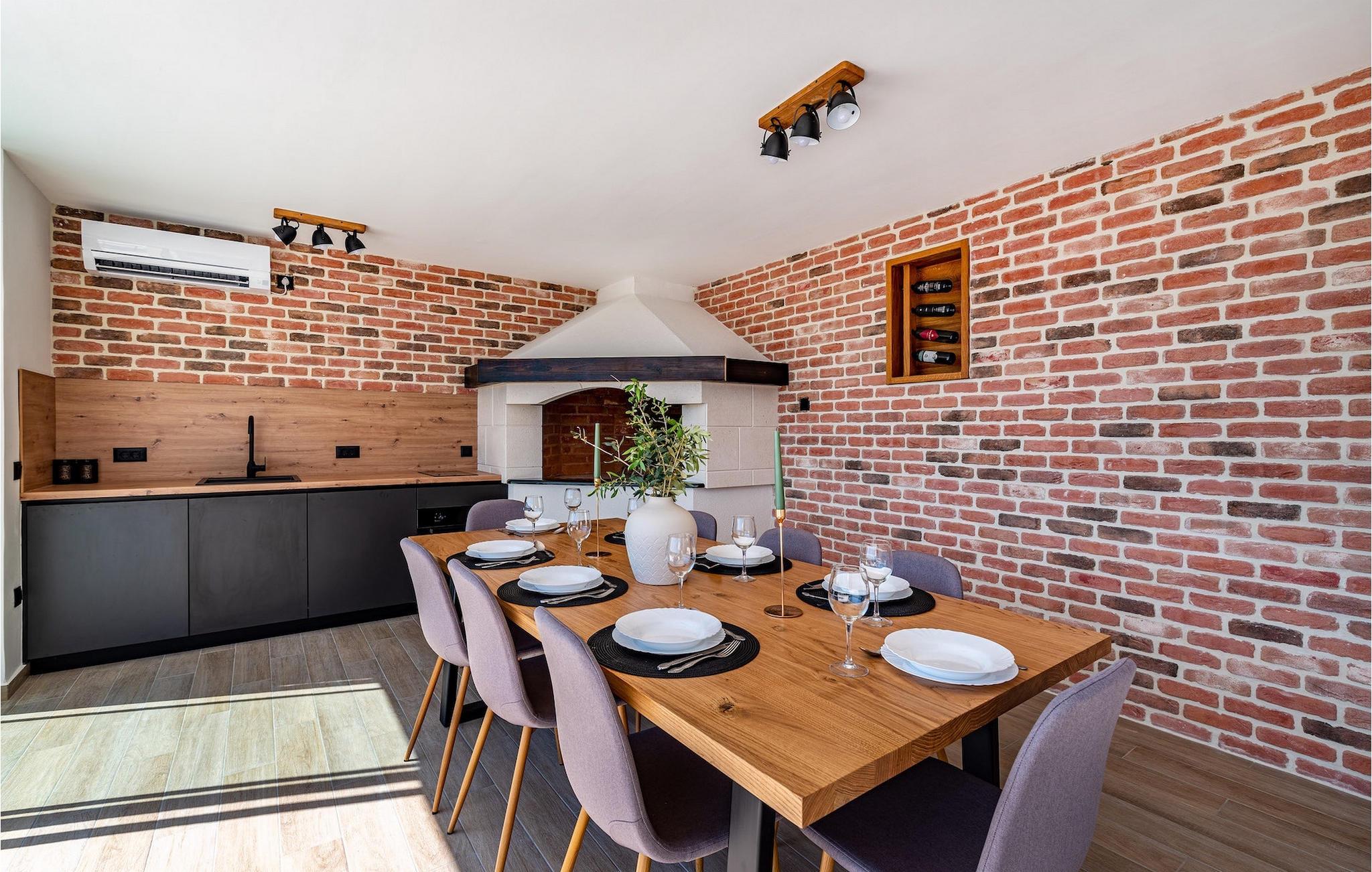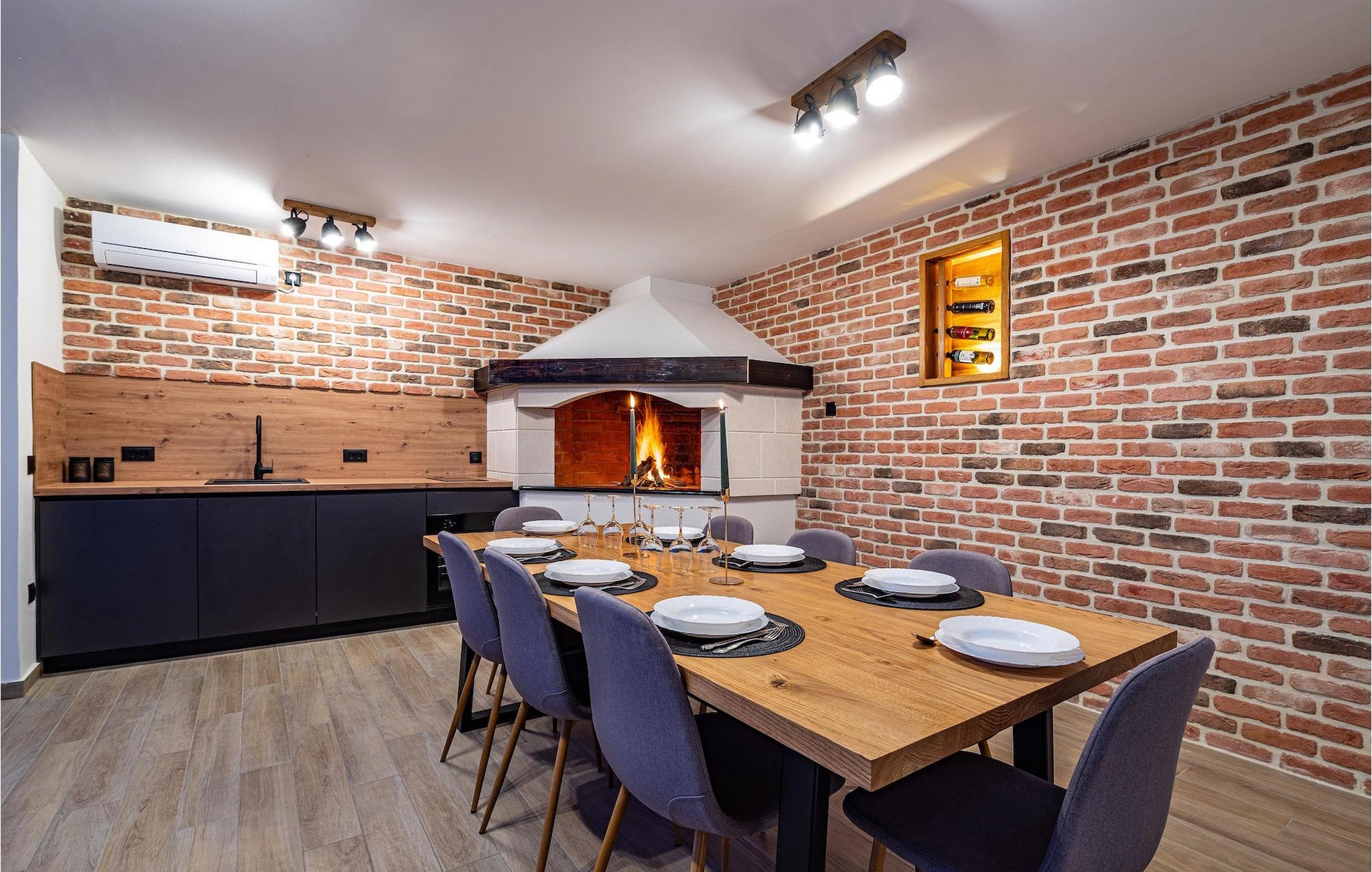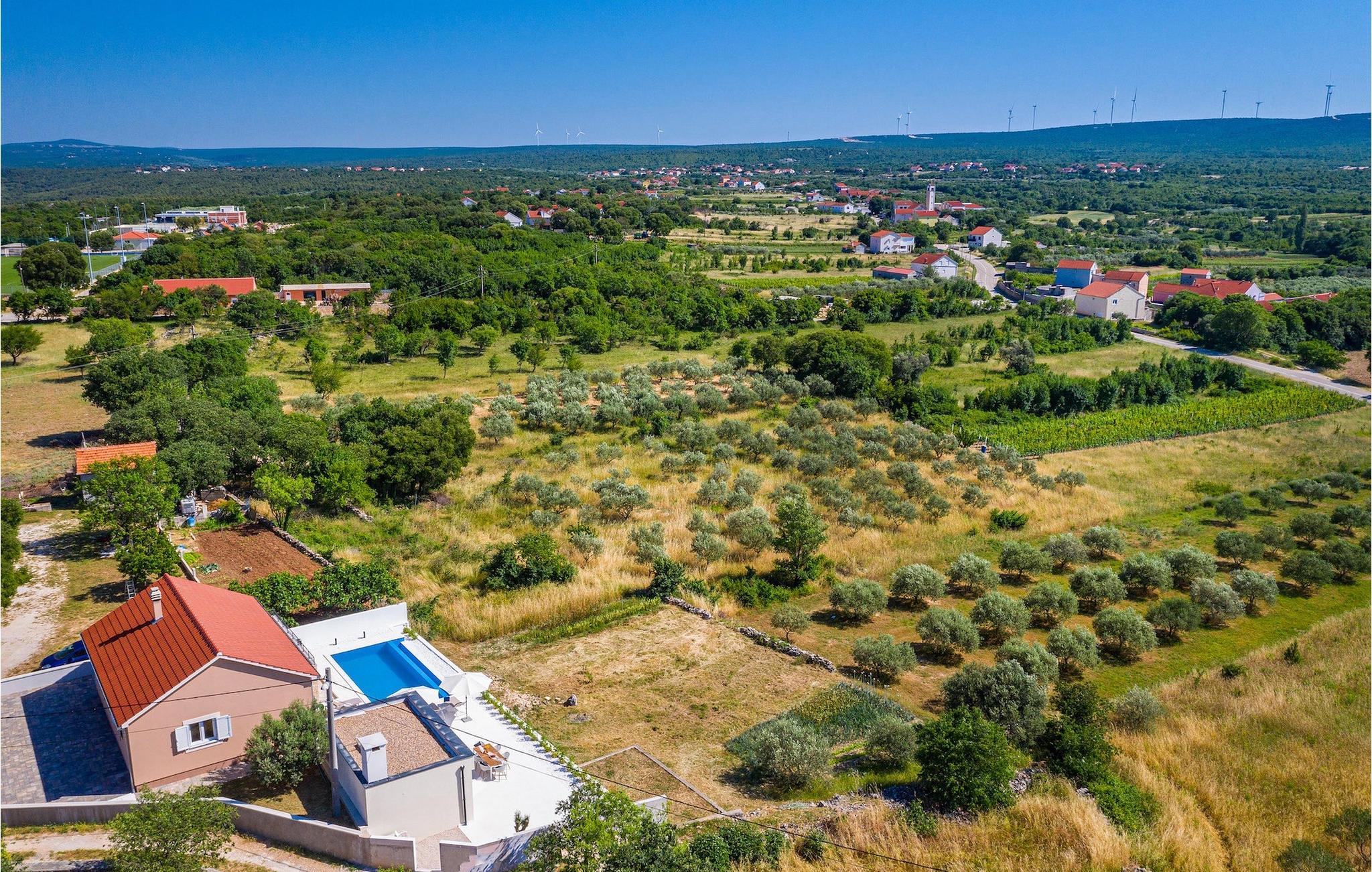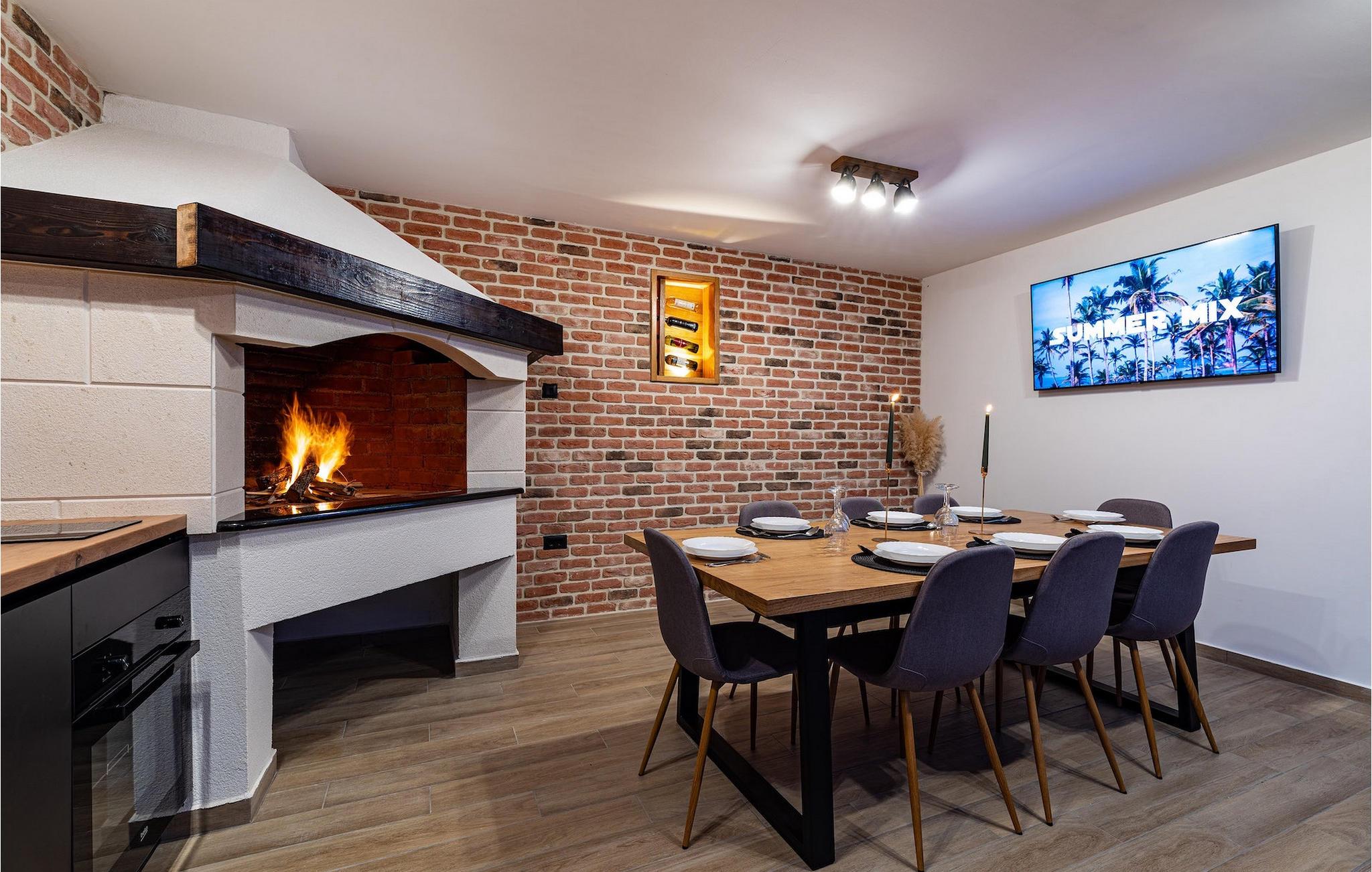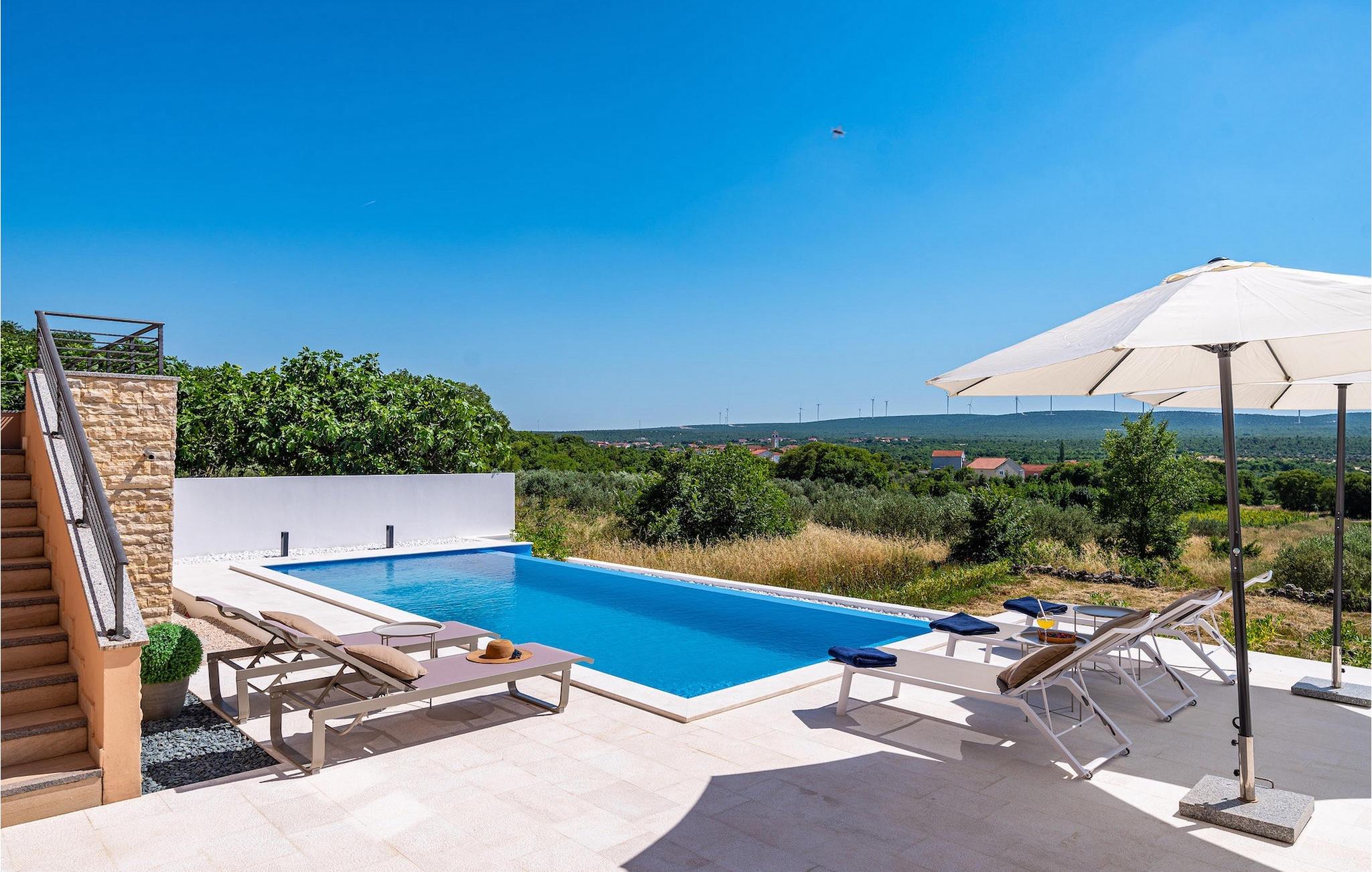 Når du ankommer til villaen, vil du først blive fortryllet af den fantastiske panoramaudsigt, før den forfriskende infinity-pool vil stjæle dit hjerte . Her vil du virkelig nyde den kroatiske sol! Komfortable liggestole er tilgængelige, så du kan slappe af i, og det veludstyrede sommerkøkken er ideelt til at afkøle forfriskende drinks eller tilberede lækre snacks på kulgrillen, mens børnene svømmer i poolen. Her findes også et separat badeværelse med toilet og bruser.