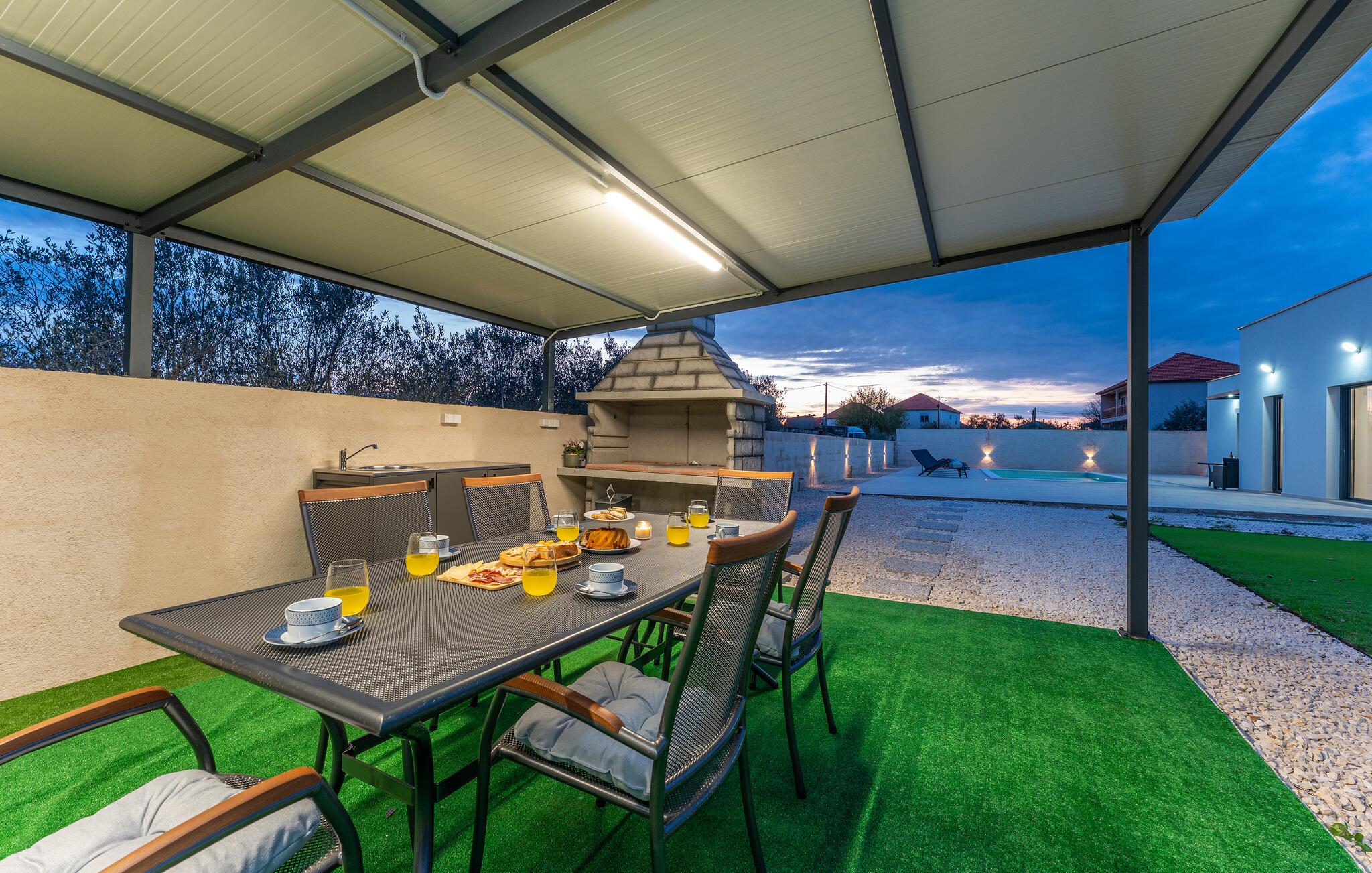 Udenfor venter en dejlig pool, hvor I kan snuppe en frisk dukkert, når I har lyst. Slap af på liggestolen, nyd et glas vin i den udendørs lounge, og nyd de lune middelhavssommernætter med stemningsfulde grillaftener.