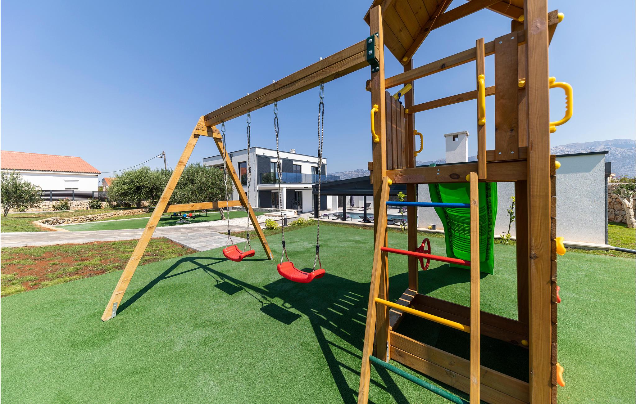 Den indhegnede have byder på flere områder. Legepladsen bliver garanteret et hit hos de små børn, og bordtennisbordet er et godt centrum for en frisk kamp. I timevis i vandet er der en indbydende swimmingpool til hele familien og et spabad til afslapning. I kan nyde jeres måltider på den overdækkede terrasse. Et stort udekøkken giver jer mulighed for at tilberede jeres ferieretter i det fri og spise sammen med familien.