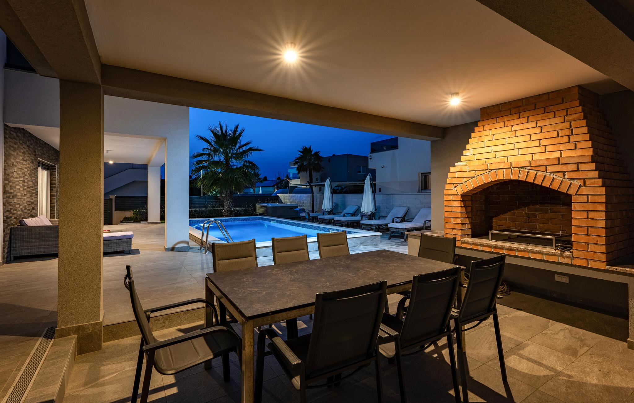 I den smukt anlagte have venter en opvarmet pool, der er stemningsfuldt oplyst om natten og giver jer mulighed for at få en frisk dukkert i dagens varmeste timer. Genoplad batterierne på de komfortable liggestole, og gør grillen klar til en hyggelig middag, mens solen går ned.
