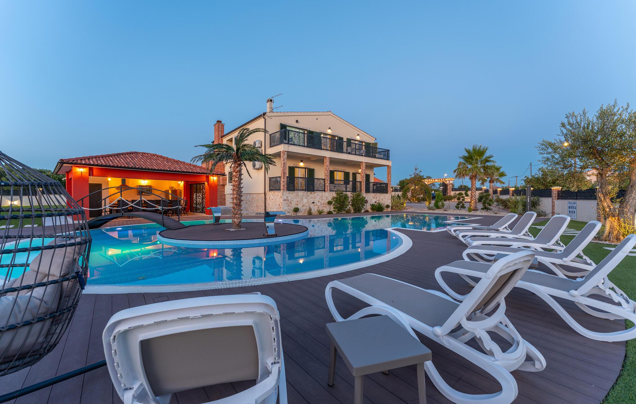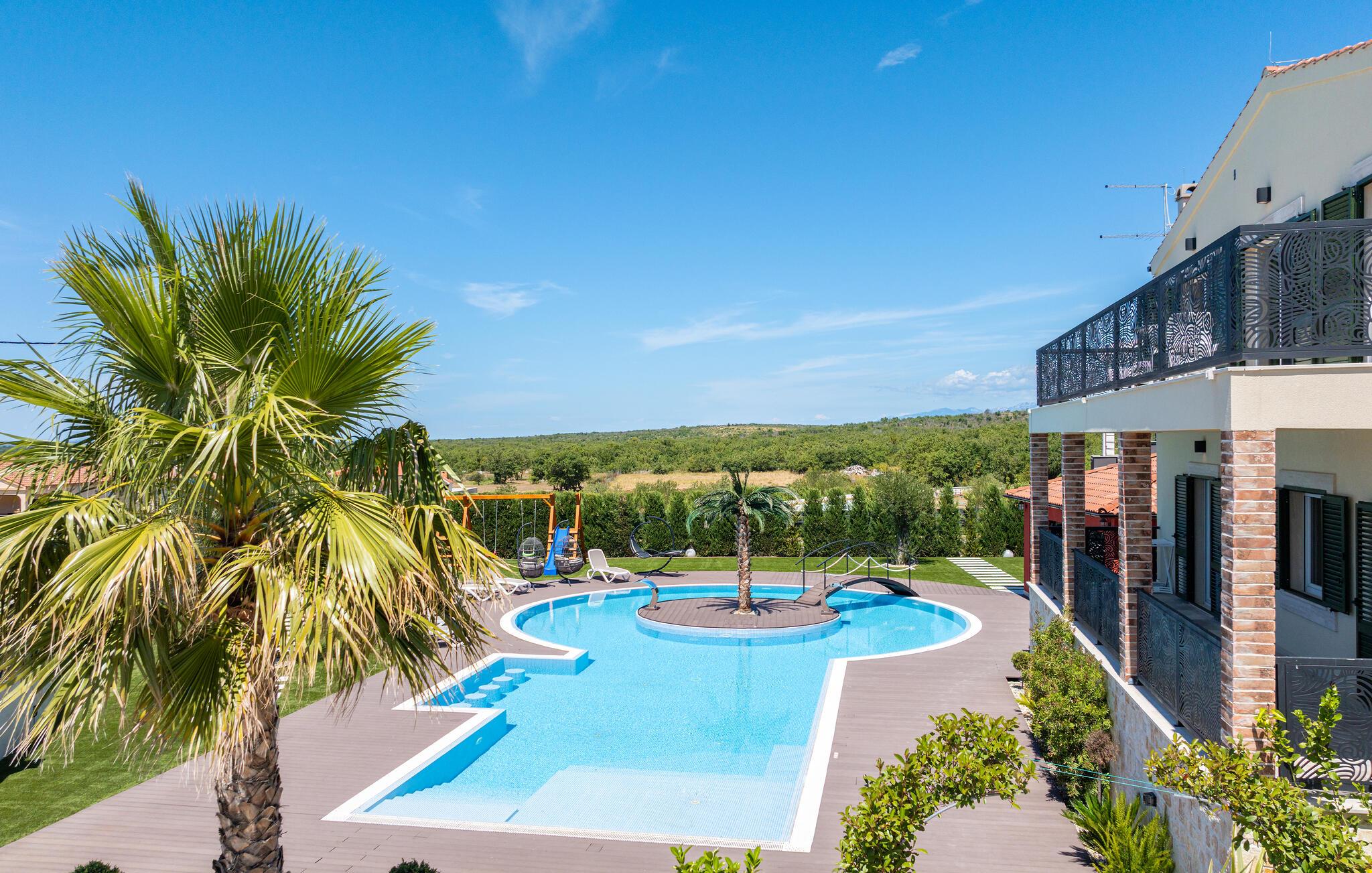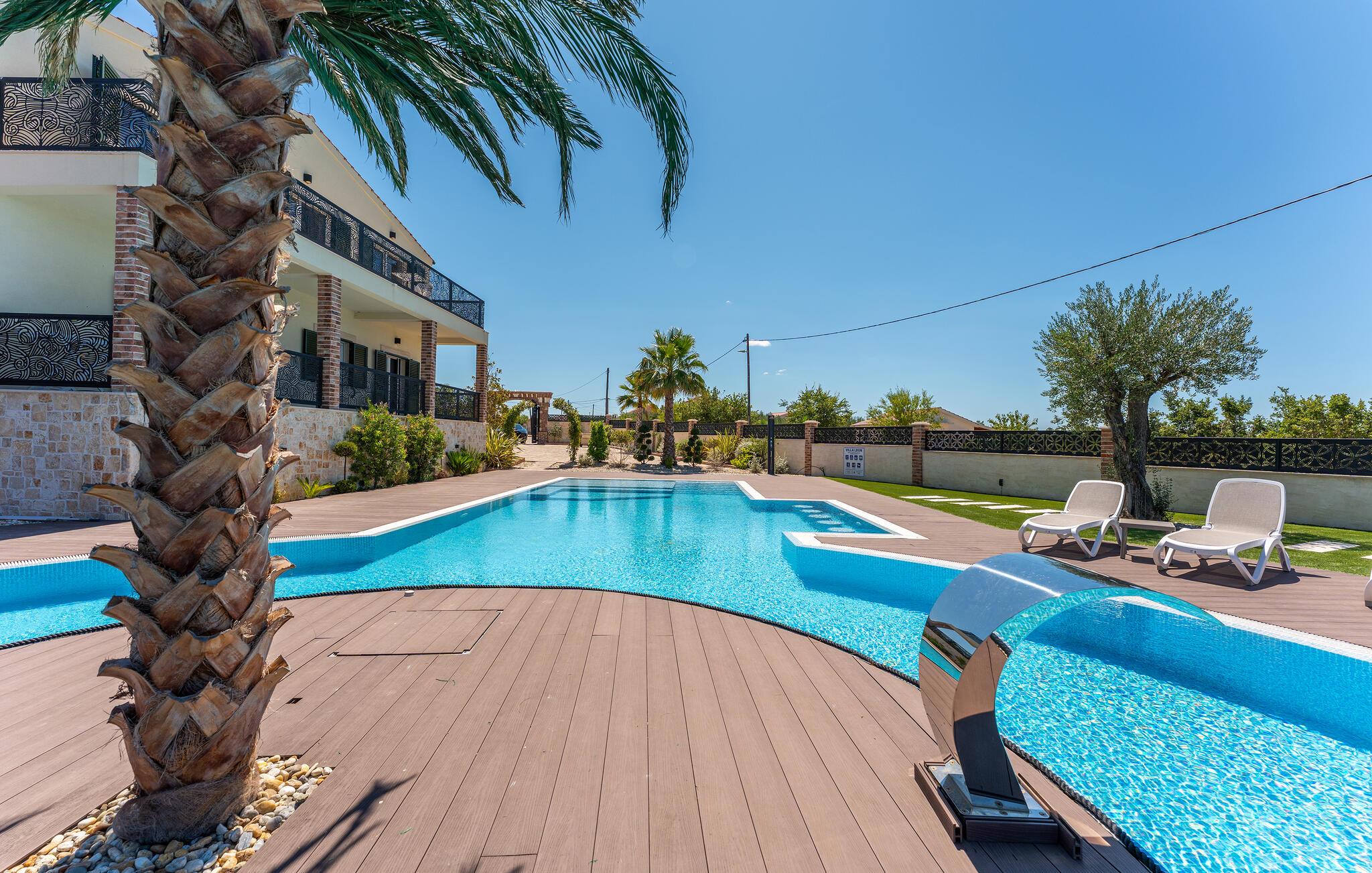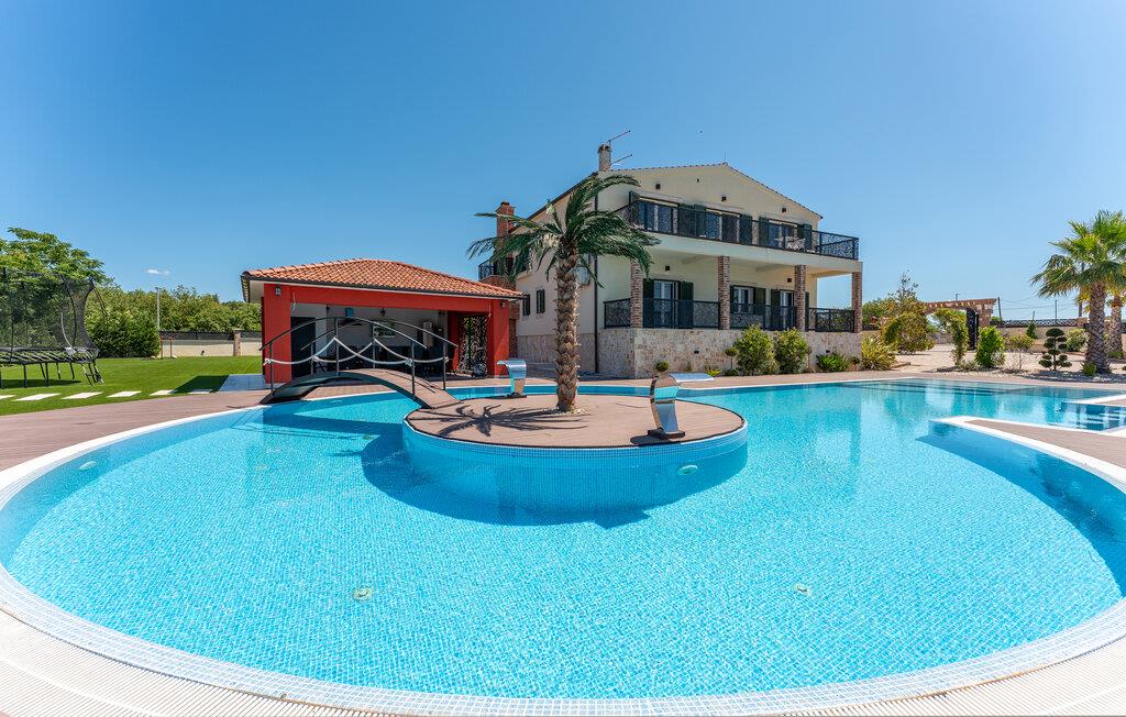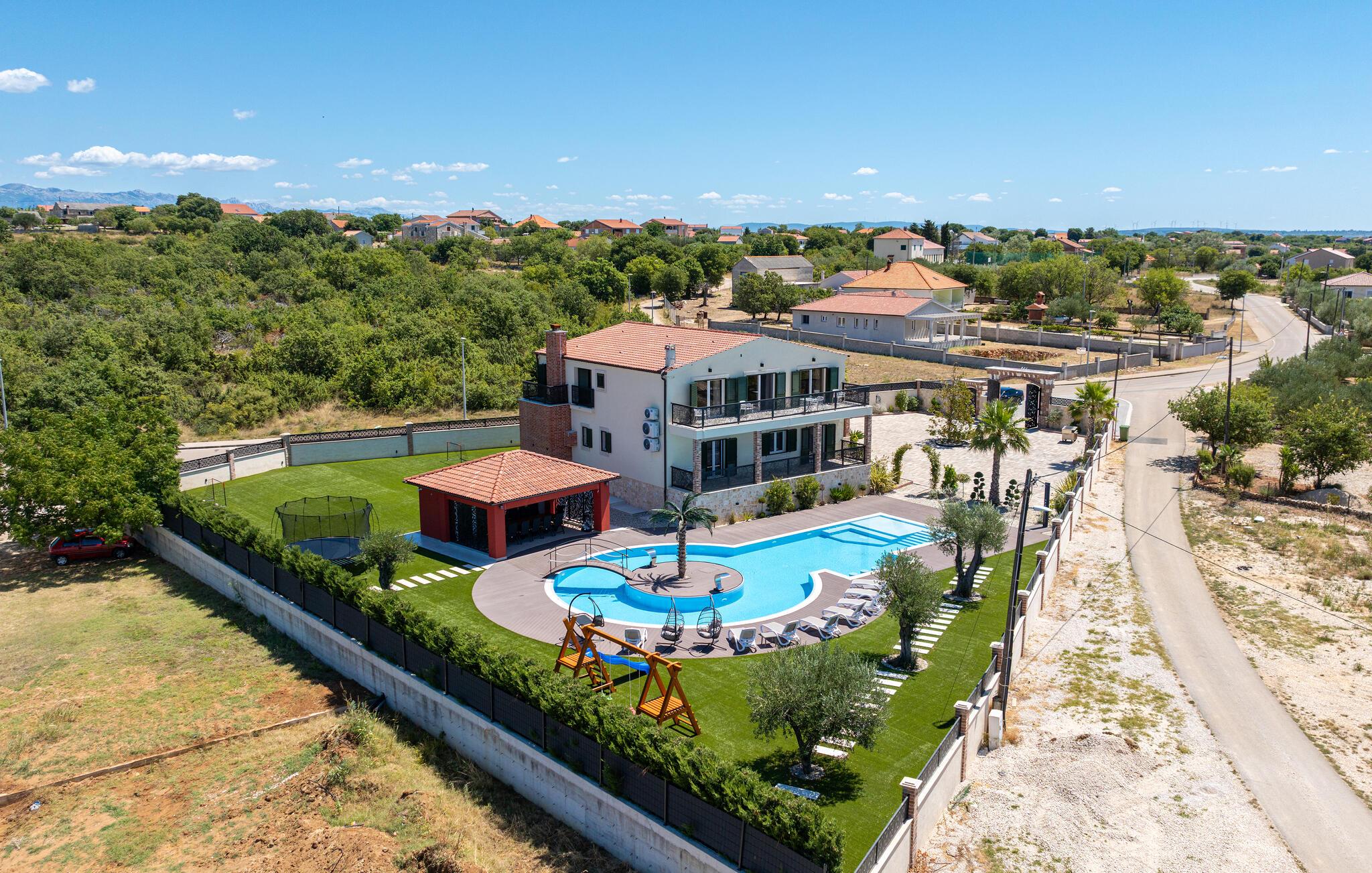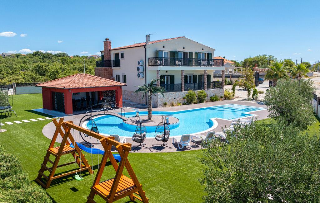 Oplev uforglemmelige ferier i dette stilfulde feriehus med pool nær havet. Dette elegant møblerede hus imponerer med et livligt farveskema, lyse værelser og en smuk træfinish. Hyg jer sammen i den indbydende sofagruppe, nyd afslappende timer med musik, eller tilbring en hyggelig filmaften sammen. Hvis I leder efter motion, kan I opbygge jeres udholdenhed og styrke i fitnessrummet. Start dagen med et par baner i den store pool eller en omgang vandpolo. Lad eftermiddagen passere i fred på en liggestol eller med en god bog, mens jeres børn morer sig på legeplads udenfor. Om aftenen kan I samles under den overdækkede terrasse til et lækkert måltid og nyde et glas fin kroatisk vin. Tag en tur til en af regionens smukke strande, hvor I kan nyde sol, hav og ren afslapning. Oplev de rolige omgivelser i Visocane på gåture eller cykelture gennem det dalmatiske landskab. Udforsk den historiske by Zadar med dens romerske monumenter, det unikke havorgel og den livlige atmosfære i den gamle bydel. Afslut dagen på en afslappet måde med en hyggelig middag og regionale specialiteter.