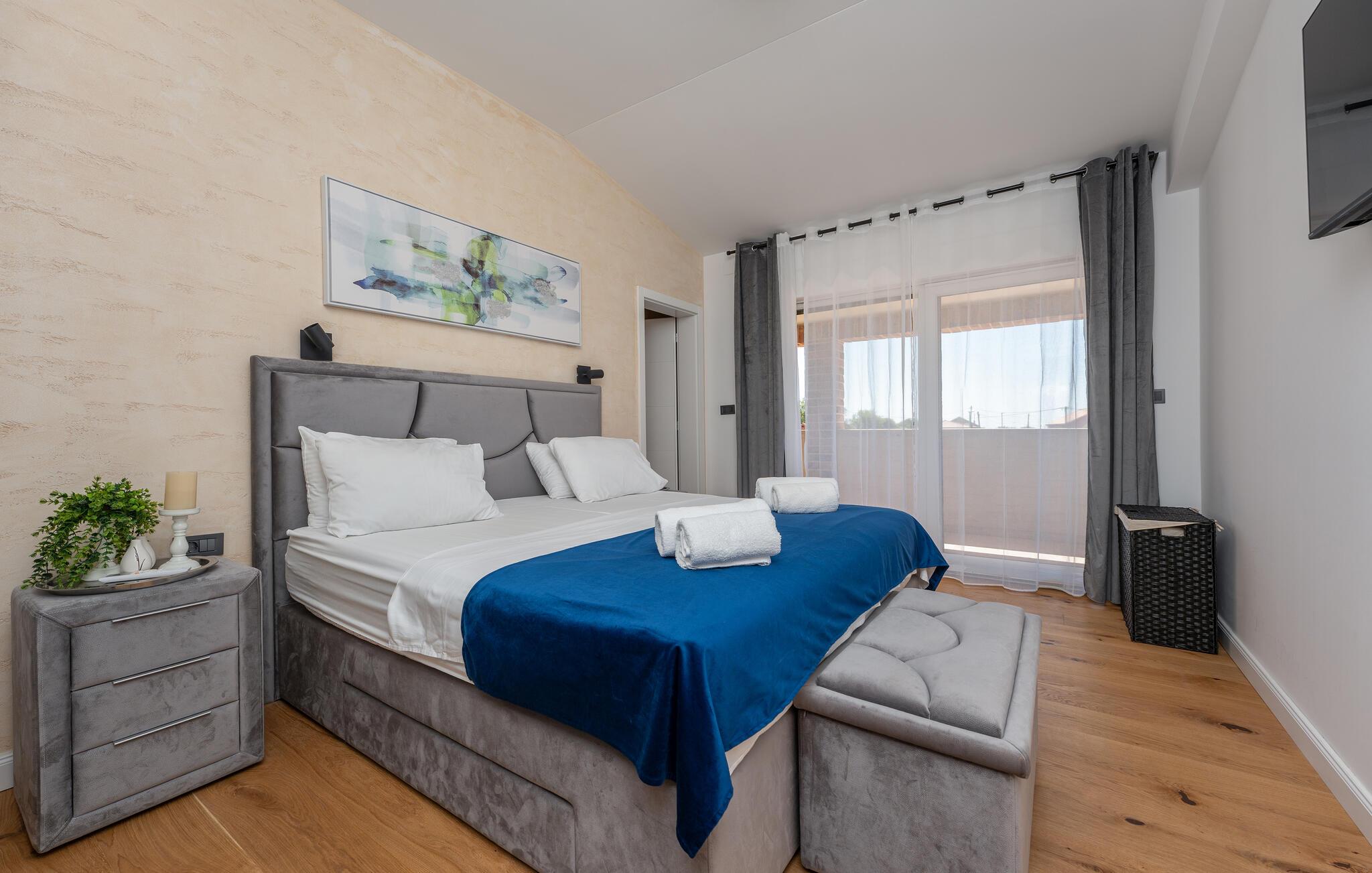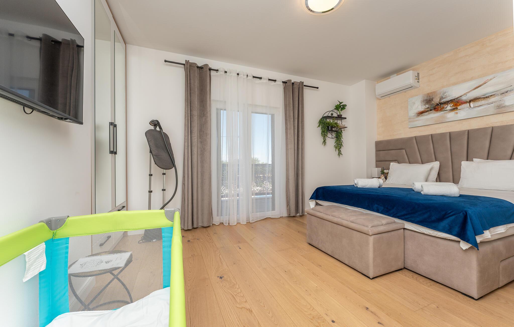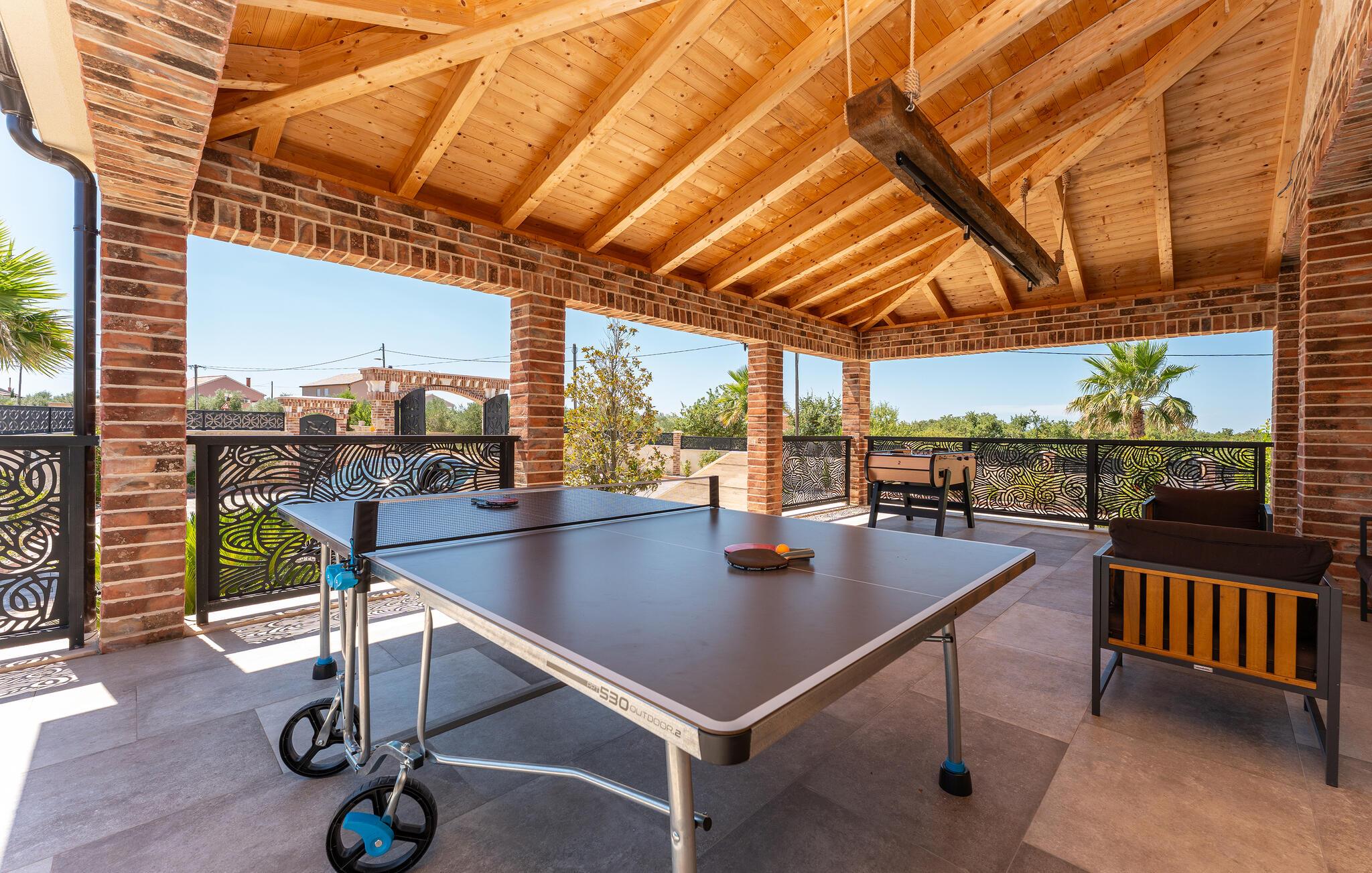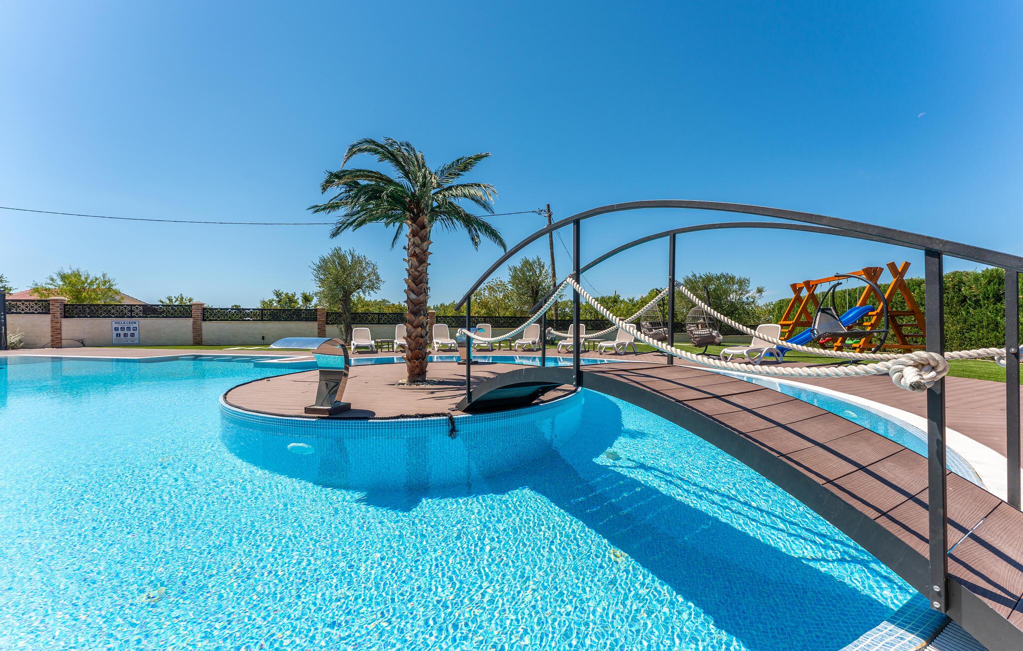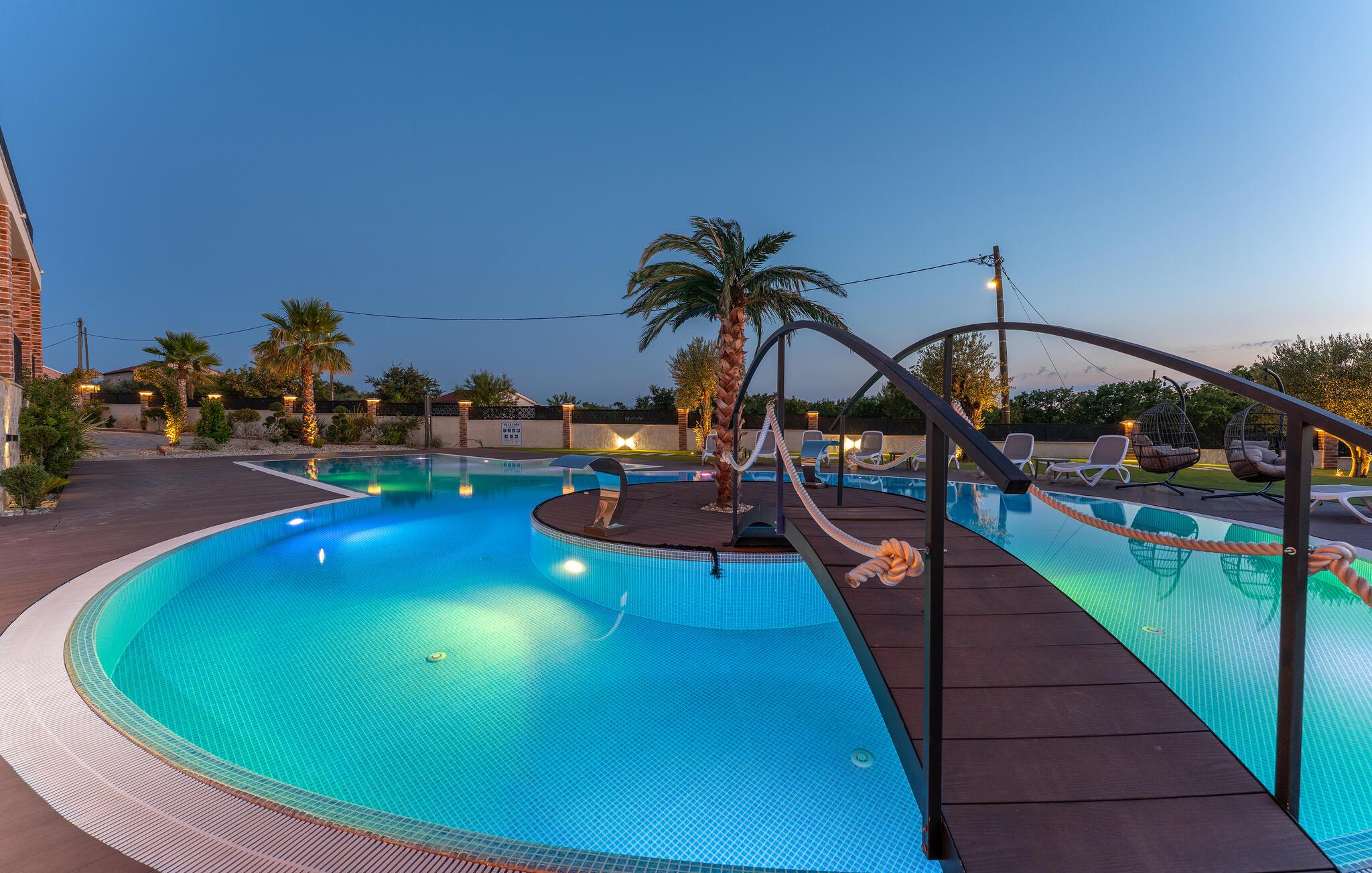 Oplev uforglemmelige ferier i dette stilfulde feriehus med pool nær havet. Dette elegant møblerede hus imponerer med et livligt farveskema, lyse værelser og en smuk træfinish. Hyg jer sammen i den indbydende sofagruppe, nyd afslappende timer med musik, eller tilbring en hyggelig filmaften sammen. Hvis I leder efter motion, kan I opbygge jeres udholdenhed og styrke i fitnessrummet. Start dagen med et par baner i den store pool eller en omgang vandpolo. Lad eftermiddagen passere i fred på en liggestol eller med en god bog, mens jeres børn morer sig på legeplads udenfor. Om aftenen kan I samles under den overdækkede terrasse til et lækkert måltid og nyde et glas fin kroatisk vin. Tag en tur til en af regionens smukke strande, hvor I kan nyde sol, hav og ren afslapning. Oplev de rolige omgivelser i Visocane på gåture eller cykelture gennem det dalmatiske landskab. Udforsk den historiske by Zadar med dens romerske monumenter, det unikke havorgel og den livlige atmosfære i den gamle bydel. Afslut dagen på en afslappet måde med en hyggelig middag og regionale specialiteter.