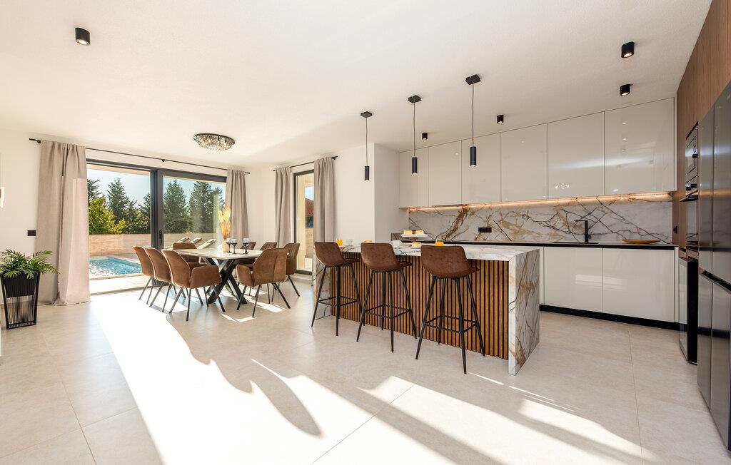Denne moderne og luksuriøse villa tilbyder rigelig plads til en stor familie eller en gruppe venner, der kan nyde en uforglemmelig ferie. Tilbered lækre retter, nyd hyggelige måltider omkring det indbydende spisebord, og mindes over et glas vin.