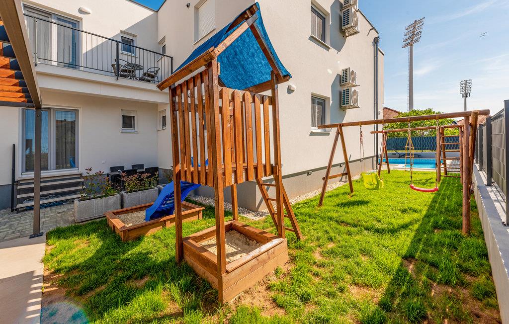 Huset er lyst og velholdt. Den fælles grund har en udendørs pool og legetøj til jeres børn samt en grill.