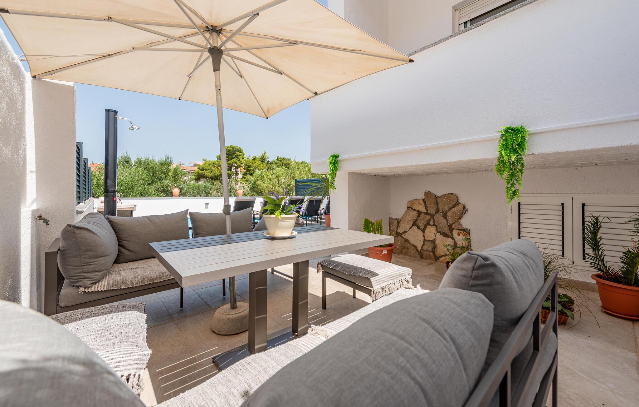 Udeområdet er tilsvarende lækkert. Her kan I nyde solen, varmen og den friske luft i en liggestol, køle jer lækkert af i poolen og se frem til lange sommeraftener på terrassen under den lune sol.