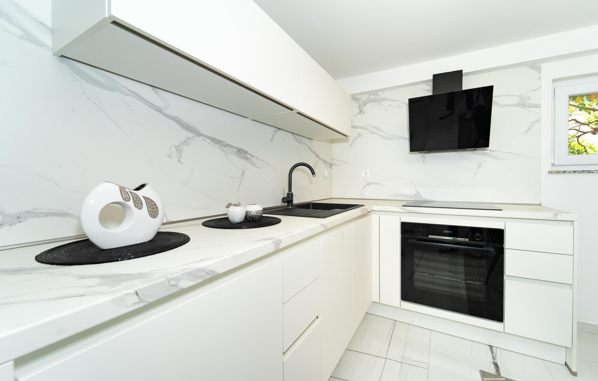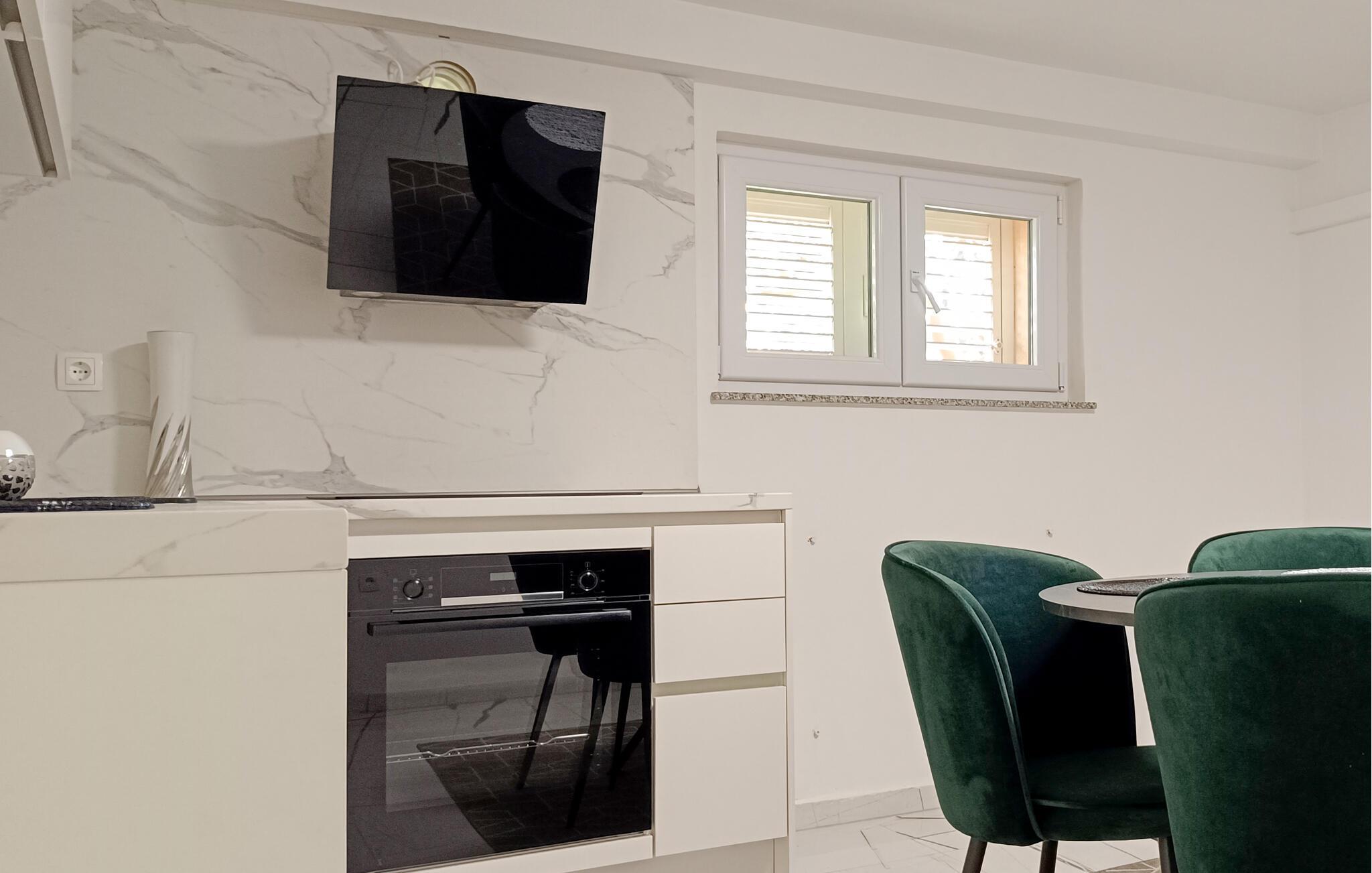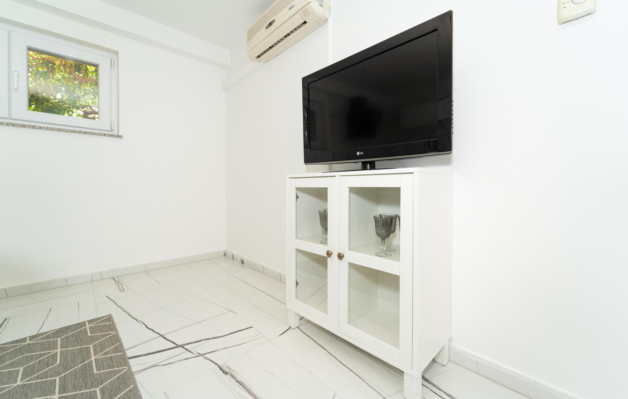 Denne stilfuldt møblerede ferielejlighed byder jer velkommen i hjertet af Zadar og giver jer muligheden for at kombinere en strandferie med kulturelle opdagelser. Forkæl jer selv med kroatiske specialiteter, og planlæg jeres aktiviteter omkring det indbydende spisebord. Efter en lang dag kan I streame en god serier eller forkæle jer selv med en god bog, som I ikke har tid til i hverdagen.