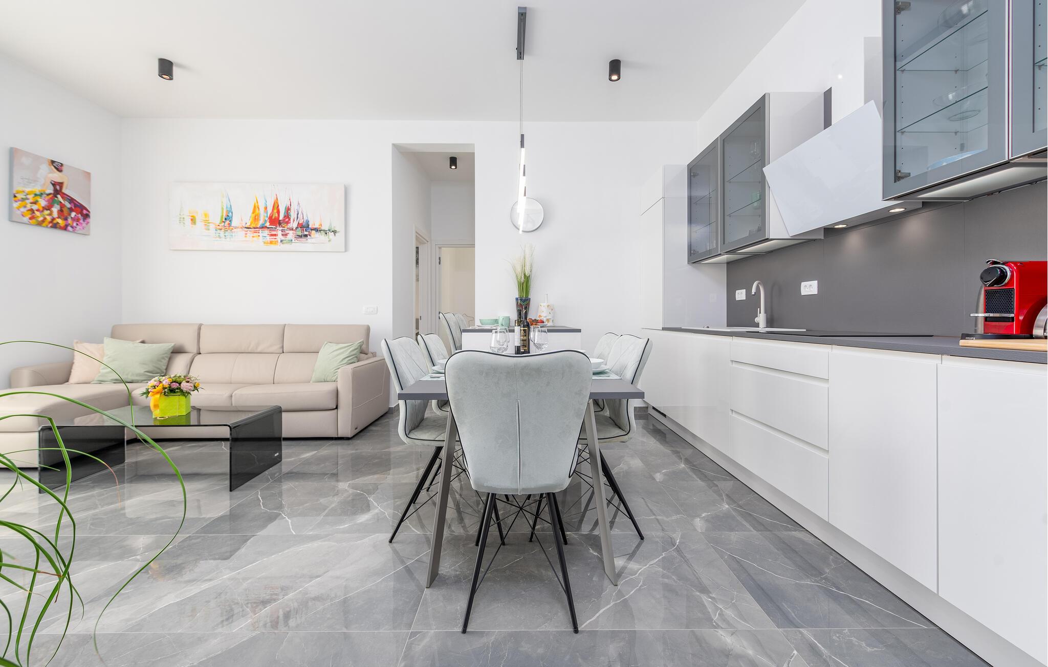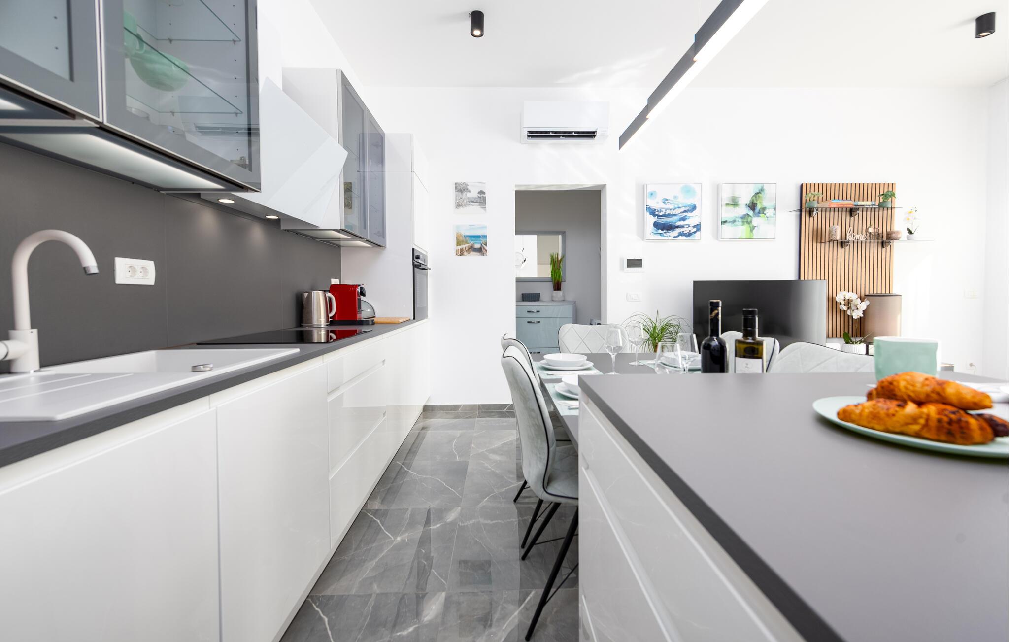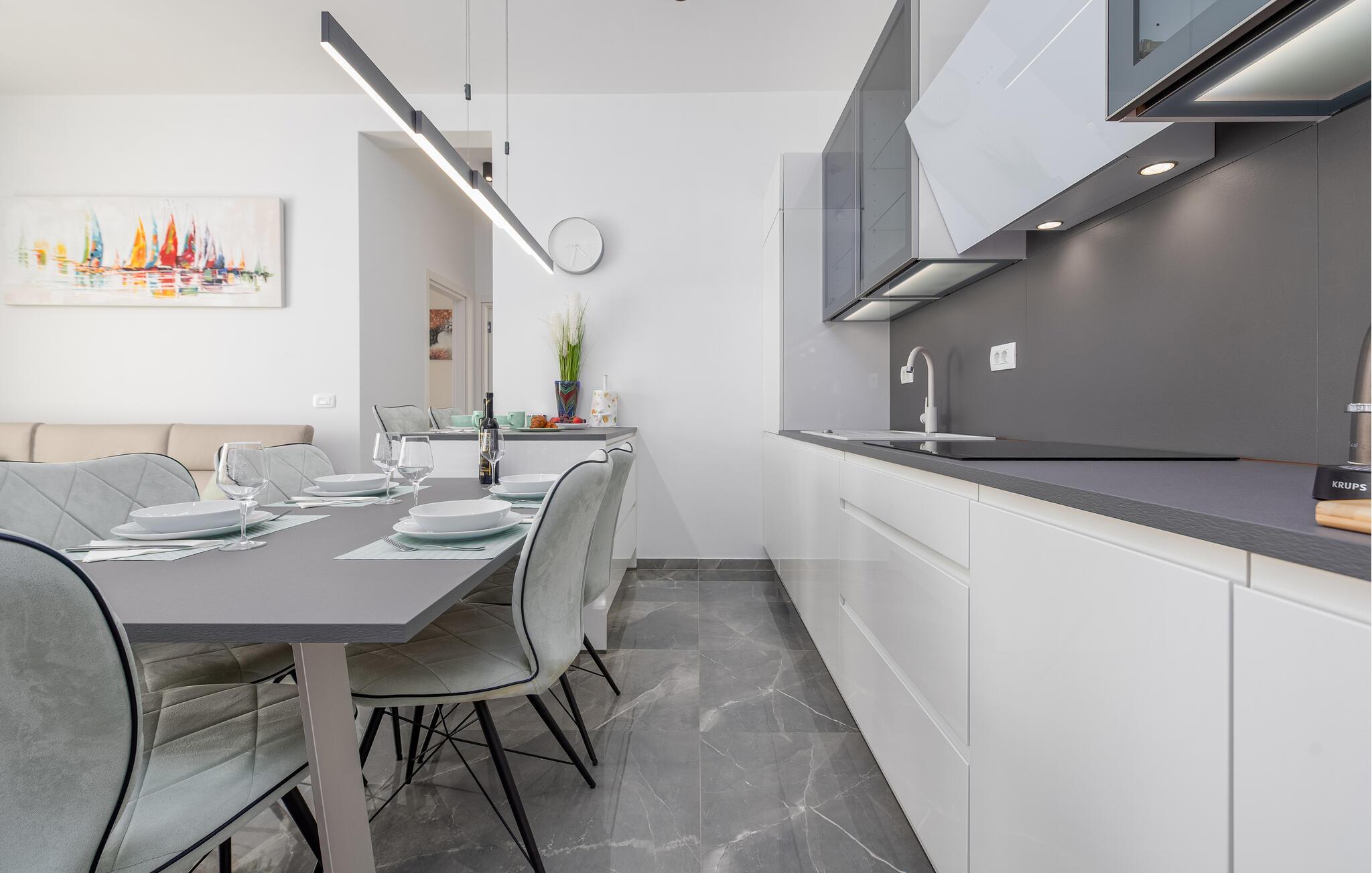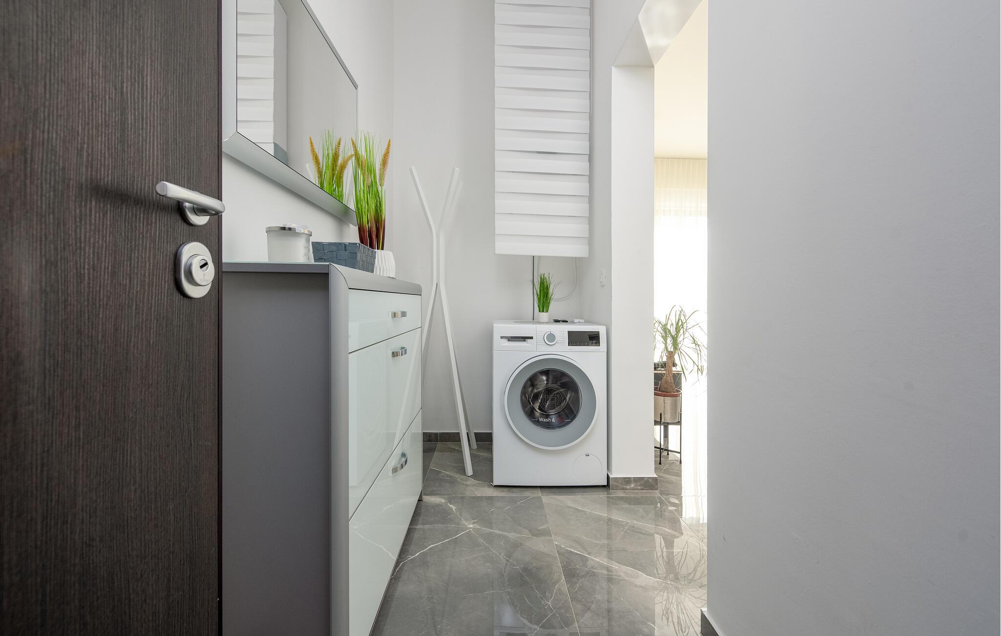 Nyd en dejlig ferie i denne komfortable ferielejlighed nær stranden. Denne moderne lejlighed kombinerer elegance og komfort på harmonisk vis. Masser af varmt naturligt lys, diskrete farver og et elegant sofaområde skaber en fredelig atmosfære, hvor I hurtigt kan slappe af og genoplade batterierne. Uanset om I streamer jeres yndlingsserie, lytter til en interessant podcast eller tilbereder lækre måltider i det moderne køkken – her sætter I tempoet for jeres dag. Om morgenen inviterer terrassen med den behagelige sofa jer til at blive hængende. Slap af her med en duftende kaffe og en let morgenmad, inden I begiver jer ud på dagens aktiviteter. Om eftermiddagen kan I slappe af her eller nyde jeres ferielæsning med en kølig drink. Tag en slentretur til stranden og nyd det krystalklare vand i det kroatiske Adriaterhav. Bagefter kan I udforske den charmerende gamle bydel i Zadar med dens historiske bygninger og maleriske gyder. Om aftenen kan I blive fortryllet af det berømte Havorgel og lysshowet "Hilsen til solen". I kan også tage en tur til de nærliggende nationalparker for at opleve Kroatiens naturlige mangfoldighed.