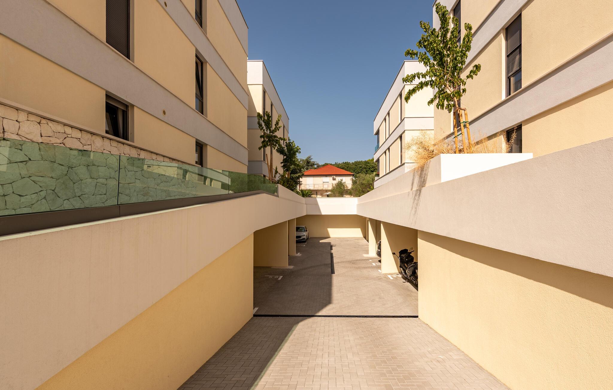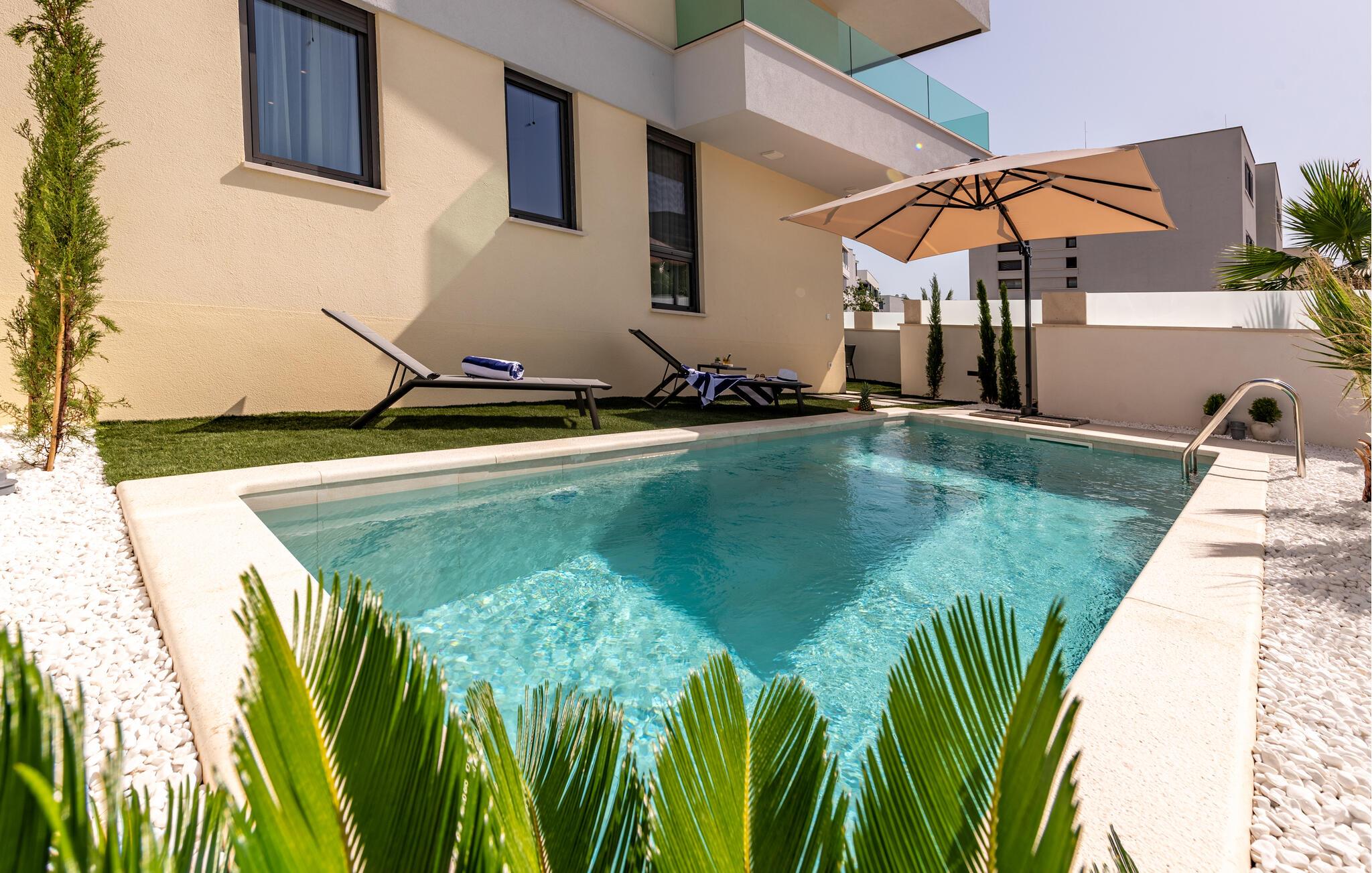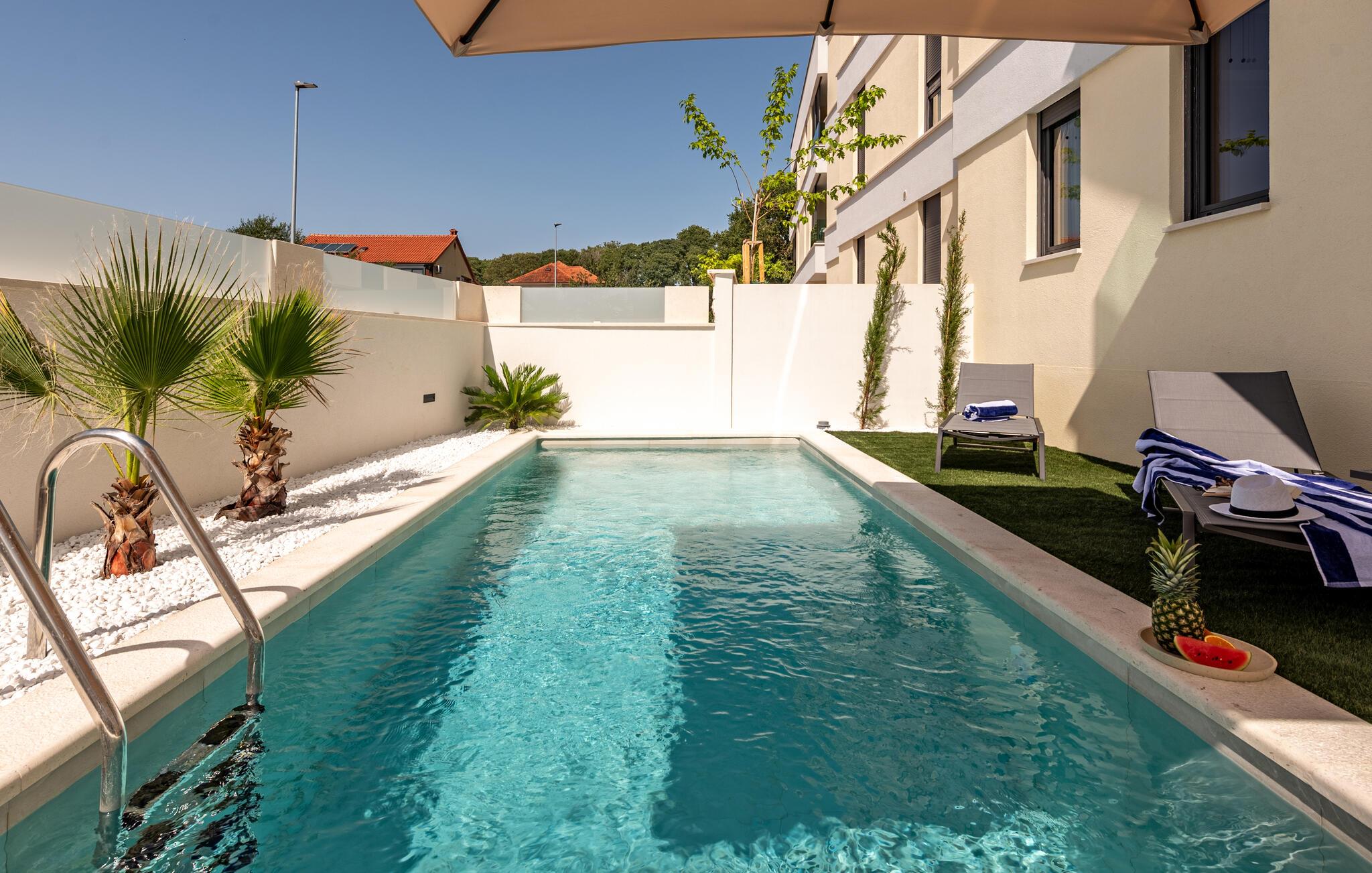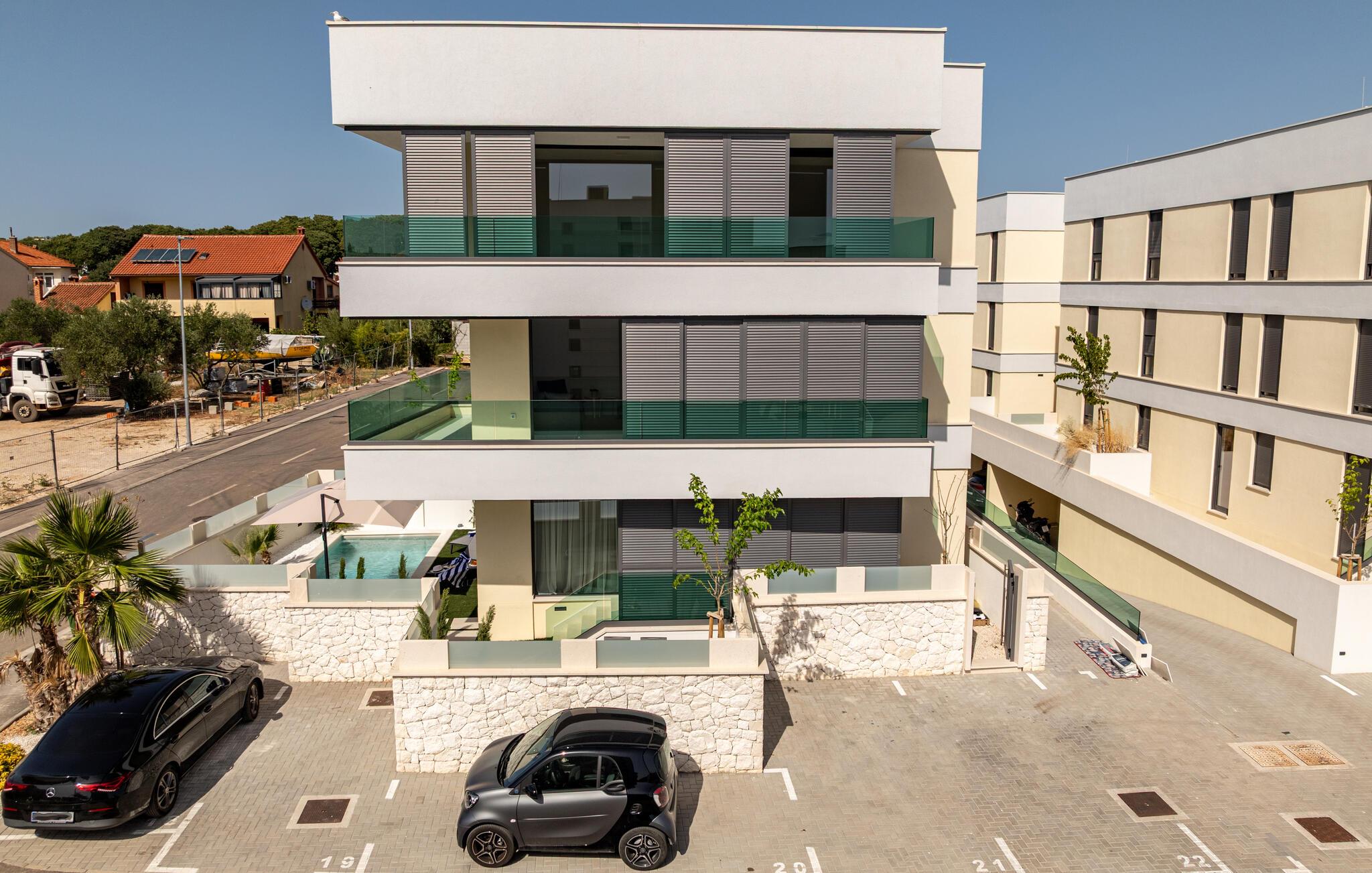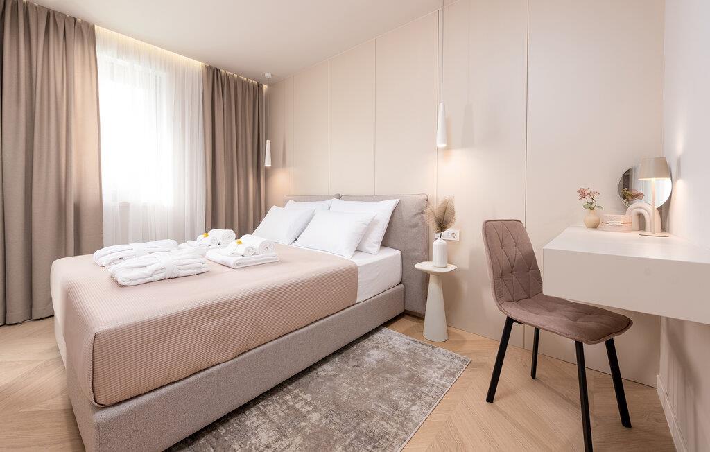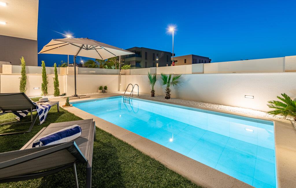 Oplev en dejlig ferie i denne komfortable ferielejlighed med pool og tæt på havet. Denne stilfuldt møblerede lejlighed garanterer en ferie af højeste kvalitet. Smagfuld indretning i afdæmpede farver, en komfortabel sofagruppe og et moderne udstyret køkken inviterer jer til at slappe af og genoplade batterierne. Hyg jer sammen med en kop kaffe, lav lækre måltider, eller tilbring en afslappende filmaften på sofaen. Forfrisk jer i poolen når som helst på dagen, og læn jer derefter tilbage på en af liggestolene med en kølig drink. Nyd blot middelhavsatmosfæren, eller planlæg jeres aktiviteter for den næste dag. Om aftenen inviterer terrassen jer til at afslutte aftenen i fred med en grillfest. Gå en afslappet tur til sandstranden, hvor I kan svømme eller bare nyde solen. Tag en tur til den nærliggende by Zadar, og oplev dens imponerende gamle bydel med romerske og venetianske spor. Om aftenen kan I nyde det unikke skue af Havorglet og "Hilsen til Solen" direkte på havnepromenaden. Udforsk Kožinos charmerende omgivelser med dens idylliske kyststier og maleriske udsigter.