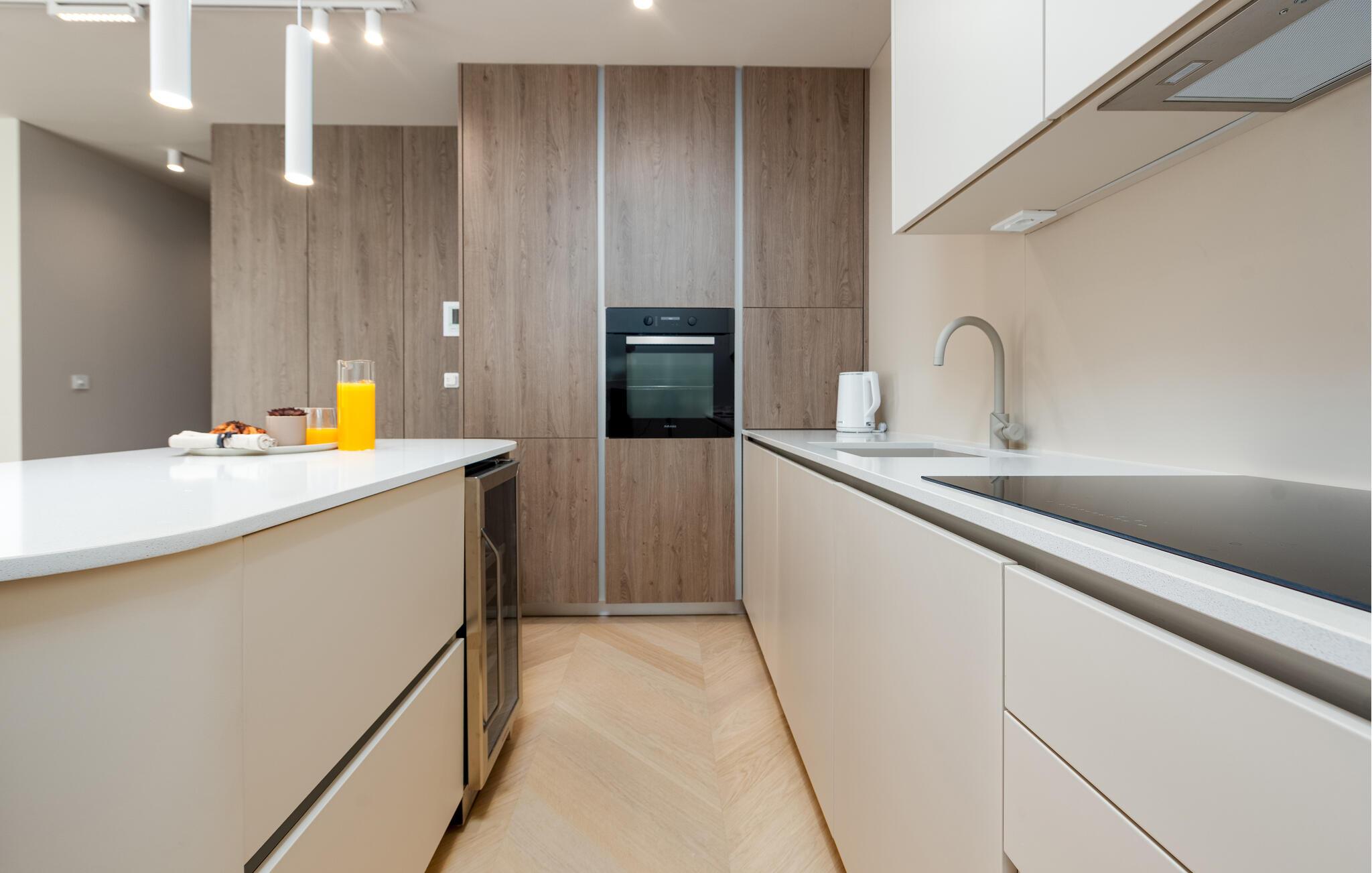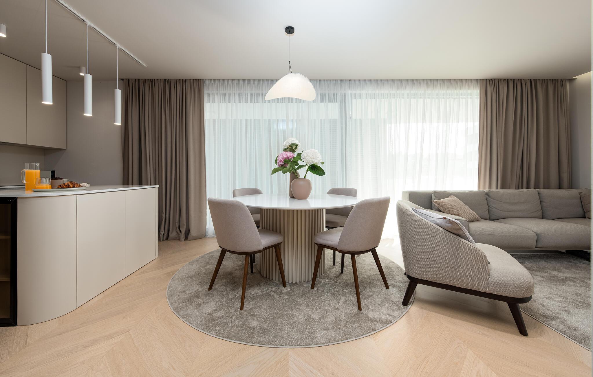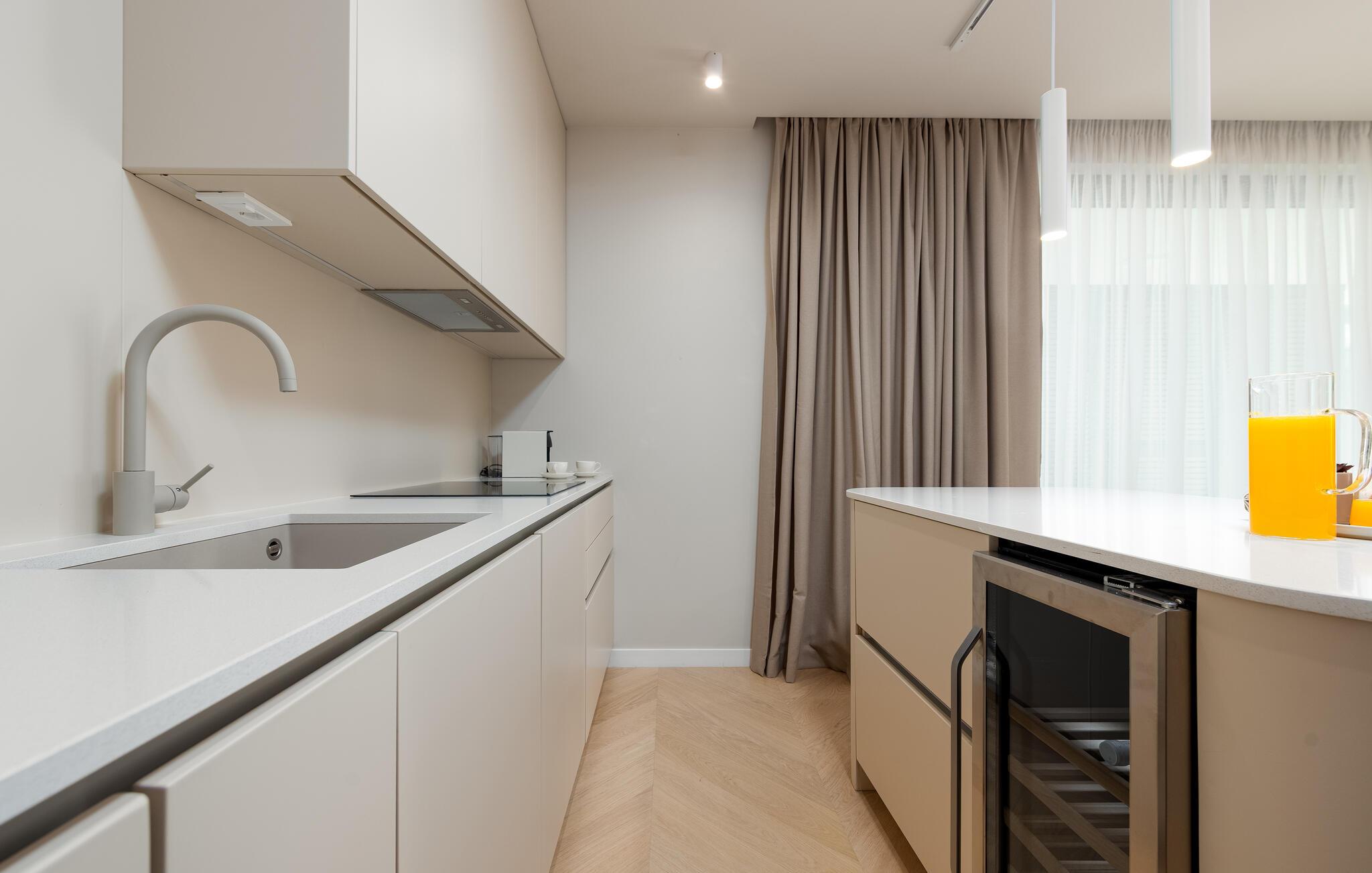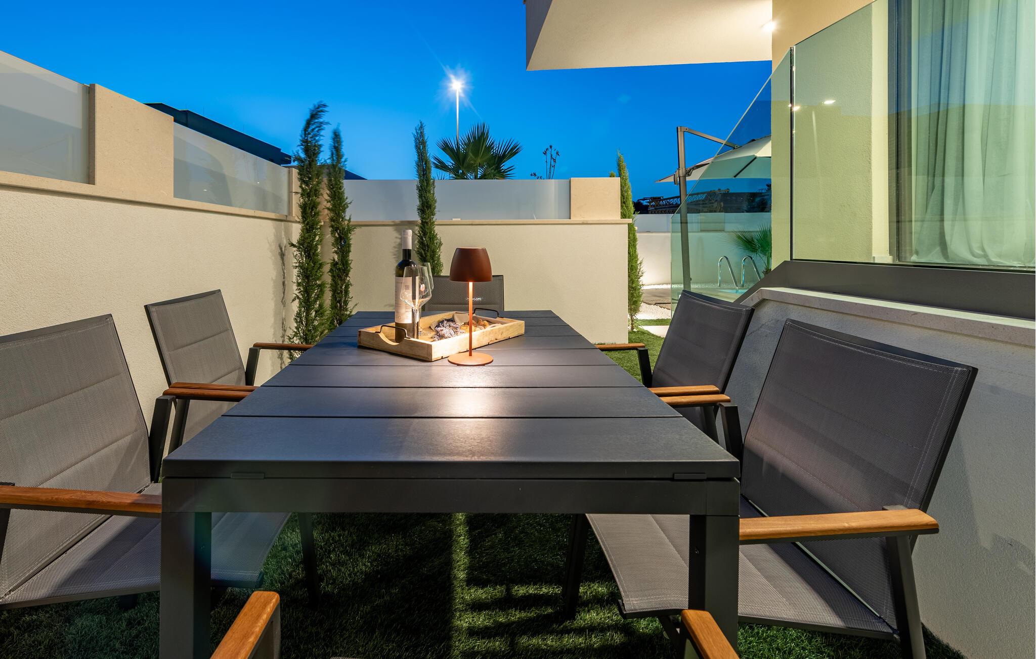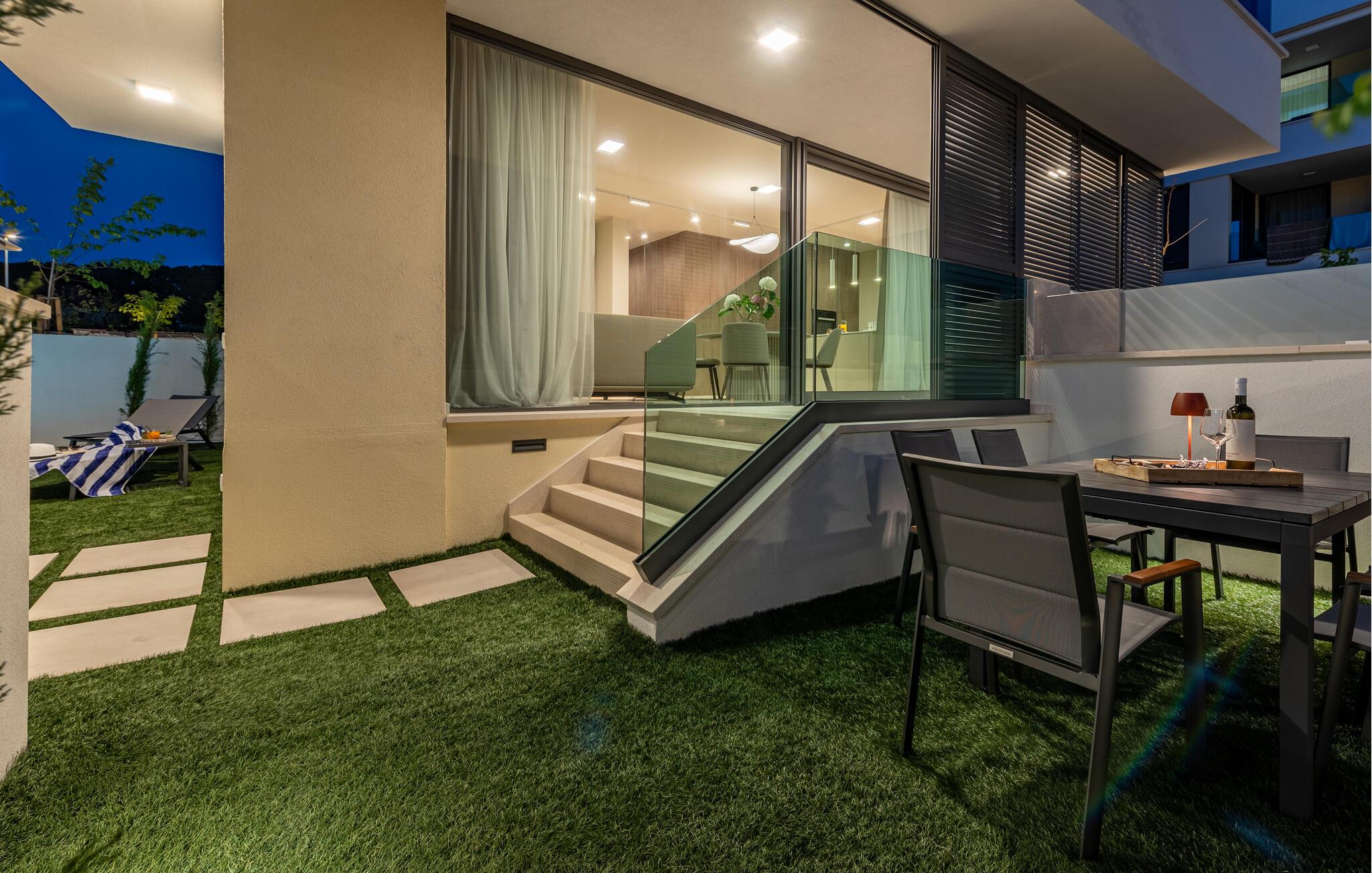 Oplev en dejlig ferie i denne komfortable ferielejlighed med pool og tæt på havet. Denne stilfuldt møblerede lejlighed garanterer en ferie af højeste kvalitet. Smagfuld indretning i afdæmpede farver, en komfortabel sofagruppe og et moderne udstyret køkken inviterer jer til at slappe af og genoplade batterierne. Hyg jer sammen med en kop kaffe, lav lækre måltider, eller tilbring en afslappende filmaften på sofaen. Forfrisk jer i poolen når som helst på dagen, og læn jer derefter tilbage på en af liggestolene med en kølig drink. Nyd blot middelhavsatmosfæren, eller planlæg jeres aktiviteter for den næste dag. Om aftenen inviterer terrassen jer til at afslutte aftenen i fred med en grillfest. Gå en afslappet tur til sandstranden, hvor I kan svømme eller bare nyde solen. Tag en tur til den nærliggende by Zadar, og oplev dens imponerende gamle bydel med romerske og venetianske spor. Om aftenen kan I nyde det unikke skue af Havorglet og "Hilsen til Solen" direkte på havnepromenaden. Udforsk Kožinos charmerende omgivelser med dens idylliske kyststier og maleriske udsigter.