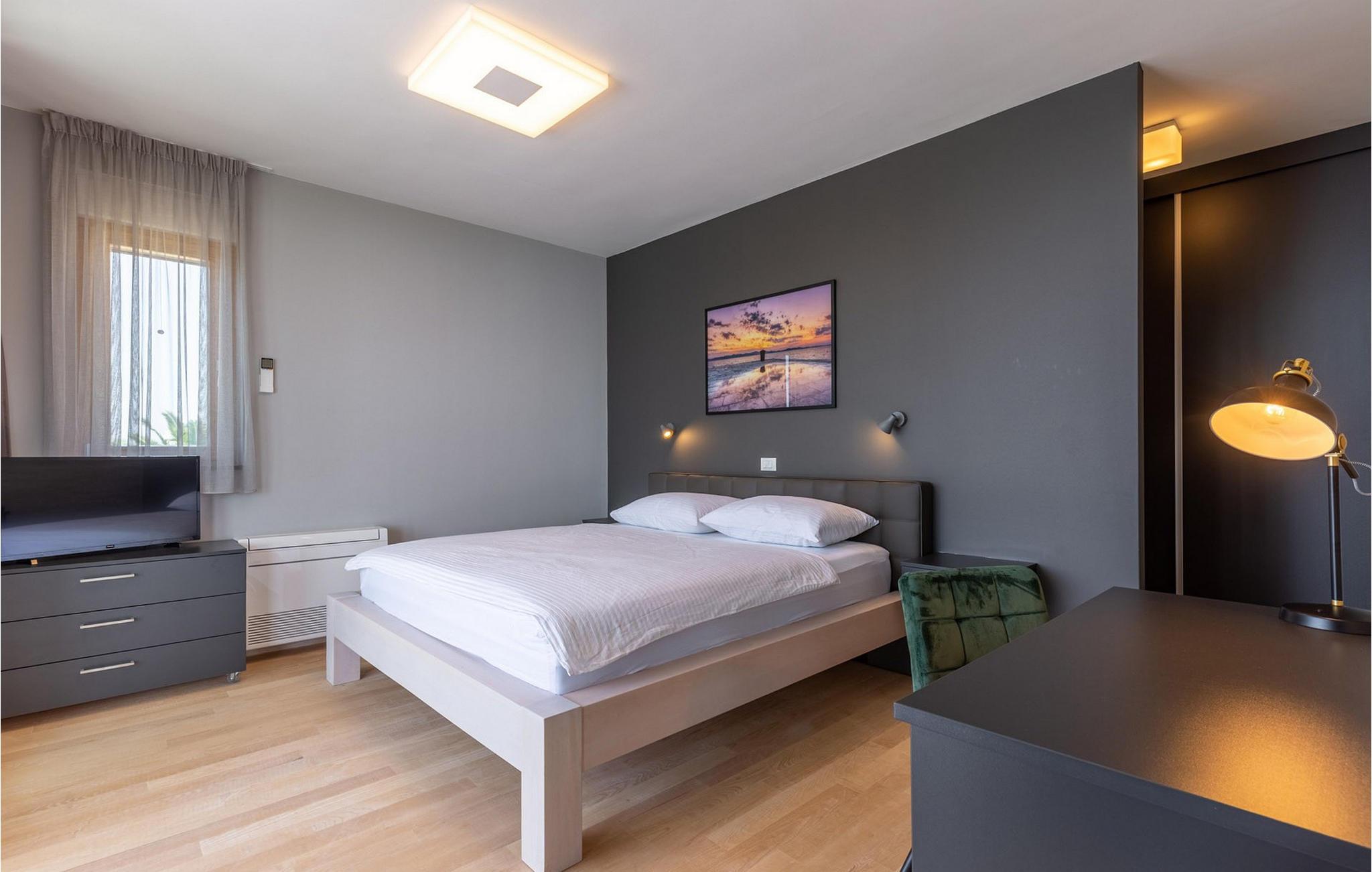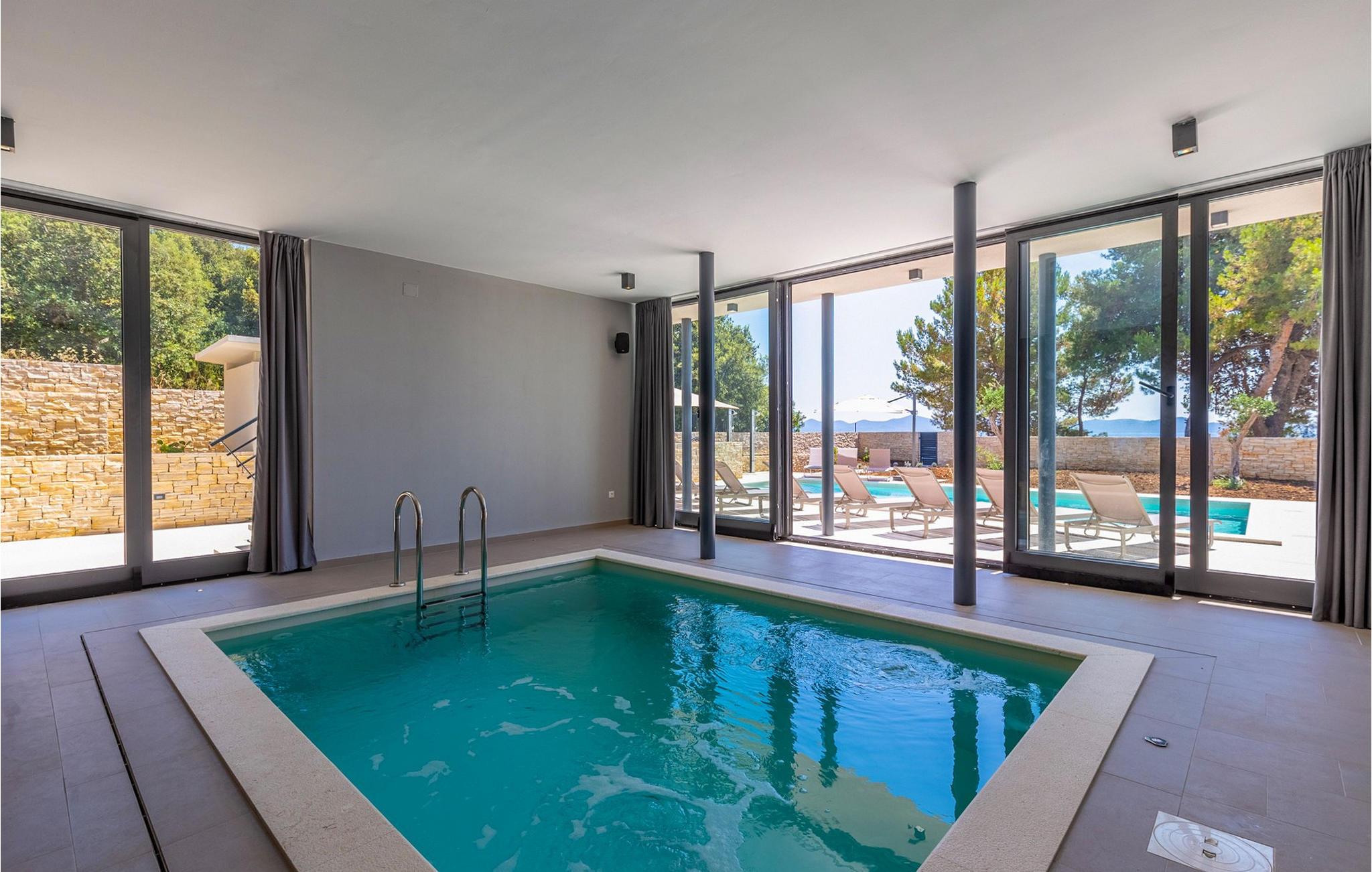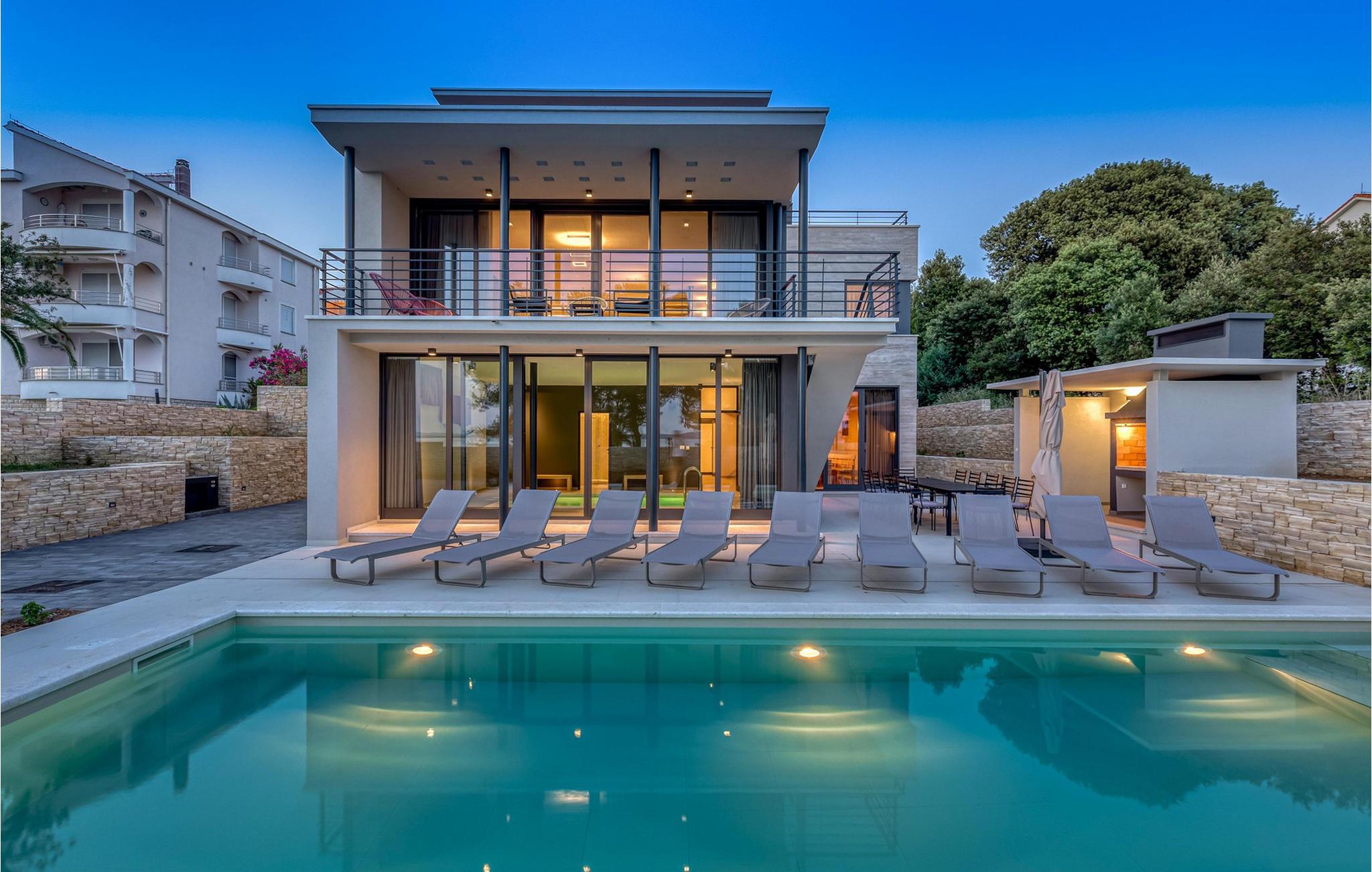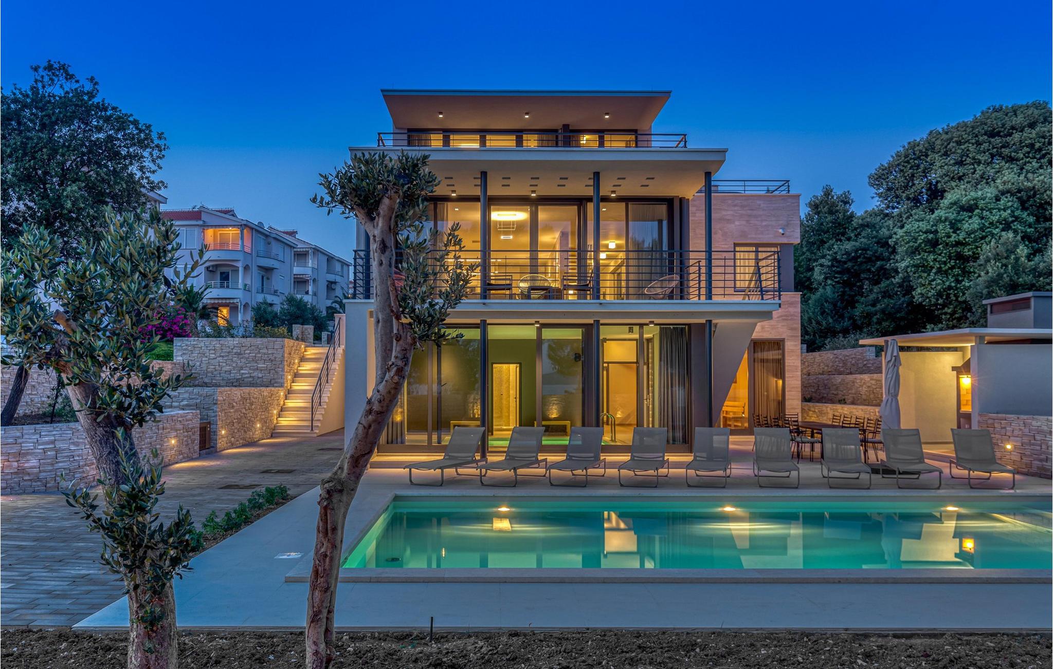 Vågn op hver morgen til havudsigt i denne smukke villa med swimmingpool, udendørs pool og spabad. Nyd jeres ophold i den eksklusive Villa Luca, kun få meter fra havet, med en betagende udsigt over Zadars øer. Dette luksuriøse feriehus tilbyder alt, hvad I behøver for en perfekt ferie – fra en stilfuld indendørs pool og sauna til et fitnessrum og hyggelige lounges. Udforsk soveværelserne og opholdsområderne, der er fordelt på flere etager, og bliv imponeret af de luksuriøse faciliteter. Det åbne køkken med grill lægger op til at nyde hyggelige madlavningsaftener, mens I slapper af på en af de rummelige terrasser eller nyder den storslåede udsigt i spabadet. Den velholdte have med udendørs pool og liggestole sikrer ren afslapning. Lyt til havets brusen og saml jer til en aftengrillfest på terrassen. Kožino er en rolig ferieby, der fortryller med sine uberørte strande og maleriske middelhavsvegetation. Her kan I tage lange gåture ved havet eller slappe af i en af de stilfulde strandbarer med cocktails og kulinariske lækkerier. Kun få kilometer væk venter den pulserende by Zadar på jer med sin rige kulturarv, spændende seværdigheder og udflugter til imponerende nationalparker. Den perfekte kombination af ro og underholdning gør Kožino til et ideelt feriemål for alle, der elsker naturen og havet. Bemærk venligst: Ejendommen accepterer ikke ungdomsgrupper under 30 år eller polterabender. Bookinger fra sådanne grupper vil blive afvist, selv ved ankomst eller under opholdet, uden refusion.