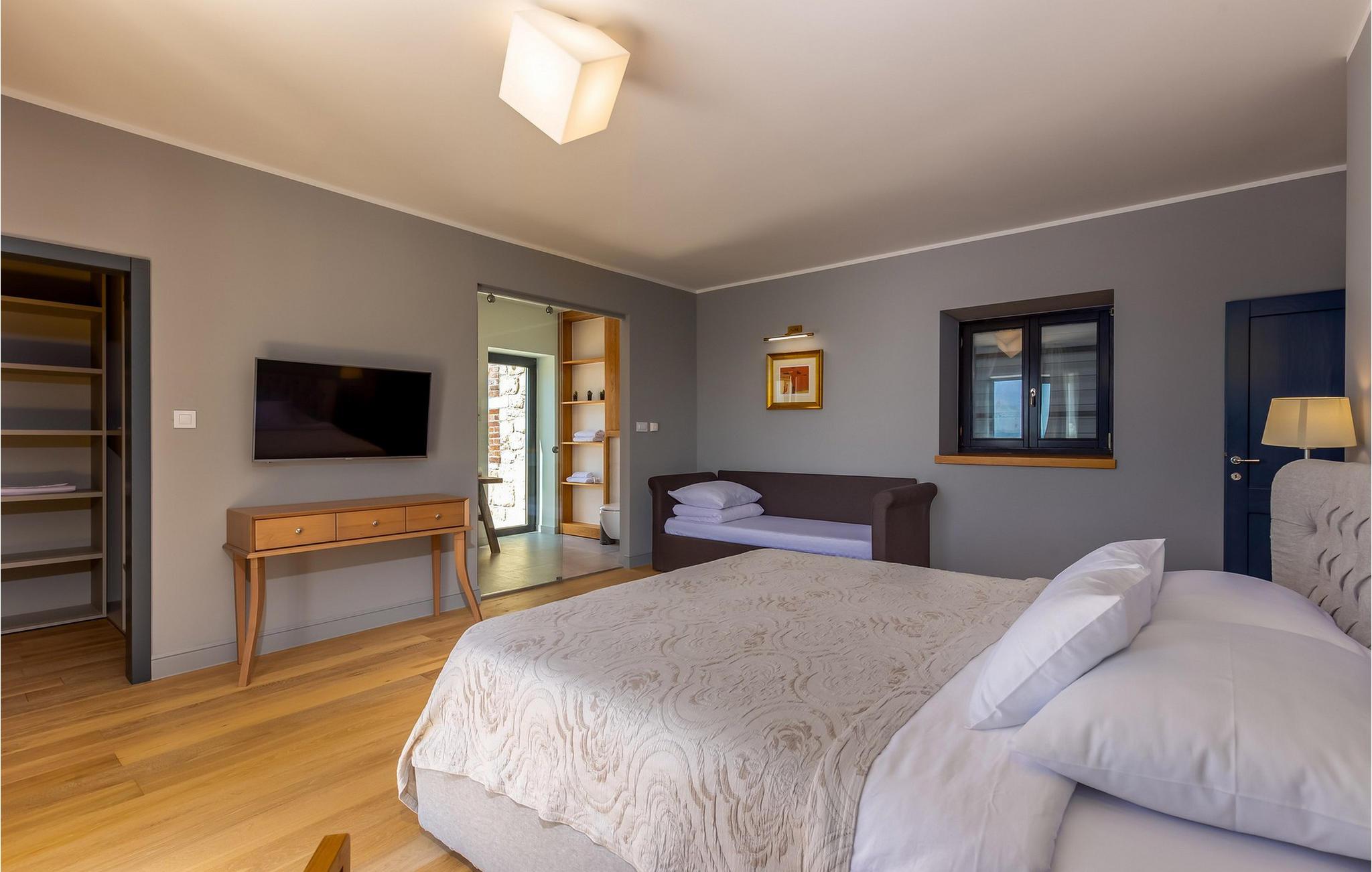 Slap af i denne rummelige og storslåede stenvilla med swimmingpool. Nyd en uforglemmelig ferie i den luksuriøse stenvilla Emilio, som vil fortrylle jer med sin charmerende atmosfære og unikke blanding af tradition og modernitet. Det elegante interiør har et fuldt udstyret køkken, en stilfuld spisestue og en rummelig stue. Føl jer hjemme her og sams med familien. En sauna, billard, bordfodbold, dart og en PlayStation 4 sørger for underholdning og afslapning. Den rummelige have lægger op til at slappe af med sin opvarmede udendørs pool og komfortable liggestole. Glæd jer til hyggelige grillfester under stjernerne, slap af med en bog på verandaens havemøbler eller udfordr jer selv til en bordtennisturnering. Den rolige landsby Murvica er det perfekte udgangspunkt for at udforske den nærliggende by Zadar. Denne historiske by byder på en rig kulturarv, en pulserende gammel bydel og et varieret kulinarisk udbud. Udforsk de idylliske strande og maleriske bugter i det omkringliggende område eller tag på udflugter til de betagende nationalparker Krka, Kornati eller Plitvicesøerne. Her vil I opleve den perfekte kombination af afslapning og eventyr i en af Dalmatiens smukkeste regioner. Bemærk venligst: Ejendommen accepterer kun ungdomsgrupper under 30 år og polterabender mod et refunderbart depositum. Depositummet skal betales ved ankomst, og eventuelle skader vil blive fratrukket dette beløb.