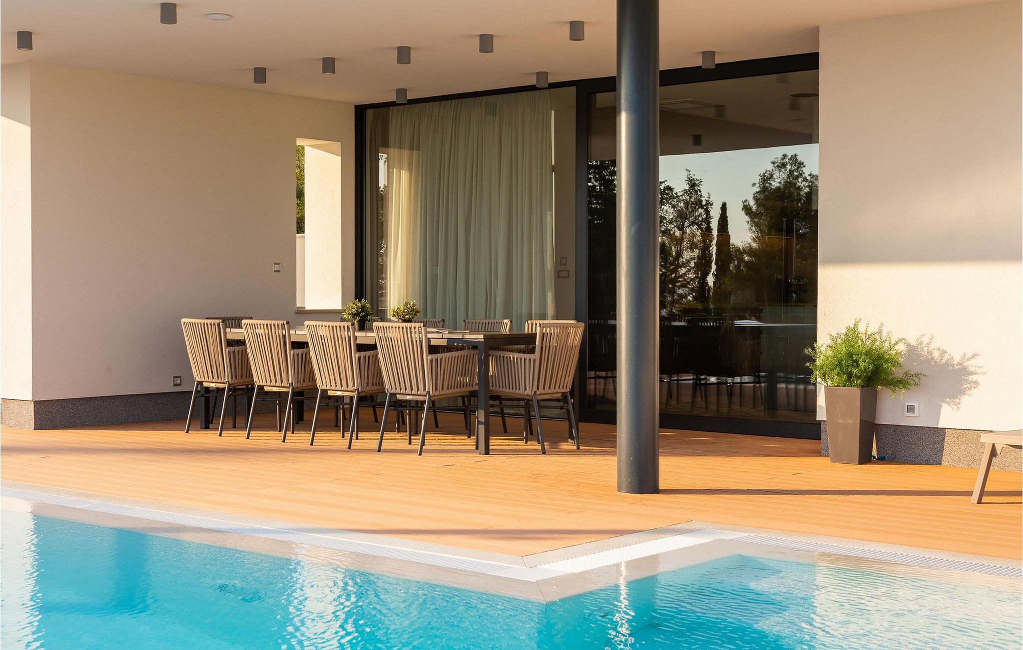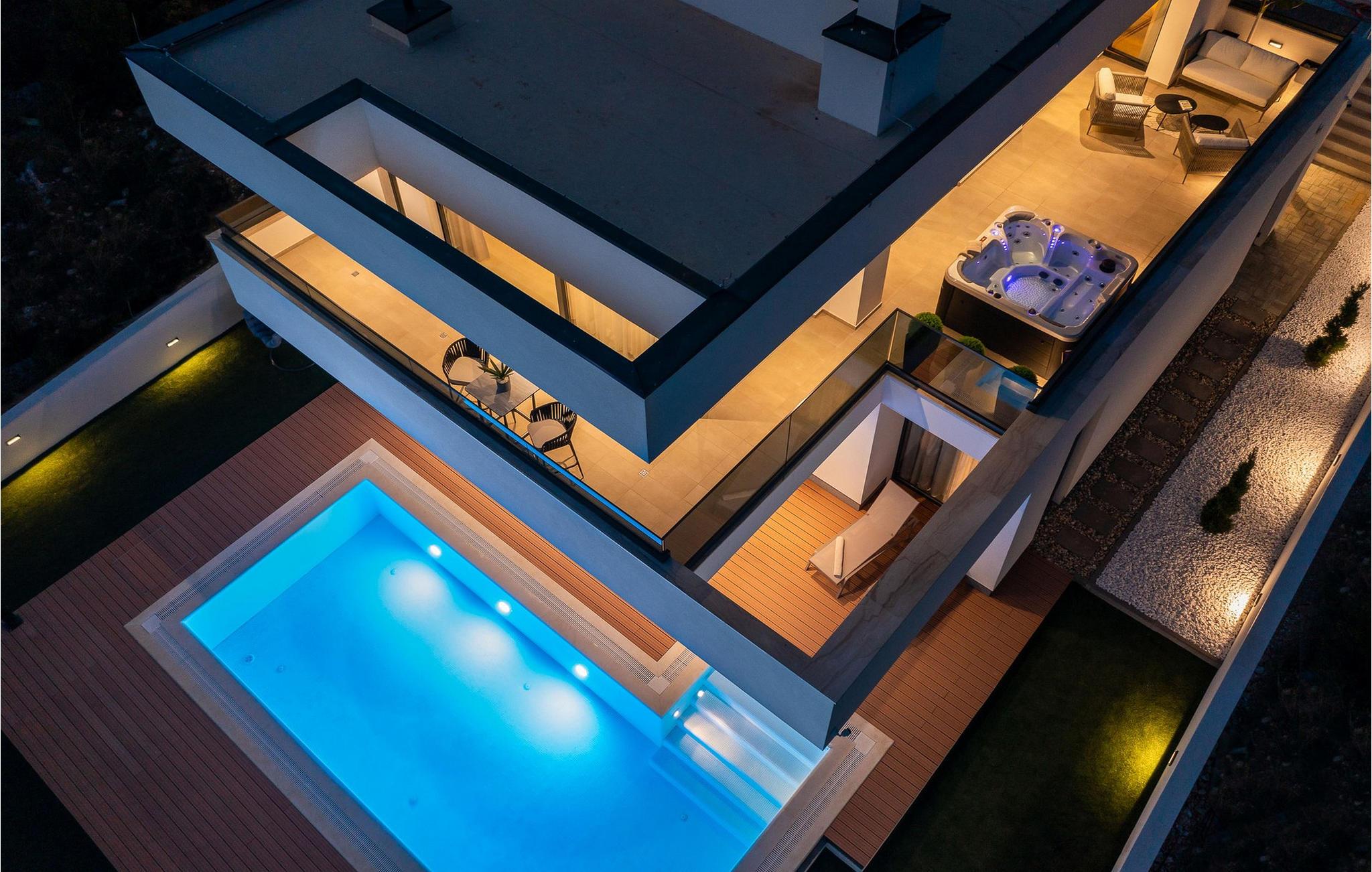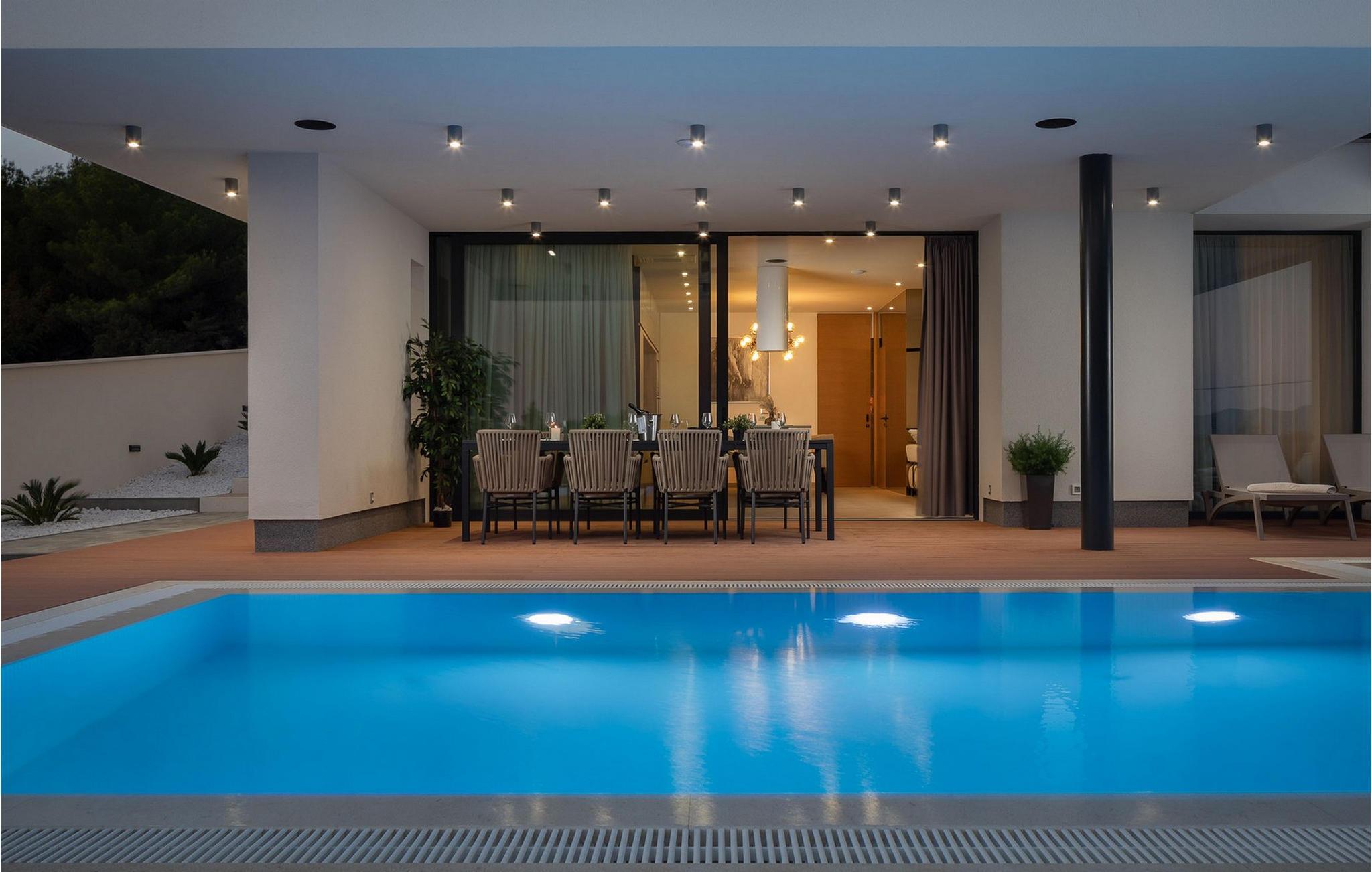 Jeres pool giver jer mulighed for at få en frisk dukkert i dagens varmeste timer og inviterer jer takket være den stemningsfulde belysning også til at svømme om natten. På den øverste terrasse venter et indbydende spabad, hvor I kan se solnedgangen. Lad børnene have det sjovt i den smukt anlagte have med dens frodige grønne områder og nyd uforglemmelige grillaftener i den lille taverna med køkken.
