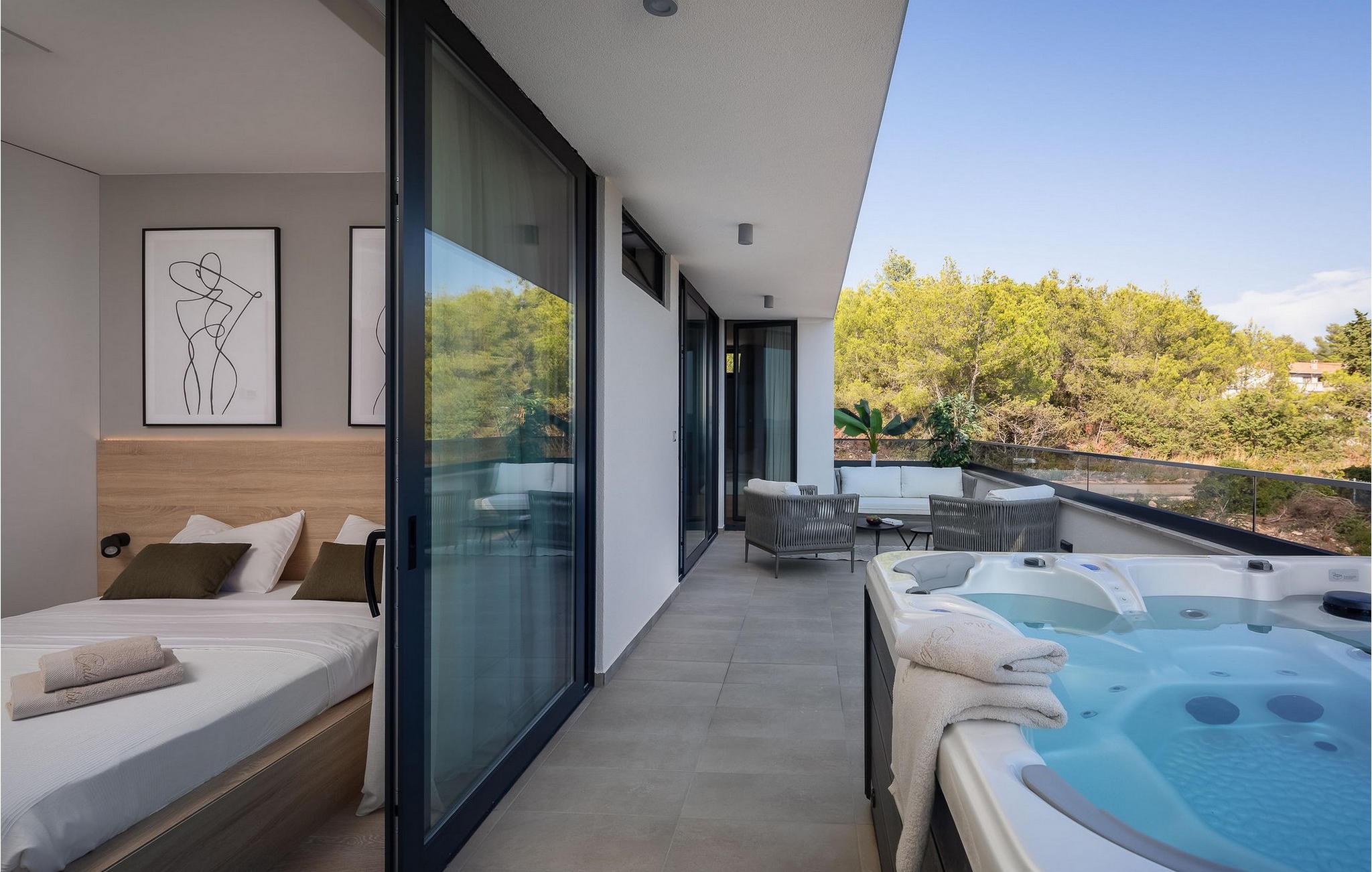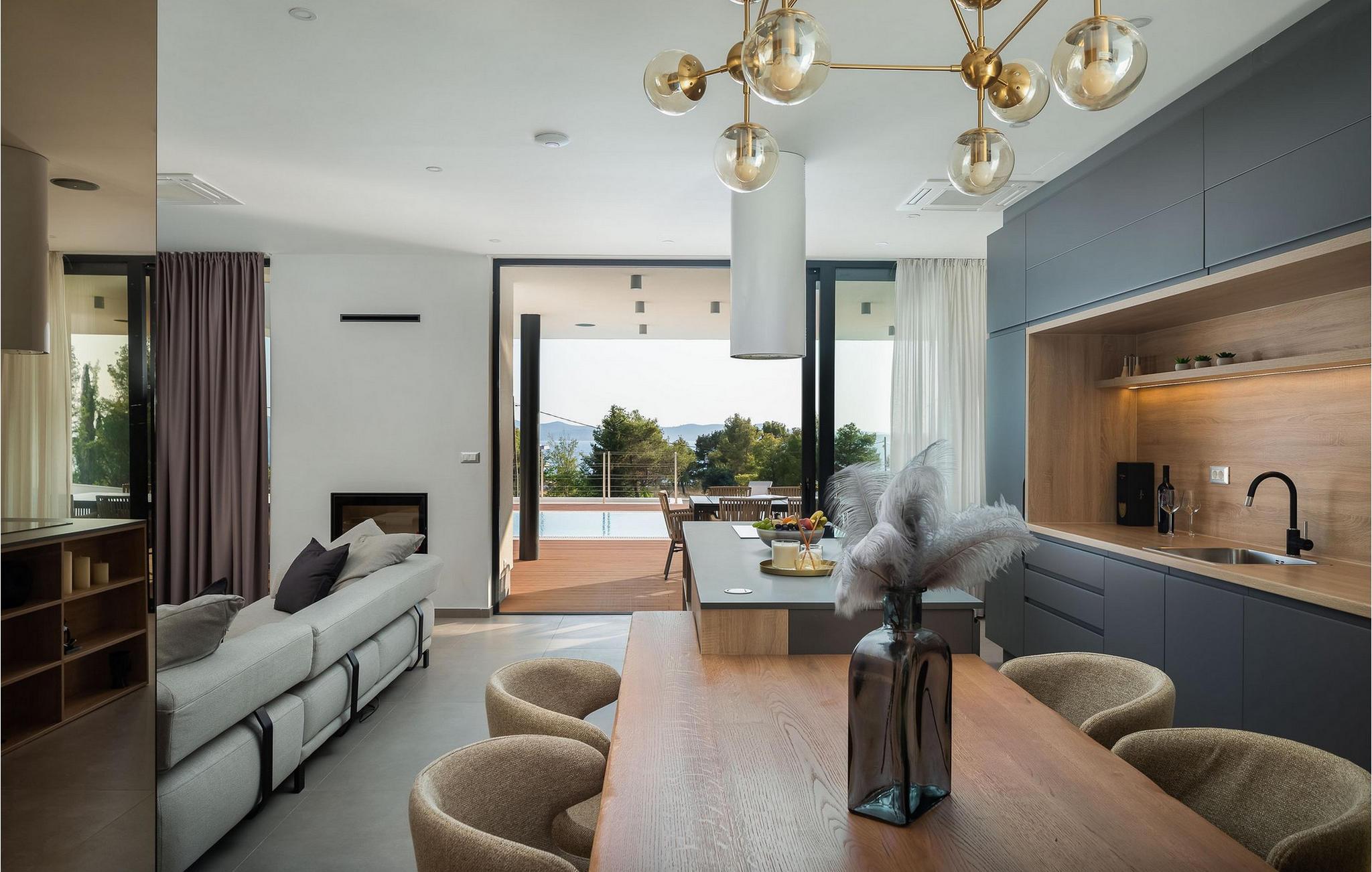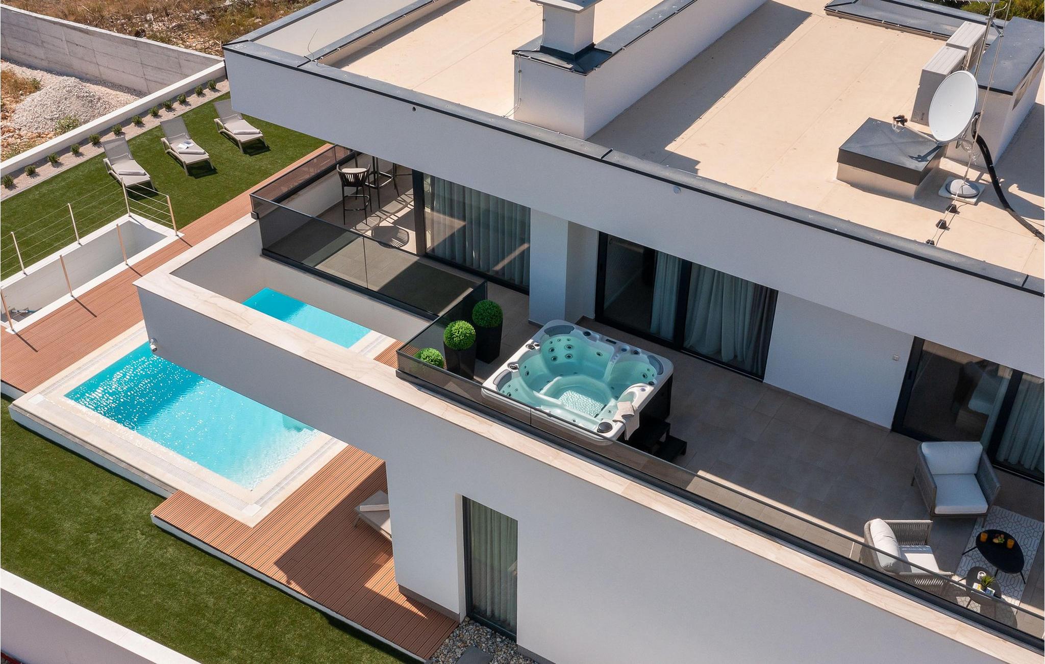 Jeres pool giver jer mulighed for at få en frisk dukkert i dagens varmeste timer og inviterer jer takket være den stemningsfulde belysning også til at svømme om natten. På den øverste terrasse venter et indbydende spabad, hvor I kan se solnedgangen. Lad børnene have det sjovt i den smukt anlagte have med dens frodige grønne områder og nyd uforglemmelige grillaftener i den lille taverna med køkken.