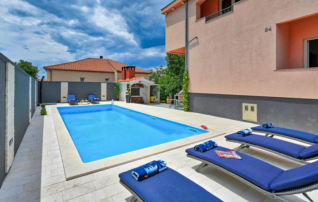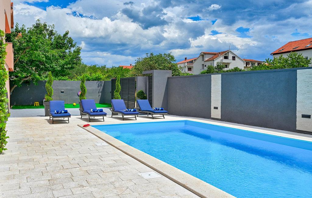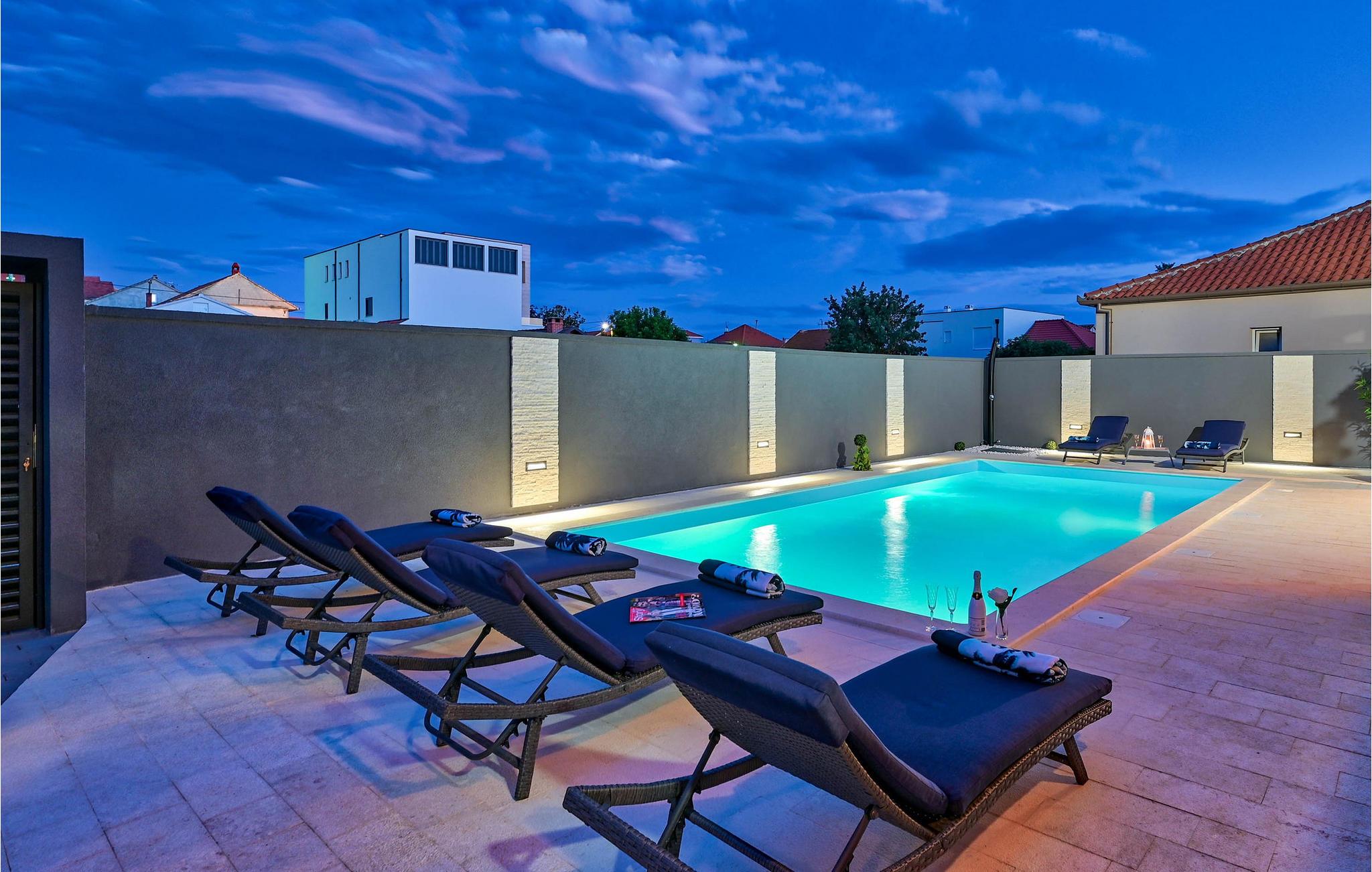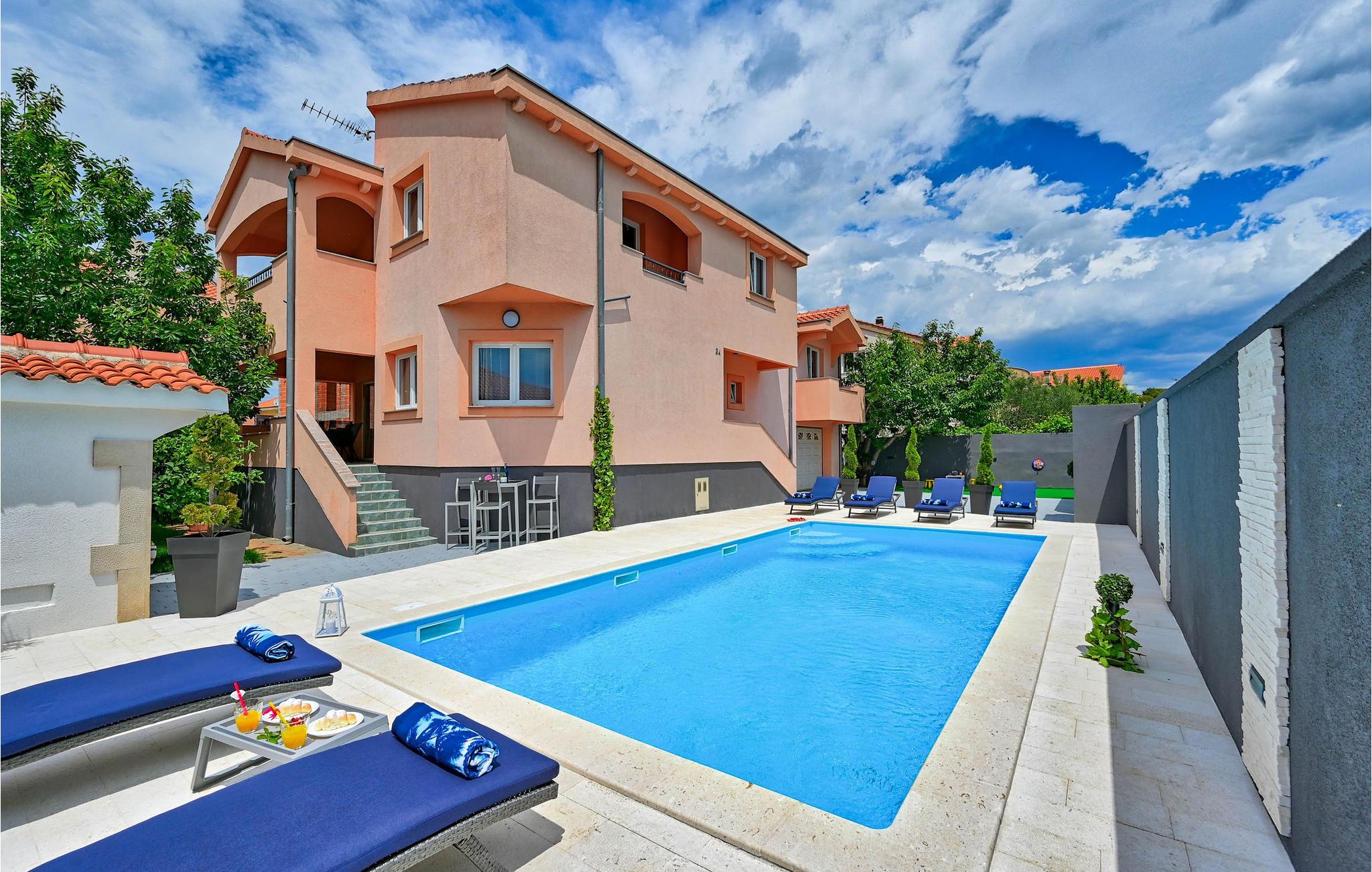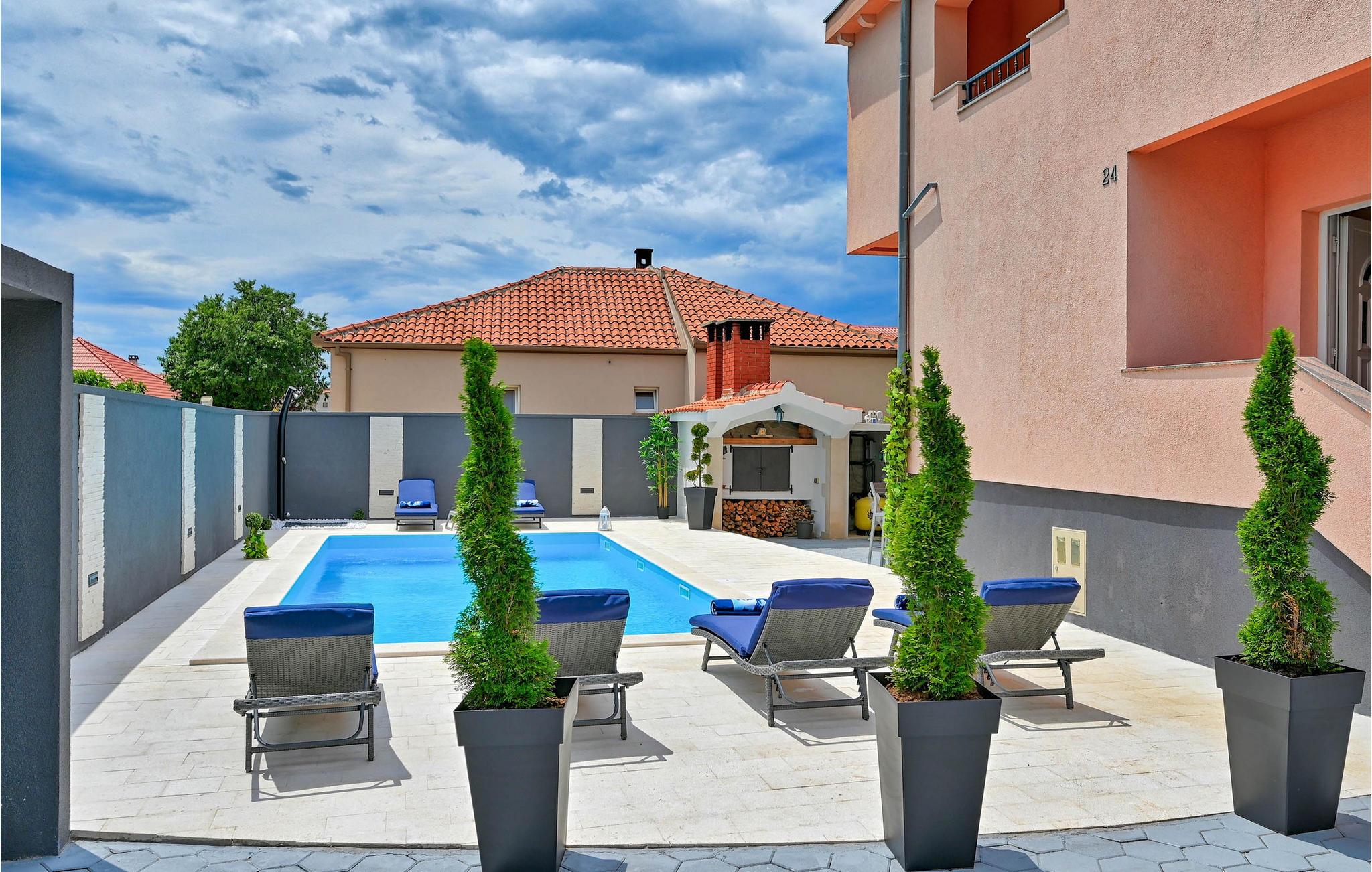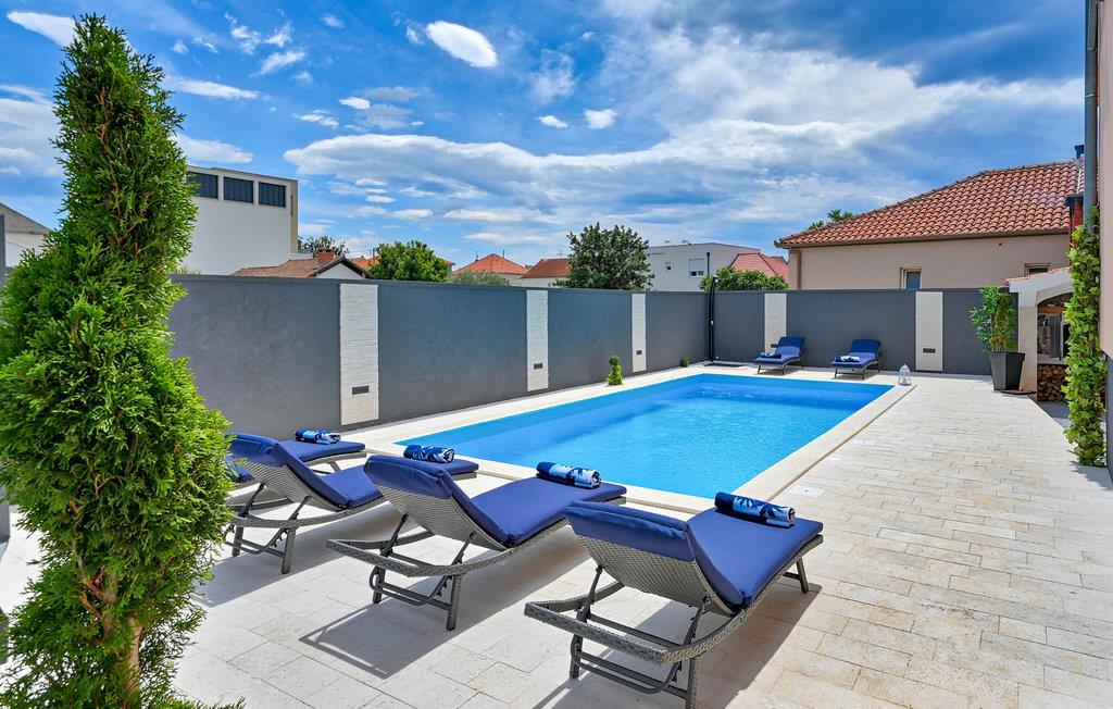 Leder du efter en villa beliggende nær havet, men også med privat pool, er Villa Balera beliggende i Zadar et godt valg. Villaen byder på fem soveværelser og har plads til ti gæster. Villaen er fordelt på tre etager. Tre lyse og komfortable soveværelser med dobbeltsenge er placeret på tredje sal, samt et stort badeværelse med to håndvaske. To soveværelser har balkon. På anden sal er der to rummelige soveværelser med dobbeltseng, der har udgang til altan, hvor man kan slappe af med en god bog. Der er også et badeværelse på samme etage. I villaens stueetage er der en rummelig stue udstyret med et TV, som er forbundet med spisestuen og et fuldt udstyret køkken i et åbent rum koncept. I villaens have kan du slappe af ved den private pool, nyde solen på liggestolene eller slappe af i en hængekøje i skyggen. Du kan nyde en forfriskende drink eller et lækkert måltid på den overdækkede terrasse. Der er også en træ- og kulgrill, hvor du kan prøve dine kulinariske færdigheder. I gårdhaven er der også en legeplads, hvor vores yngre gæster helt sikkert vil hygge sig, og hvor både voksne og børn kan more sig med at spille dart.