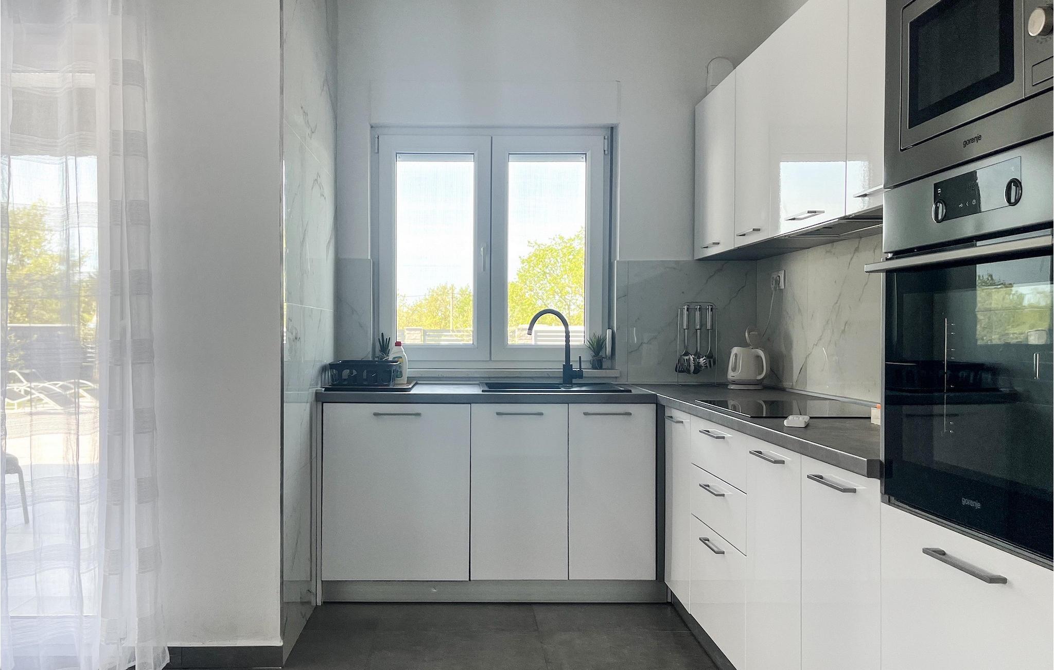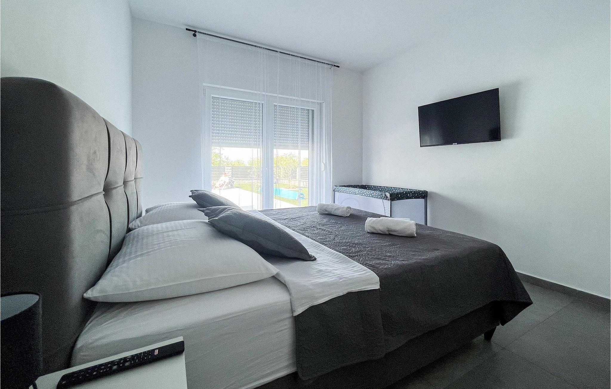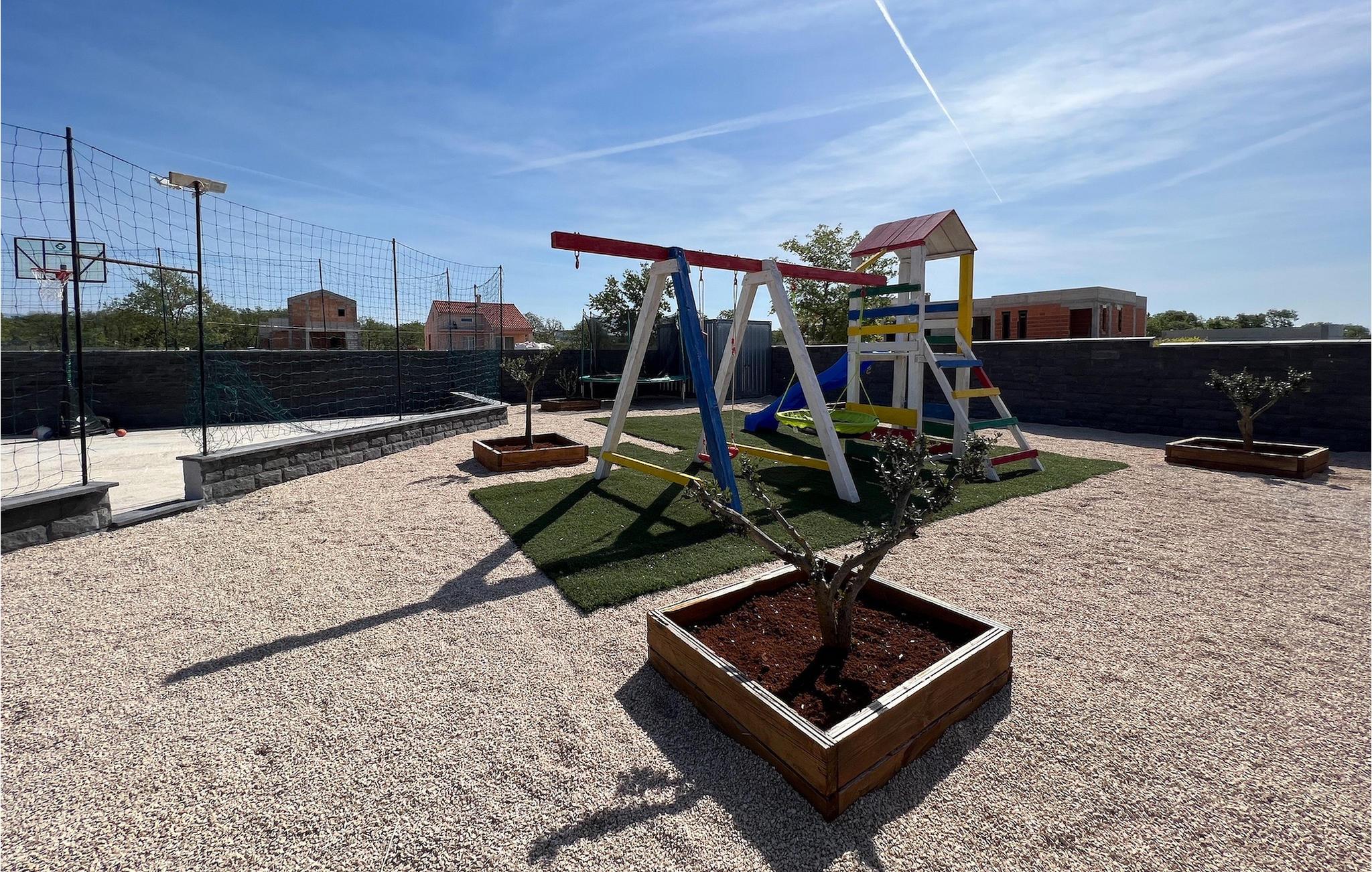 Villa Ela Zadar er en dejlig 4-værelses villa med privat pool til i alt 10 gæster beliggende i hjertet af Dalmatien. Med masser af aktiviteter, et stilfuldt design og en fantastisk beliggenhed er Villa Ela Zadar et fantastisk sted at samle minder i Kroatien. Udendørsområdet vil være højdepunktet for alle, der bor i Villa Ela Zadar med en 50m2 privat og opvarmet pool, liggestole til afslapning i solen, en legeplads, en kulgrill til at lave gode og traditionelle middelhavsretter og mange sportsaktiviteter for børnene. Fra at spille basketball og fodbold, til at lave en familieaften med bordtennis, dart eller pool – det sjove slutter aldrig i Villa Ela Zadar. Der er også en dejlig udendørs spiseplads ved siden af grillen, et hyggeligt loungeområde og masser af plads. Det indvendige område af villaen er meget moderne designet og rummelig. Stueetagen består af en stue, spisestue, et meget veludstyret køkken og et dobbeltværelse med eget badeværelse samt separat toilet. Ved at nå 1. sal i Villa Ela Zadar finder du 3 dobbeltværelser med eget badeværelse, tv og aircondition. Hele ejendommen har også aircondition og Wi-Fi. Med sine faciliteter, fantastiske beliggenhed og charme er Villa Ela Zadar et fantastisk sted for din familie og venner at tilbringe en mindeværdig ferie i Kroatien, så tøv ikke med at booke Villa Ela Zadar! Villa Ela Zadar ligger kun en kort køretur fra et af de mest populære turist-hotspots i Dalmatien - den gamle og fantastiske by Zadar. Zadar er mest berømt for sine havorganer, hilsen til solen, kirken St. Donatus og betagende strande. The Sea Organs er en musikalsk installation, der laver dejlige lyde fra havets bølger og et besøg i Hilsen til Solen, mens solen går ned, vil forklare dig, hvorfor Alfred Hitchcock citerede, at "Zadar har de smukkeste solnedgange i verden, smukkere end den i Key West i Florida". Zadar og Dalmatien er også berømte for deres naturlige skønheder i baglandet, så glem ikke at besøge nationalparken Plitvice på vej til Zadar eller nationalparken Paklenica. Gastronomirejsen kan også godt opdages i Zadar. Byen og selve Dalmatien er kendt for deres friske fisk og skaldyr, førsteklasses olivenolie, Dalmatinski pršut og fantastiske vin. Så tøv ikke med at tage en tur til Dalmatien og Zadar for at opleve den ægte dalmatiske livsstil. Temperaturen i den opvarmede swimmingpool er afhængig af eksterne faktorer, herunder vejrforhold, og som sådan kan temperaturen på vandet ikke garanteres.