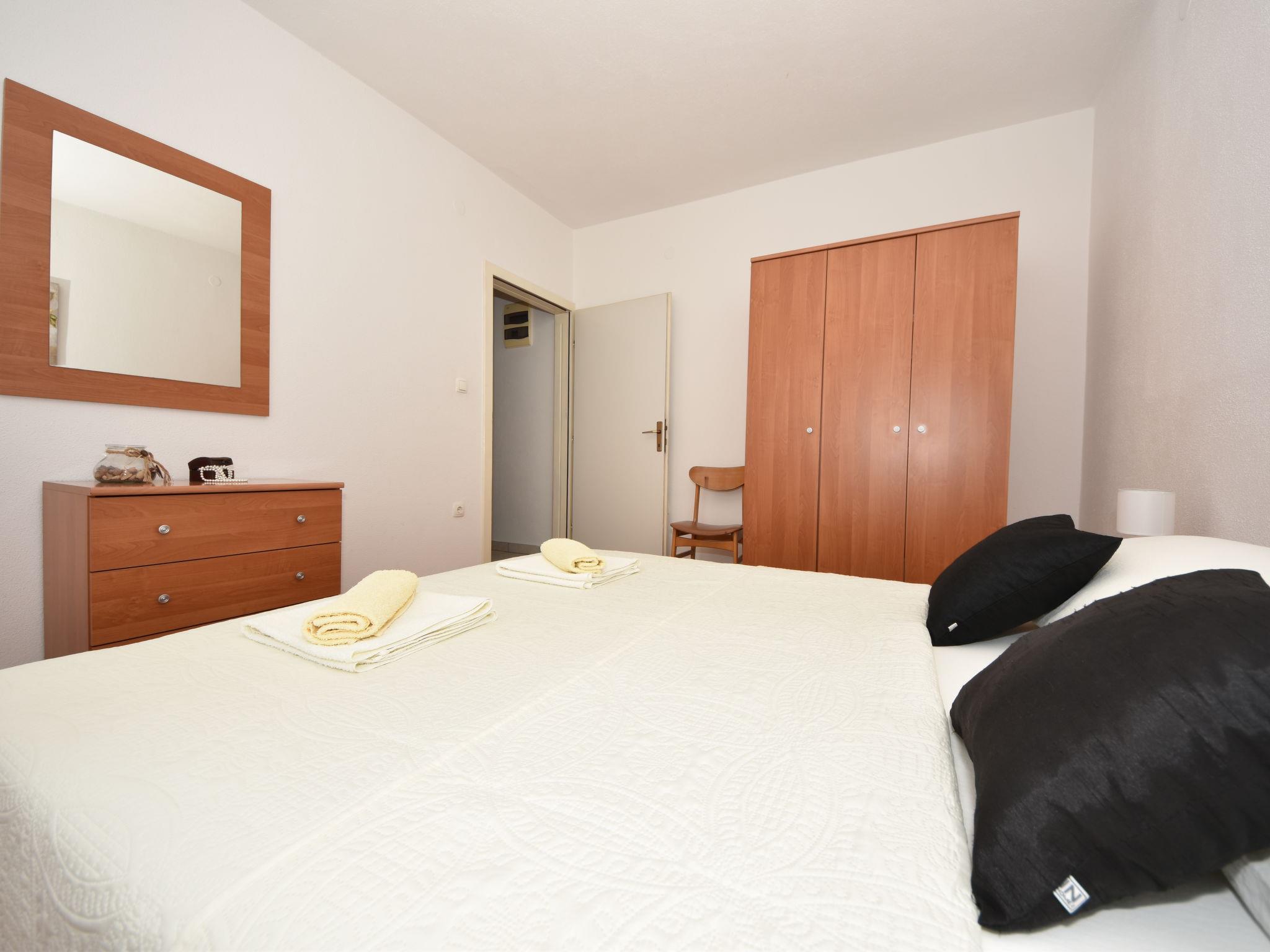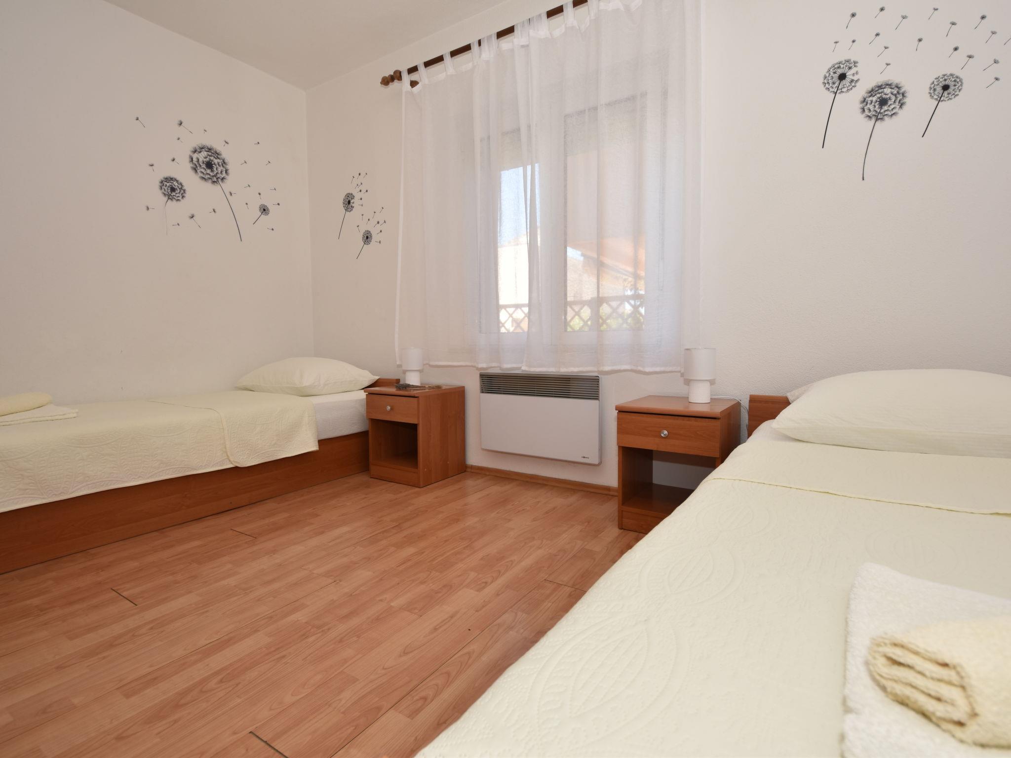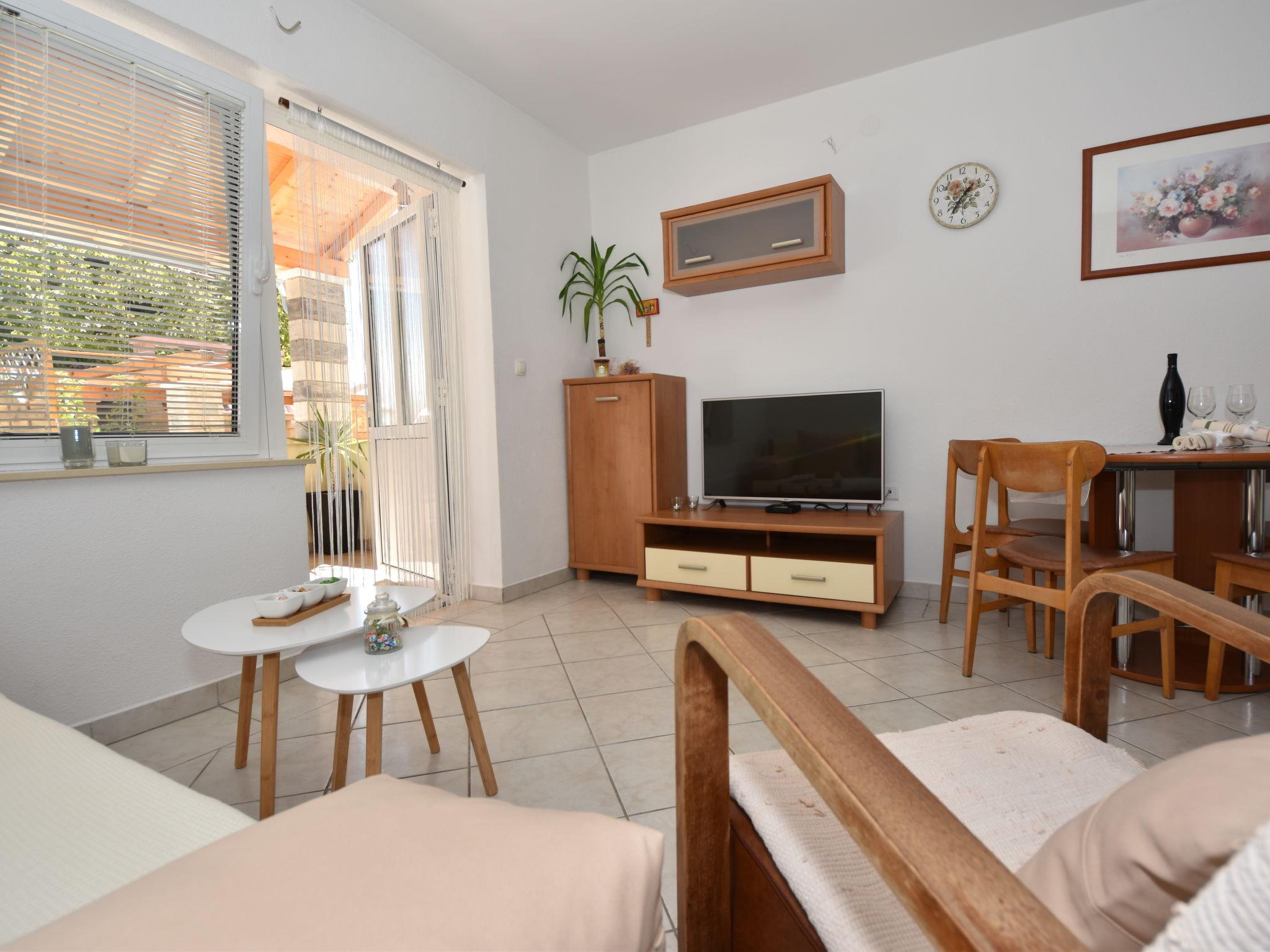 "Katarina", 3-room apartment 60 m2, on the ground floor, south facing position. Living/dining room 25 m2 with TV and air conditioning. Exit to the terrace. 1 room with 1 double bed (2 x 80 cm, length 200 cm). 1 room with 2 beds (90 cm, length 200 cm). Open kitchen (4 hot plates, oven, microwave, freezer, electric coffee machine). Shower/WC. Air-conditioning (extra). No heating option. Terrace 5 m2, roofed. Terrace furniture, barbecue (portable). Facilities: washing machine, iron, hair dryer. Internet (WiFi, free). Maximum 1 pet/ dog allowed.