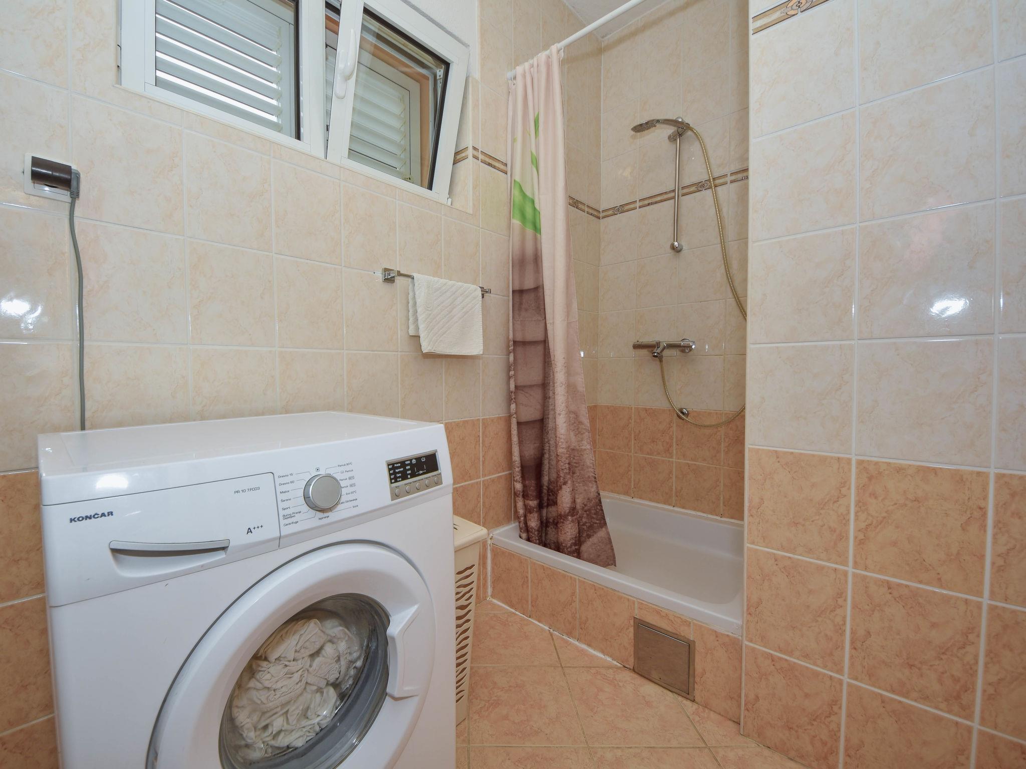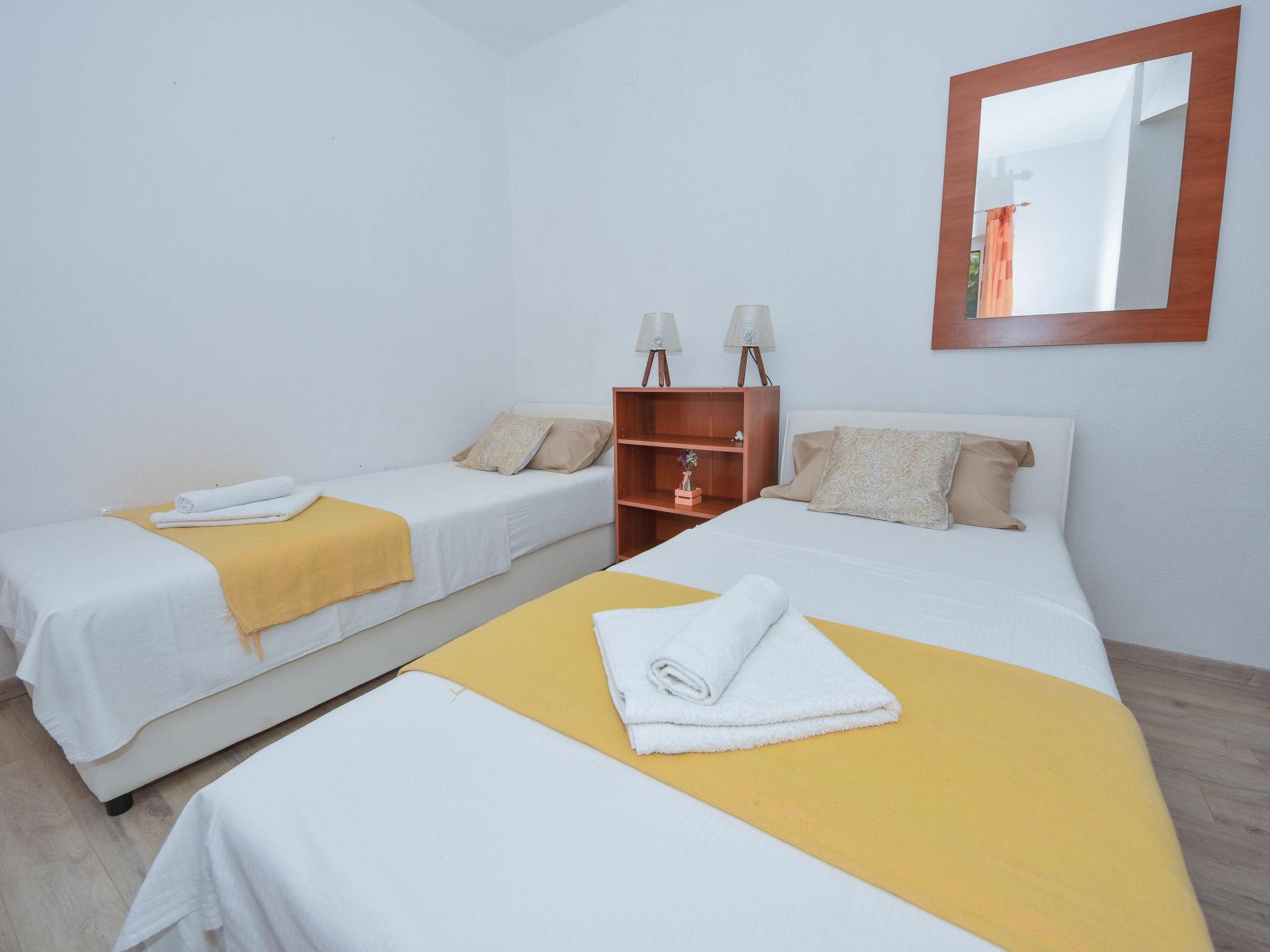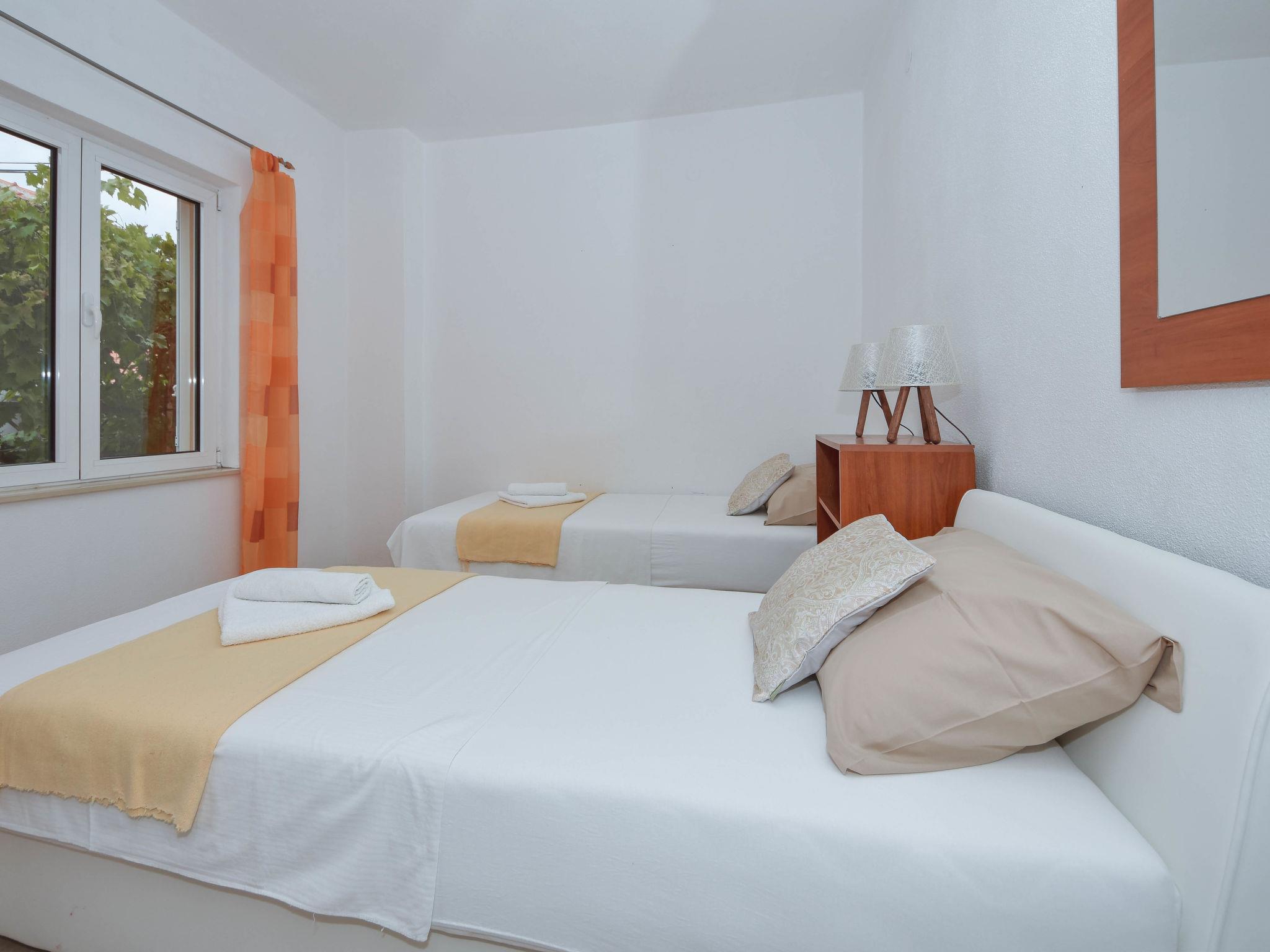 "Mia", 3-room apartment 60 m2, on the ground floor, south facing position. Living/dining room 25 m2 with TV and air conditioning. Exit to the terrace. 1 room with 1 double bed (2 x 80 cm, length 200 cm). 1 room with 2 beds (90 cm, length 200 cm). Open kitchen (4 hot plates, oven, microwave, freezer, electric coffee machine). Shower/WC. Air-conditioning (extra). No heating option. Terrace 5 m2, roofed. Terrace furniture, barbecue (portable). Facilities: washing machine, iron, hair dryer. Internet (WiFi, free). Maximum 1 pet/ dog allowed. UP/I-335-03/20-01/3430